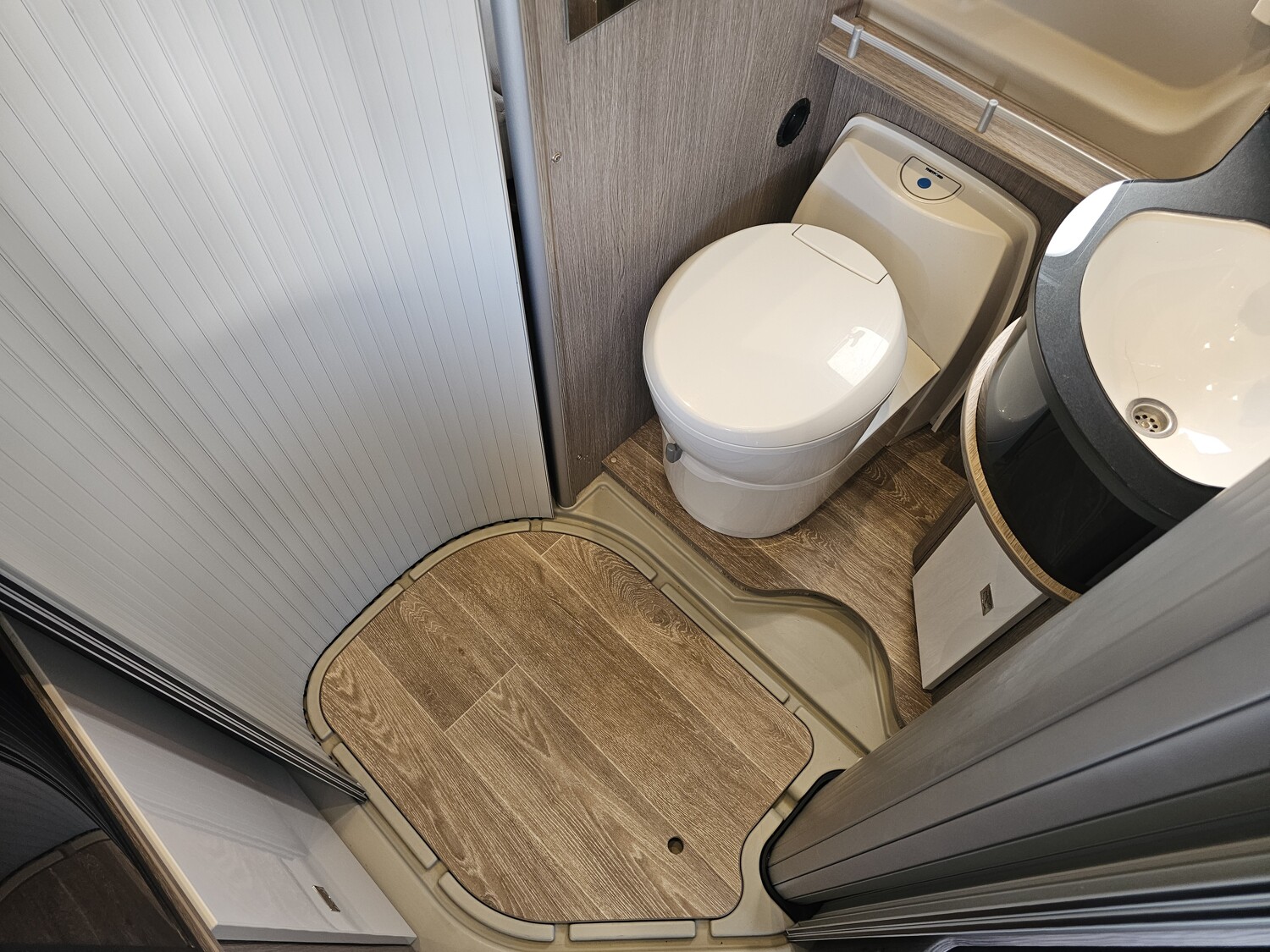 - Raumbad mit einer Duschekabine, einer Thetford Cassettentoilette, einem Waschbecken, einem Seitenfenster, einem Spiegelschrank und Staufächer