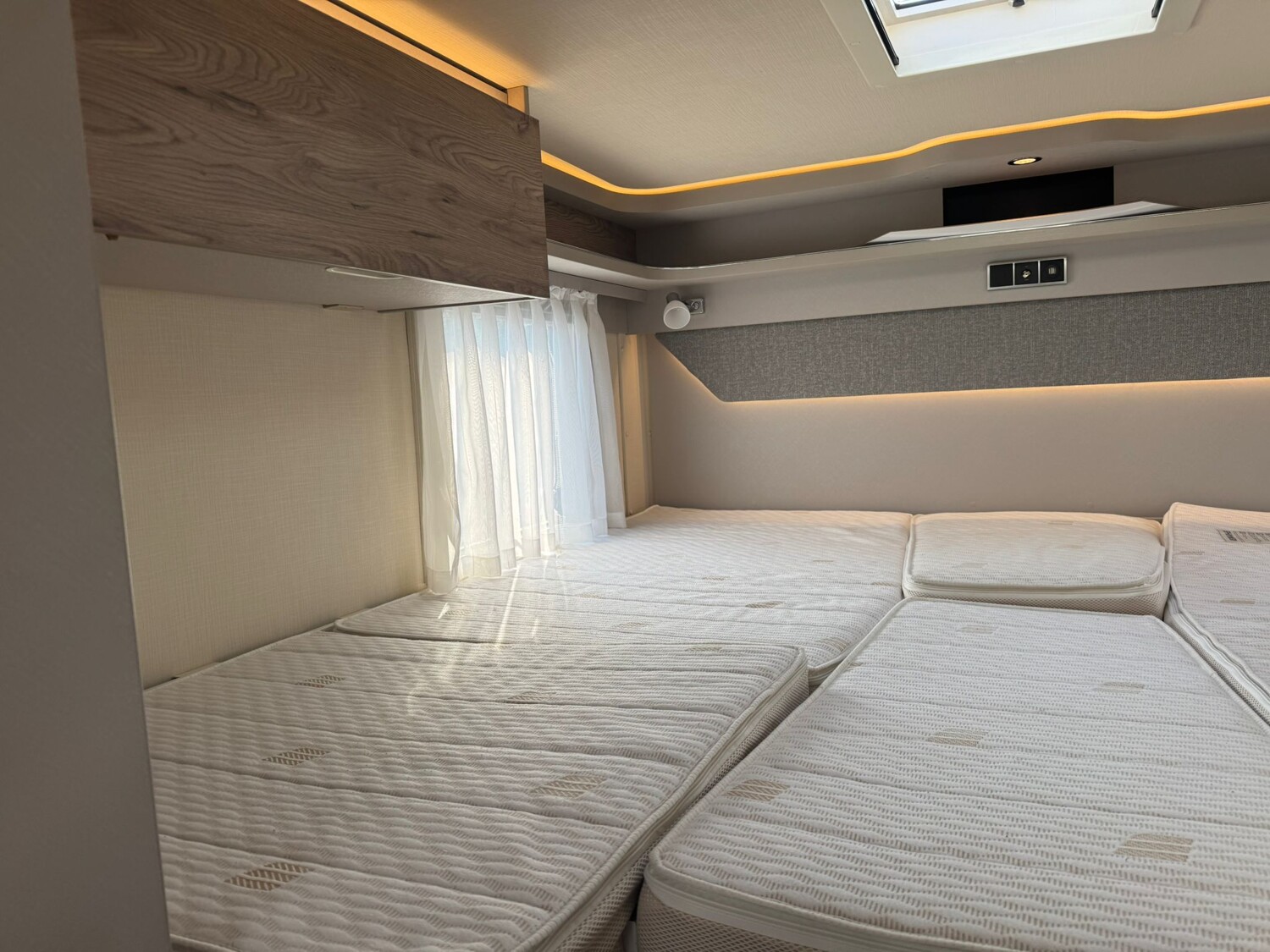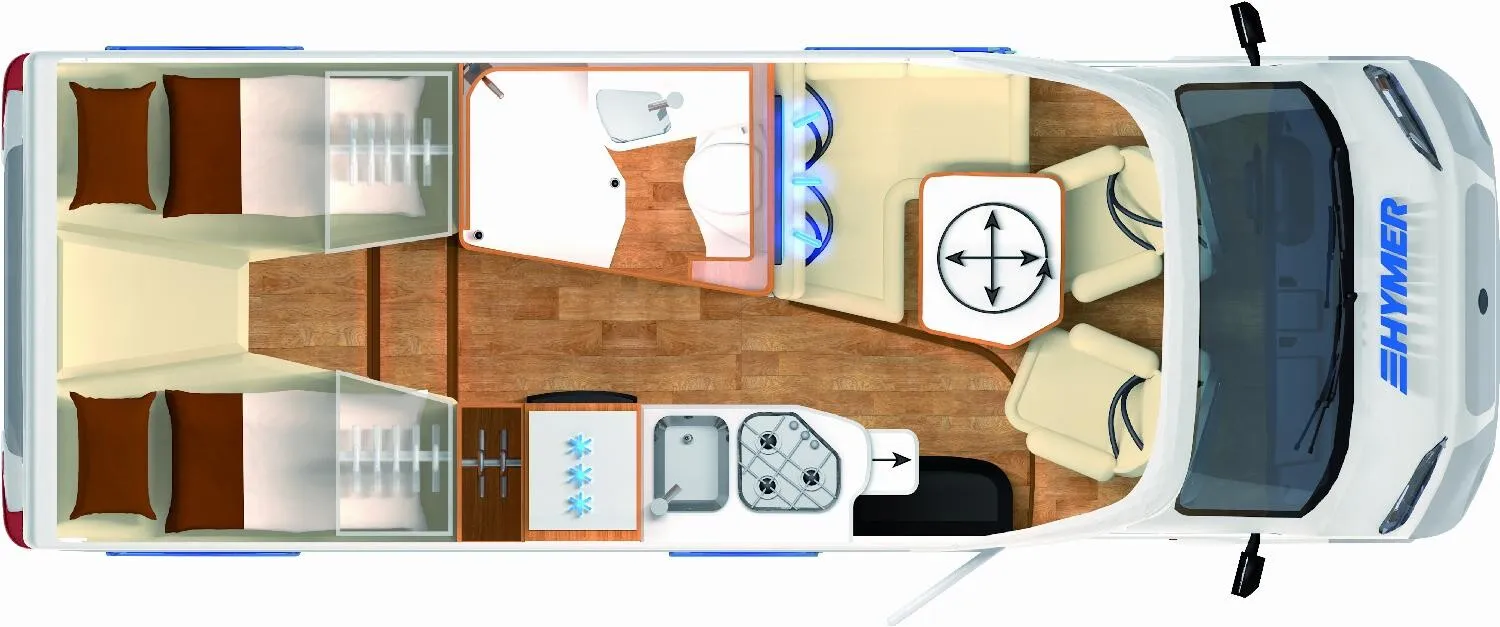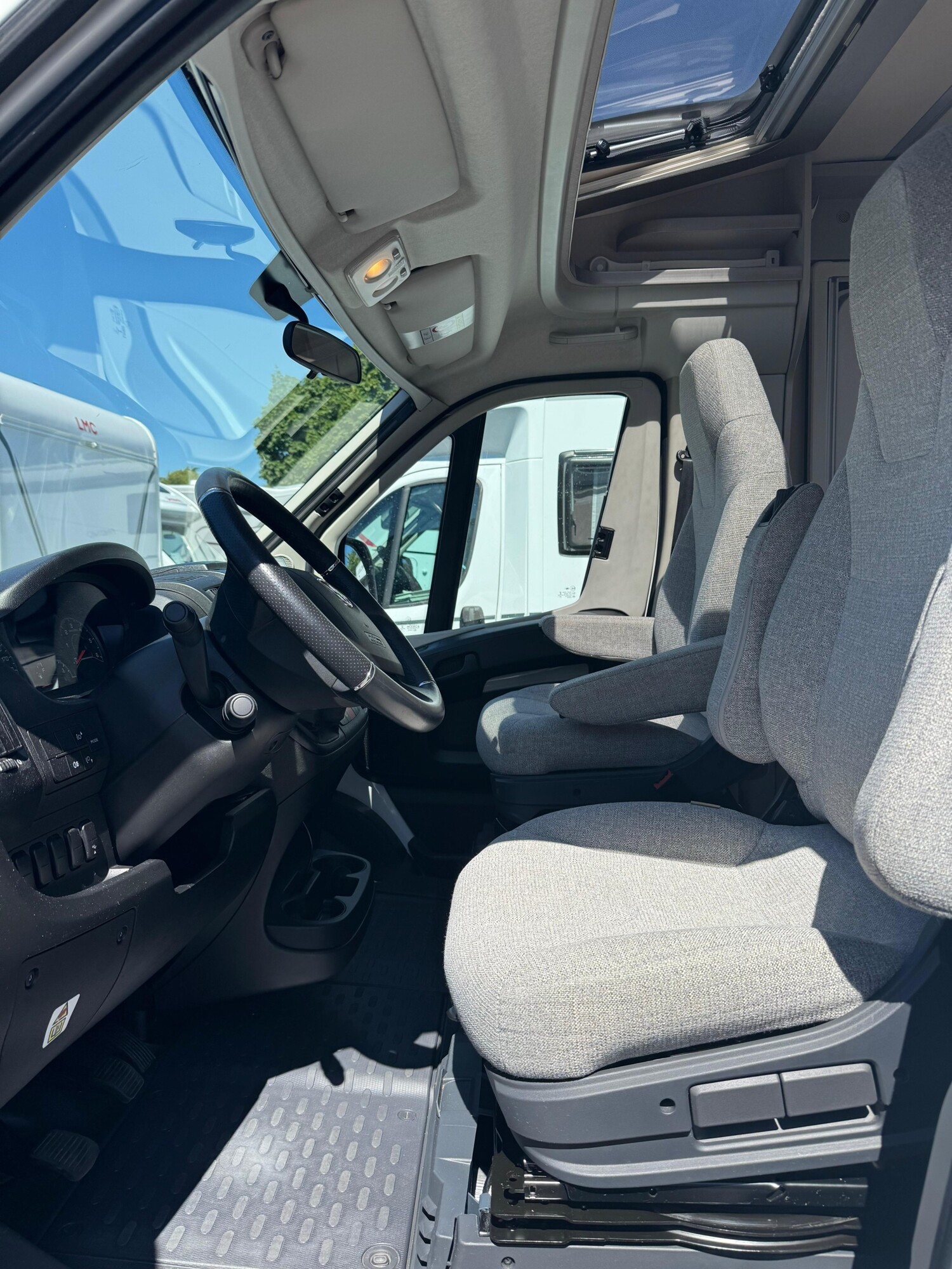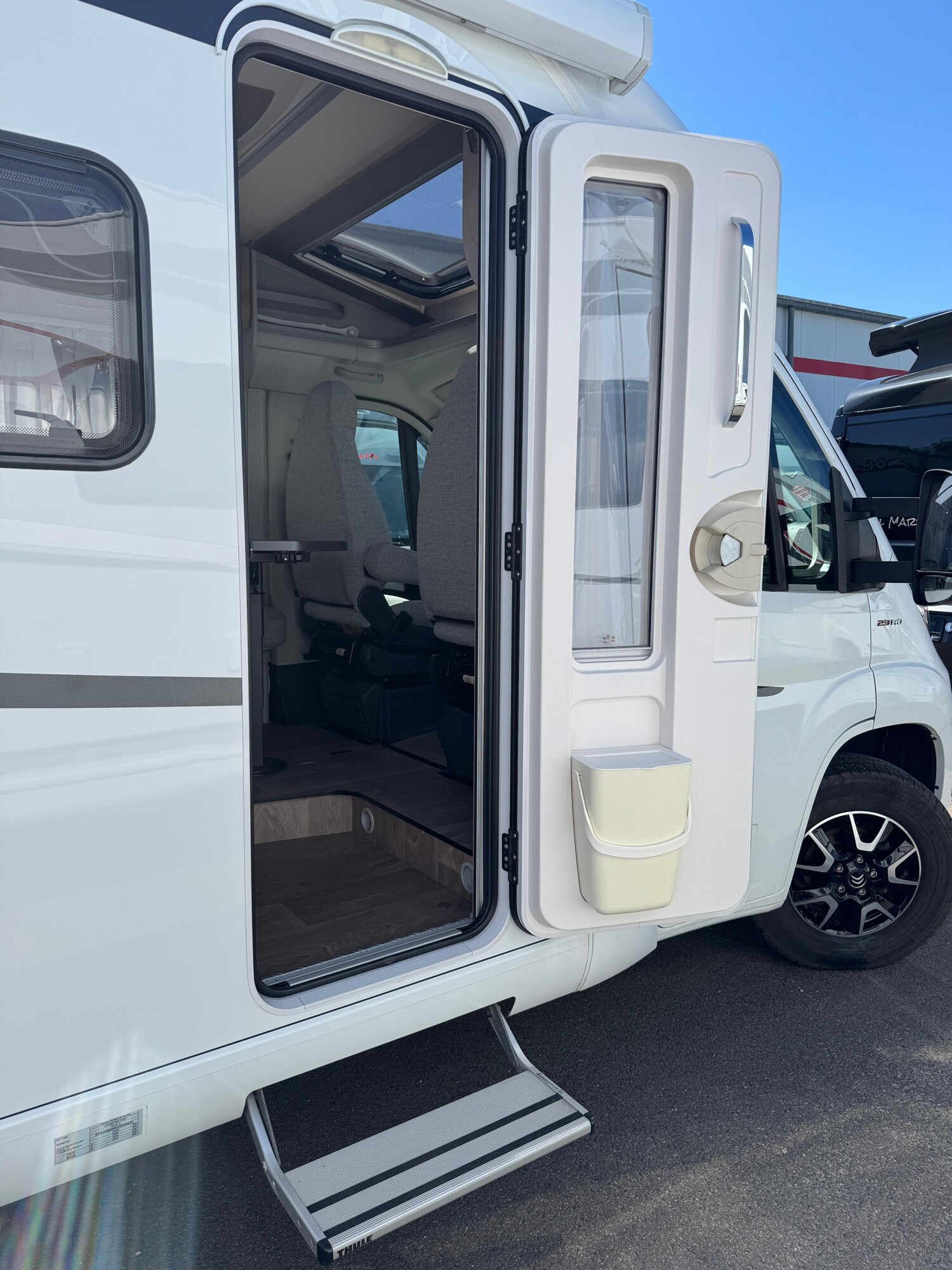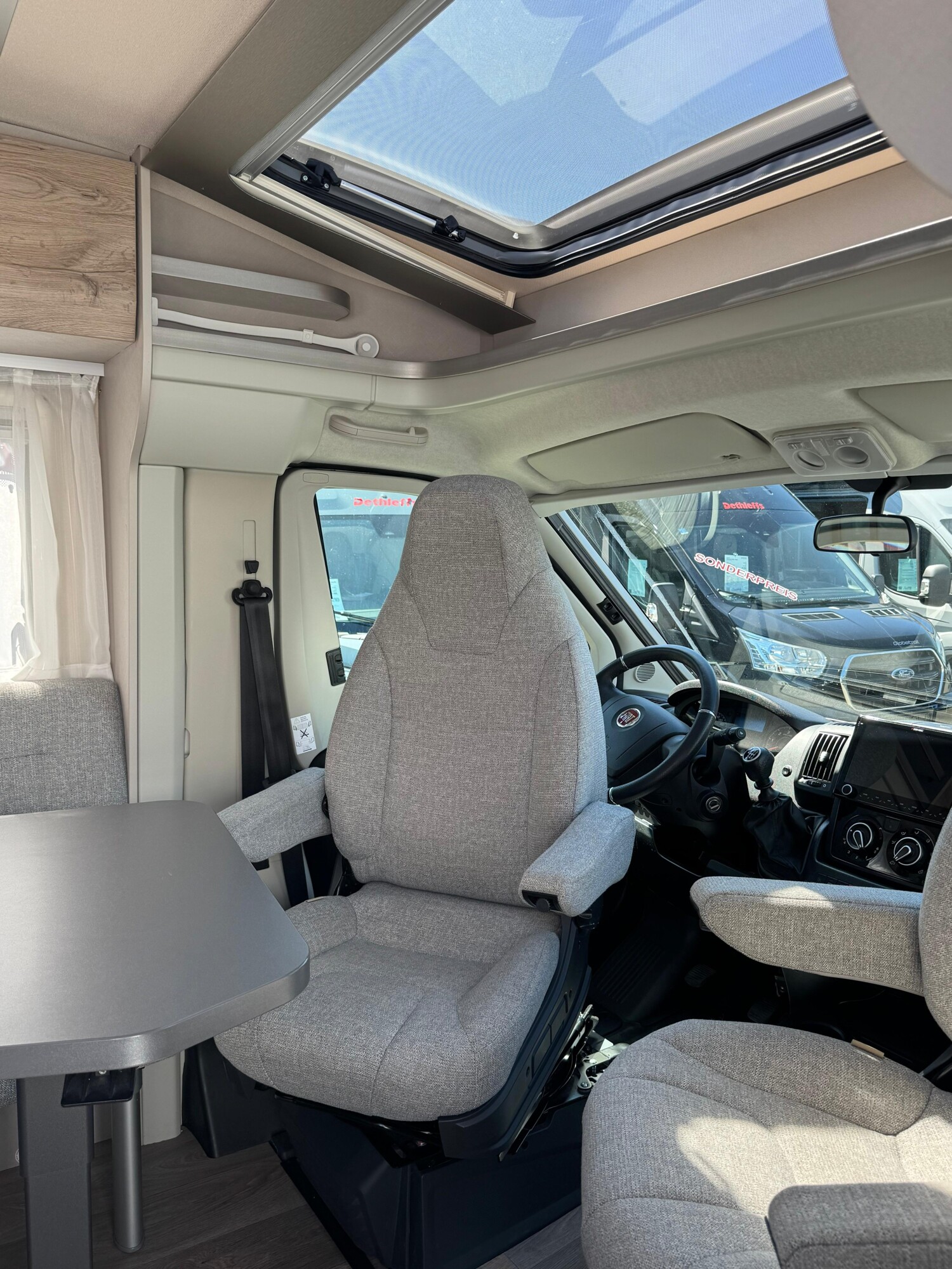 - Komfort-Plus-Paket 2: Fliegenschutzrollo an der Einganstür, Panoramadach über Fahrerhaus, manuell ausstellbar, Fenster mit Verdunklungsrollo und integriertem Mülleimer in der Eingangstür, Faltverdunklung für das Fahrerhaus, 150 l Kühlschrank