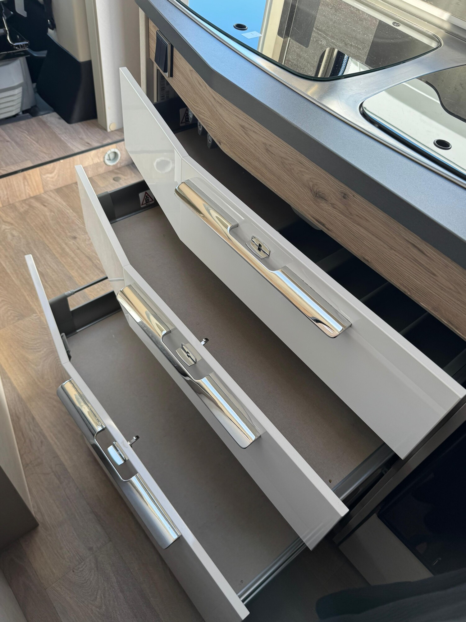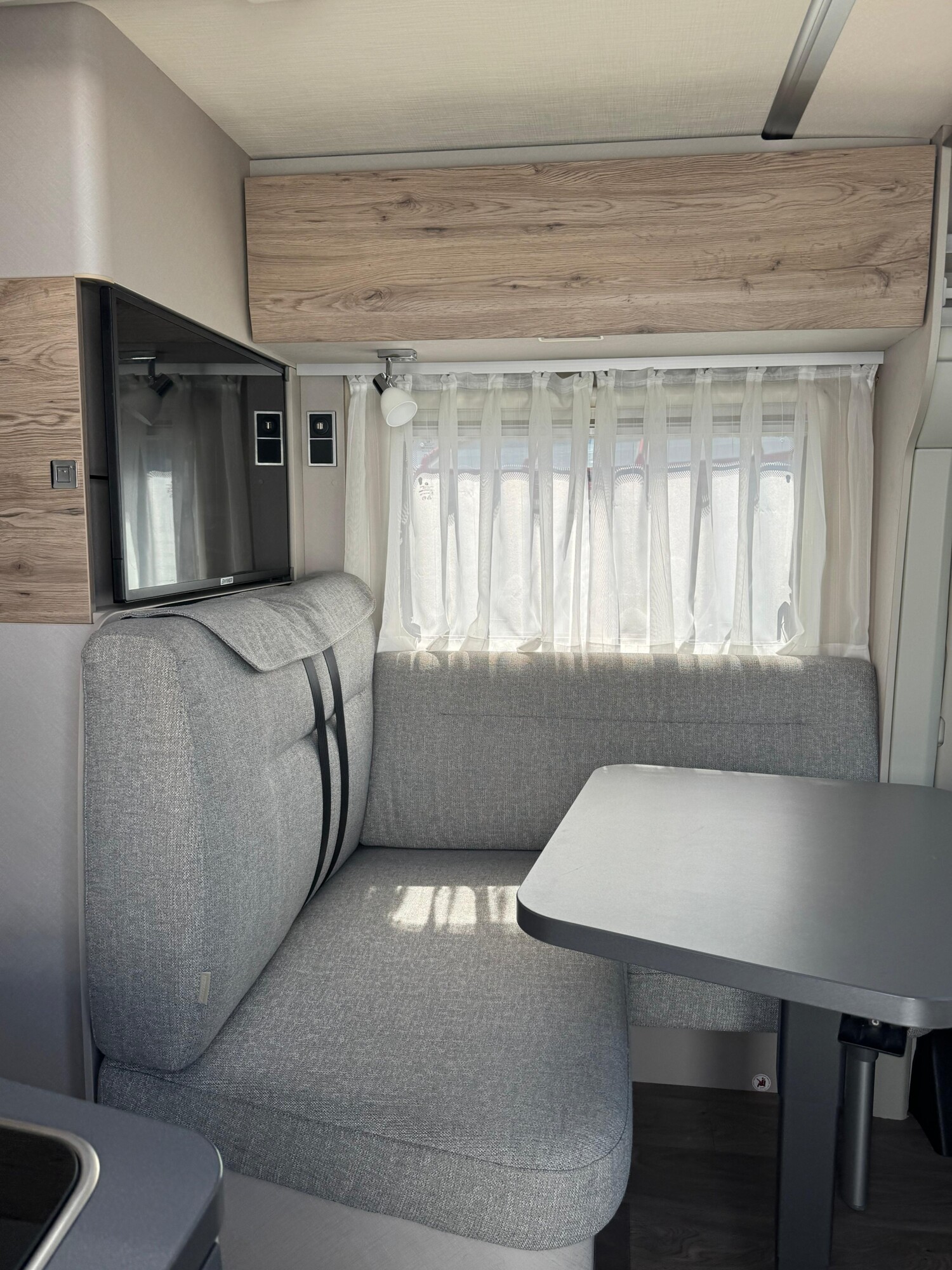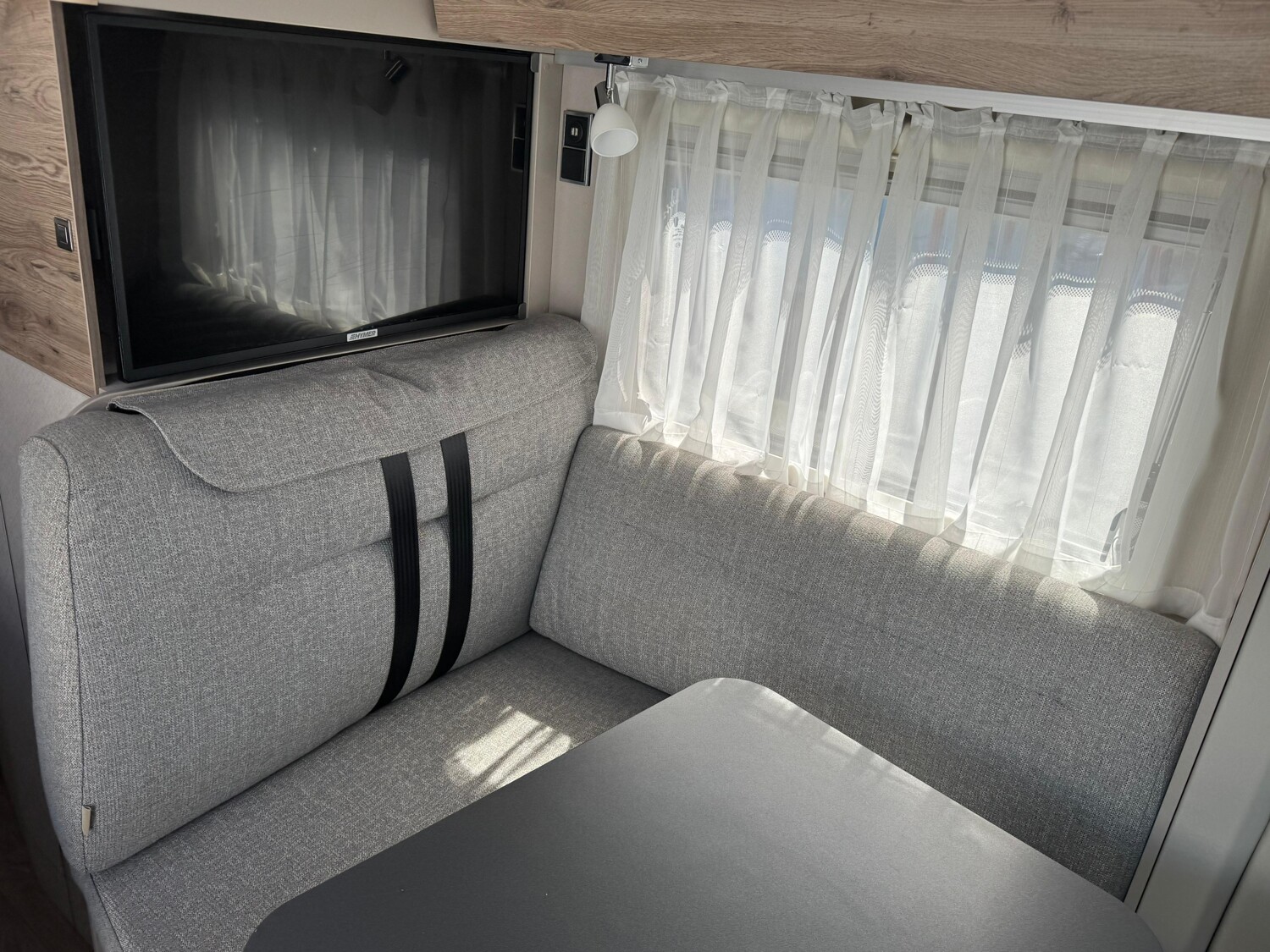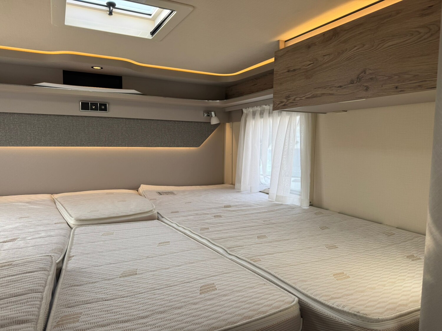 - Komfort-Plus-Paket 2: Fliegenschutzrollo an der Einganstür, Panoramadach über Fahrerhaus, manuell ausstellbar, Fenster mit Verdunklungsrollo und integriertem Mülleimer in der Eingangstür, Faltverdunklung für das Fahrerhaus, 150 l Kühlschrank