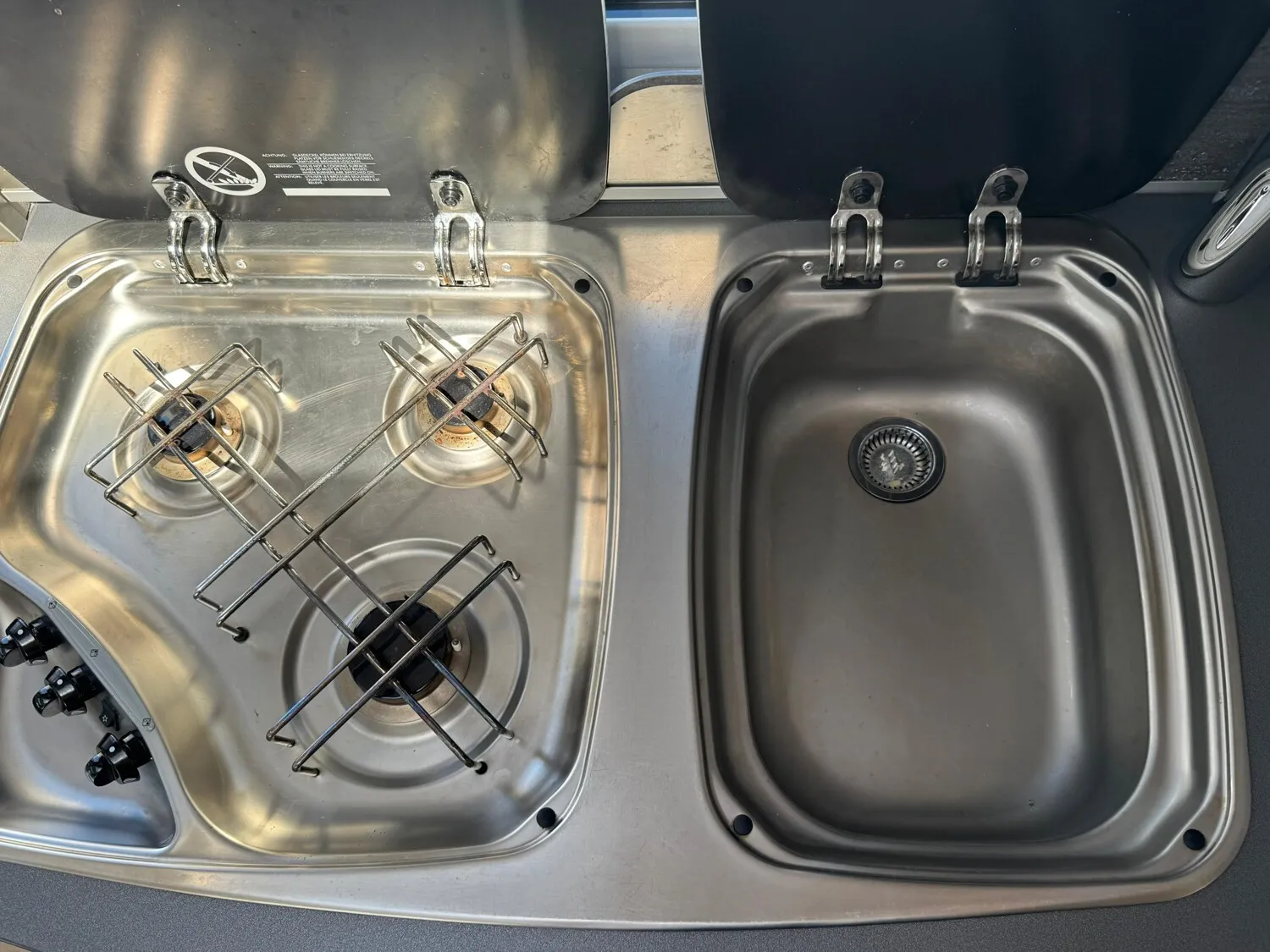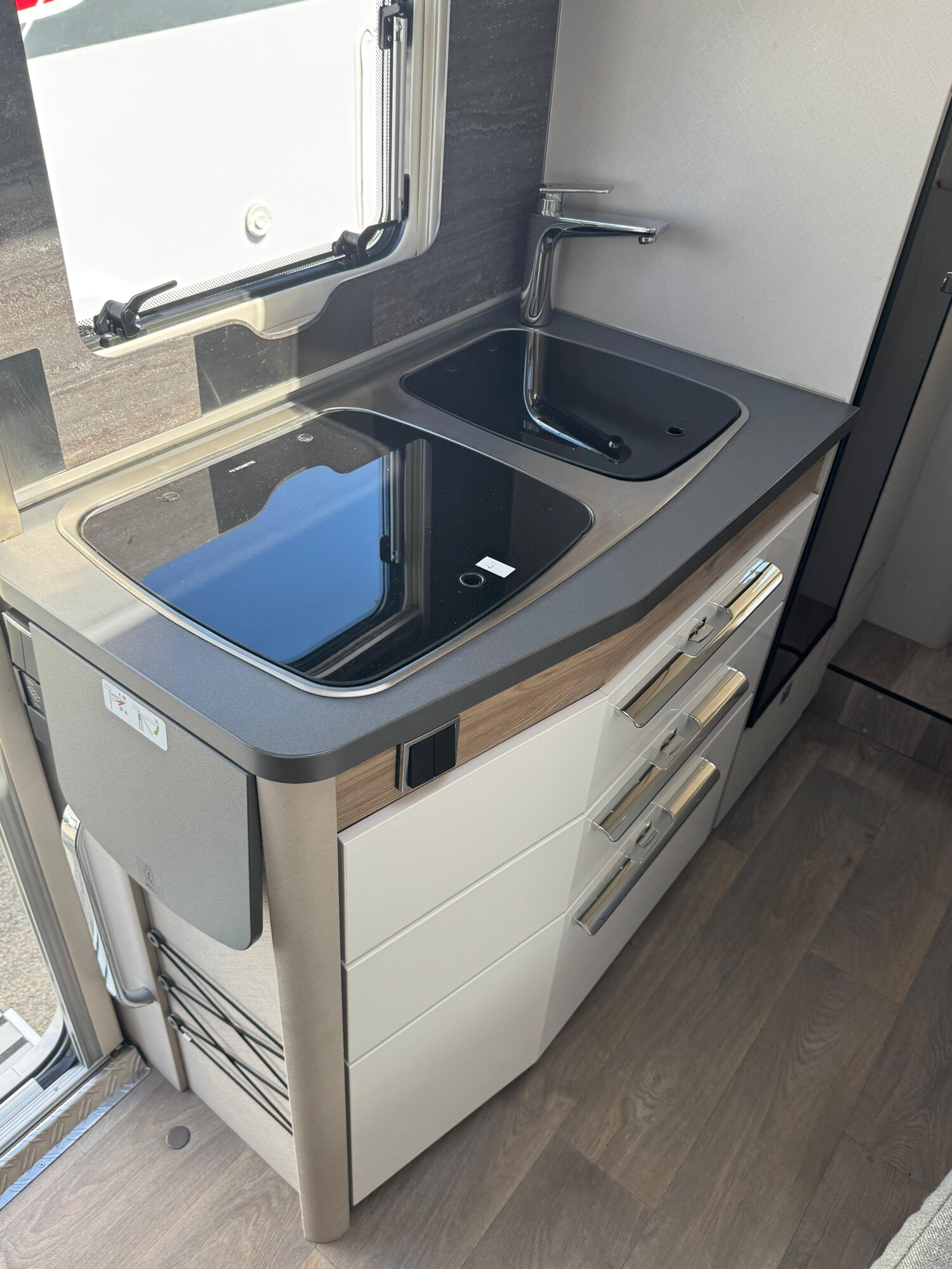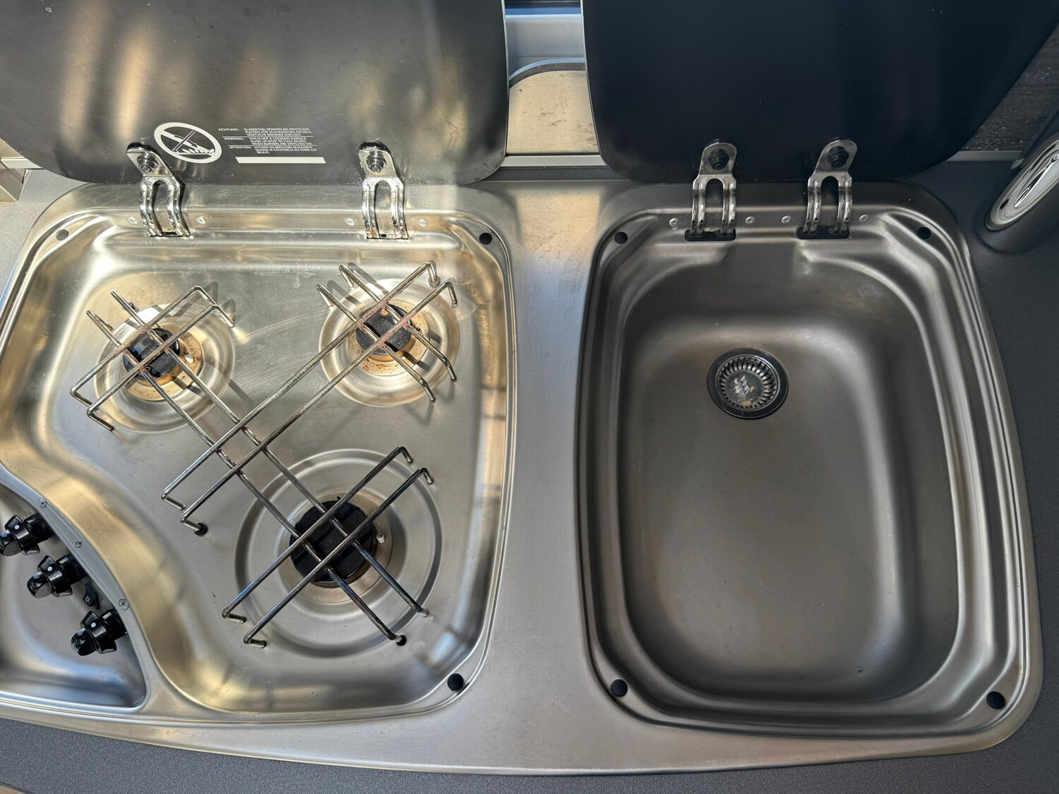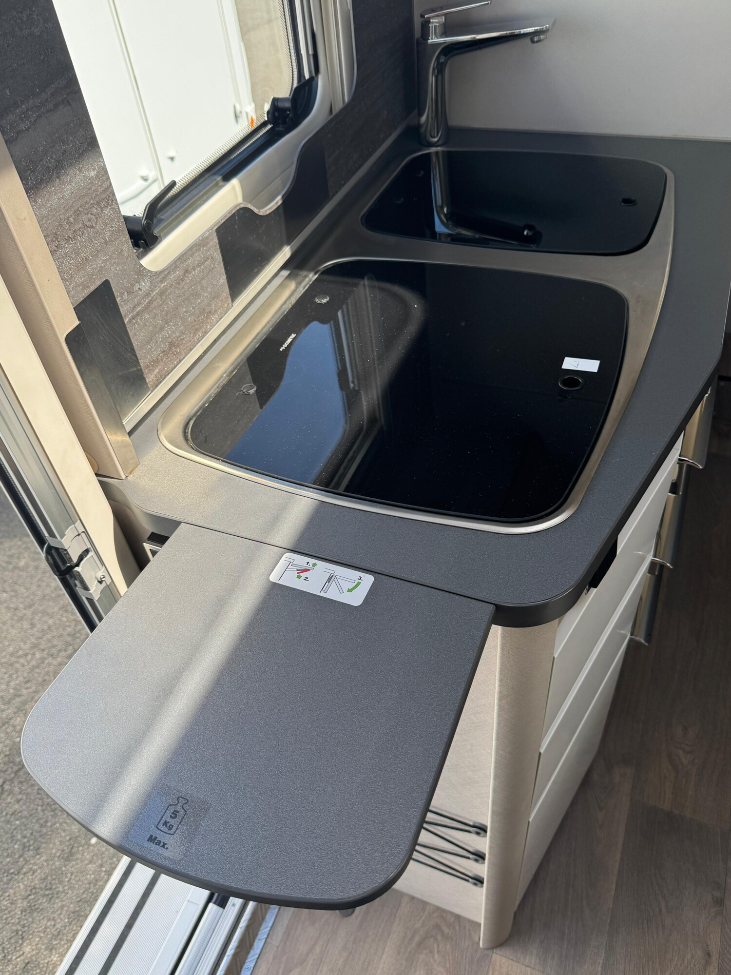 - Küchenzeile mit einer erweiterbaren Arbeitsplatte, einem 3-Flammenkocher und einer Spüle inkl. Glasabdeckung, Stauschränken und Schubladen