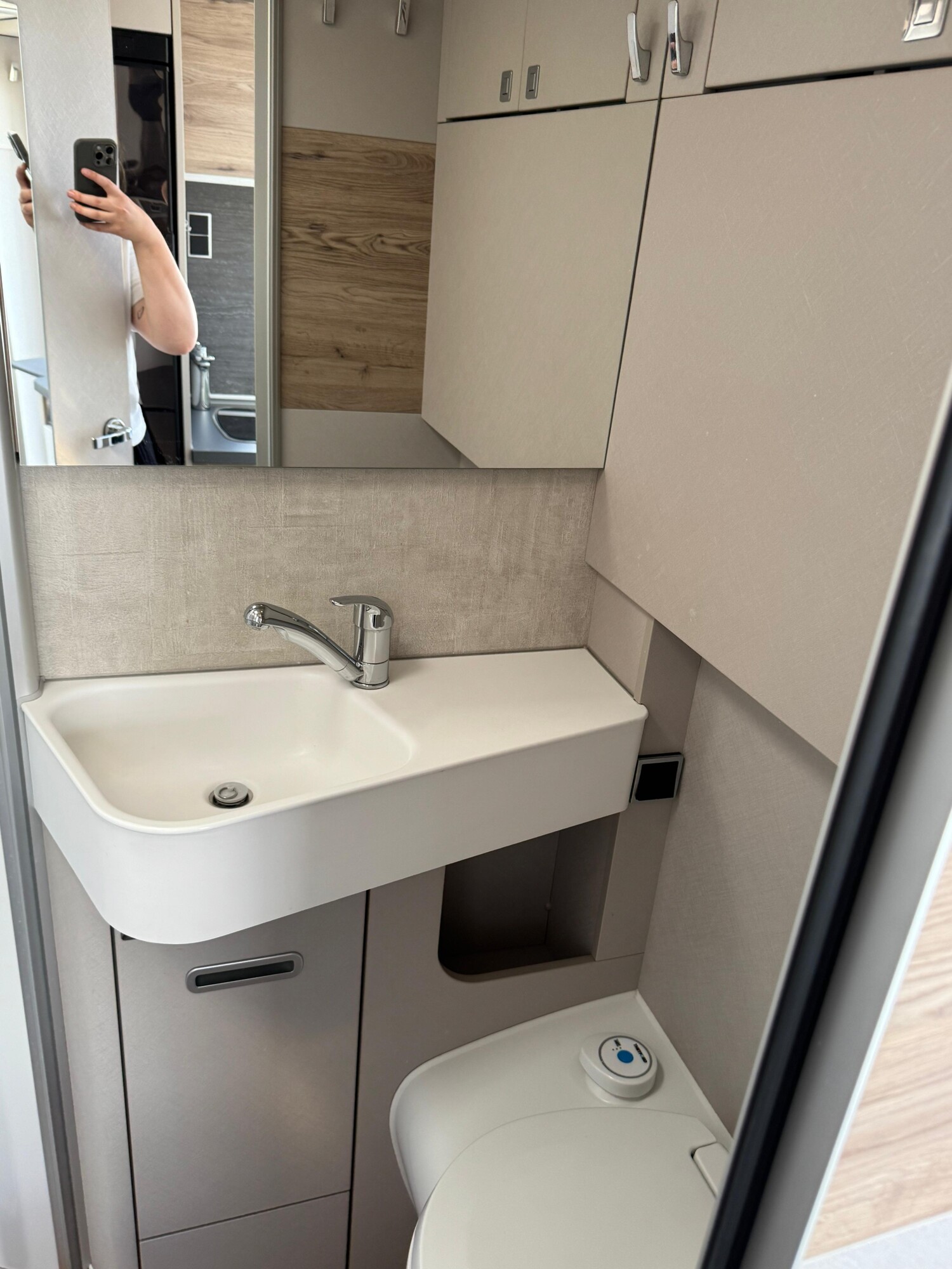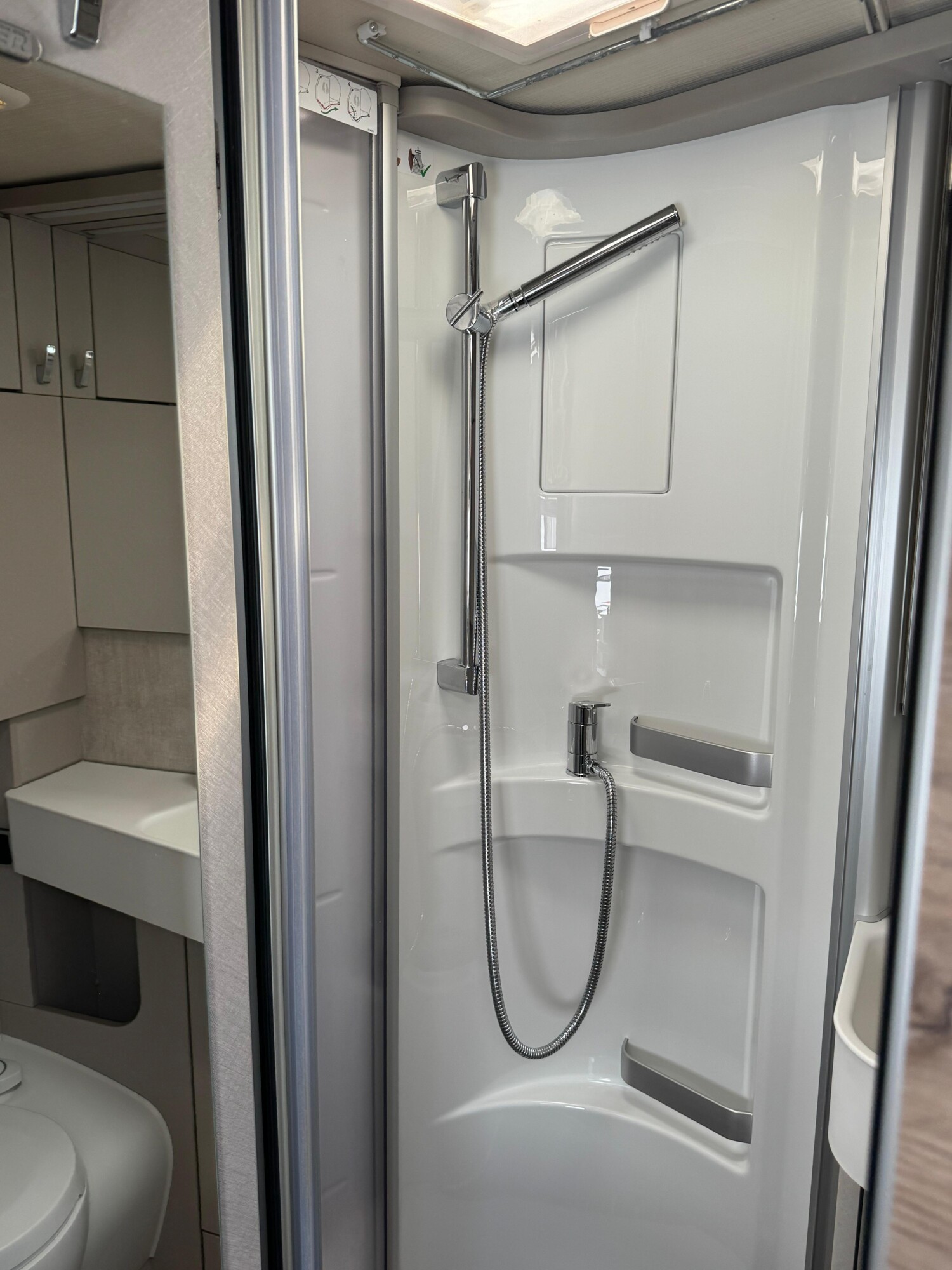 - Nasszelle mit einer Dusche inkl. Holzrost, einer Thetford Toilettencassette und einem Waschbecken mit einem Spiegel und Stauschränken
