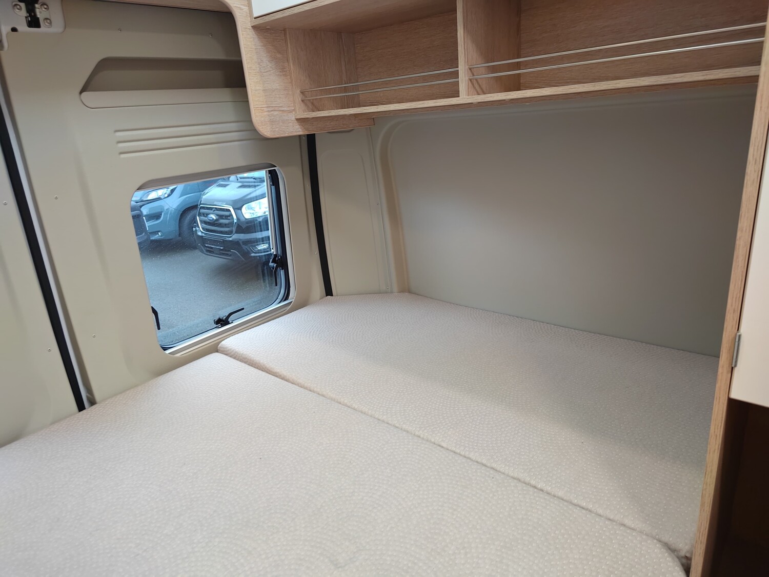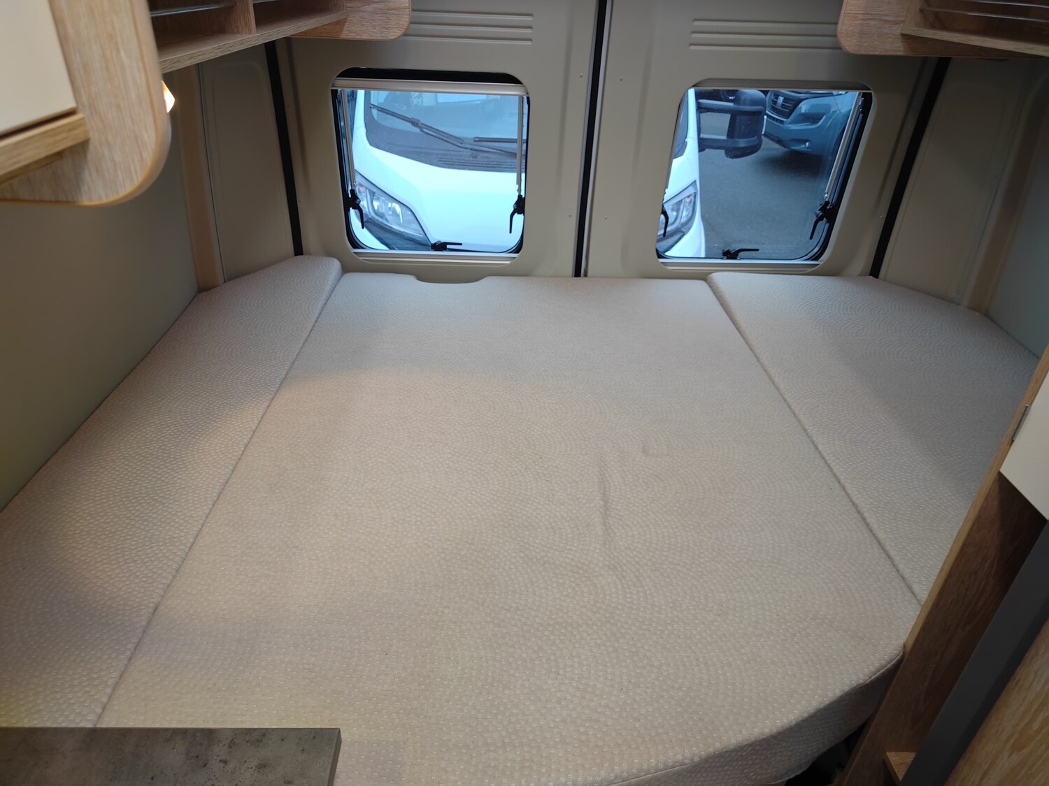 - Doppelbett im Heck mit Stauschränken darüber und Stauraum darunter
