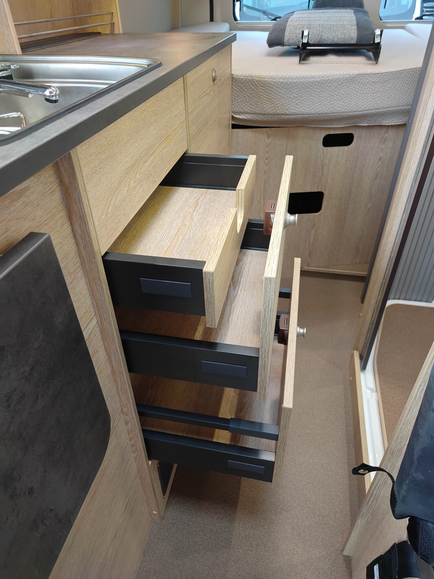 - Küchenzeile mit einem 2-Flammenkocher und einer Spüle inkl. Glasabdeckung, einem Kühlschrank von Dometic, Schubladen, einer klappbaren Arbeitsflächenerweiterung
