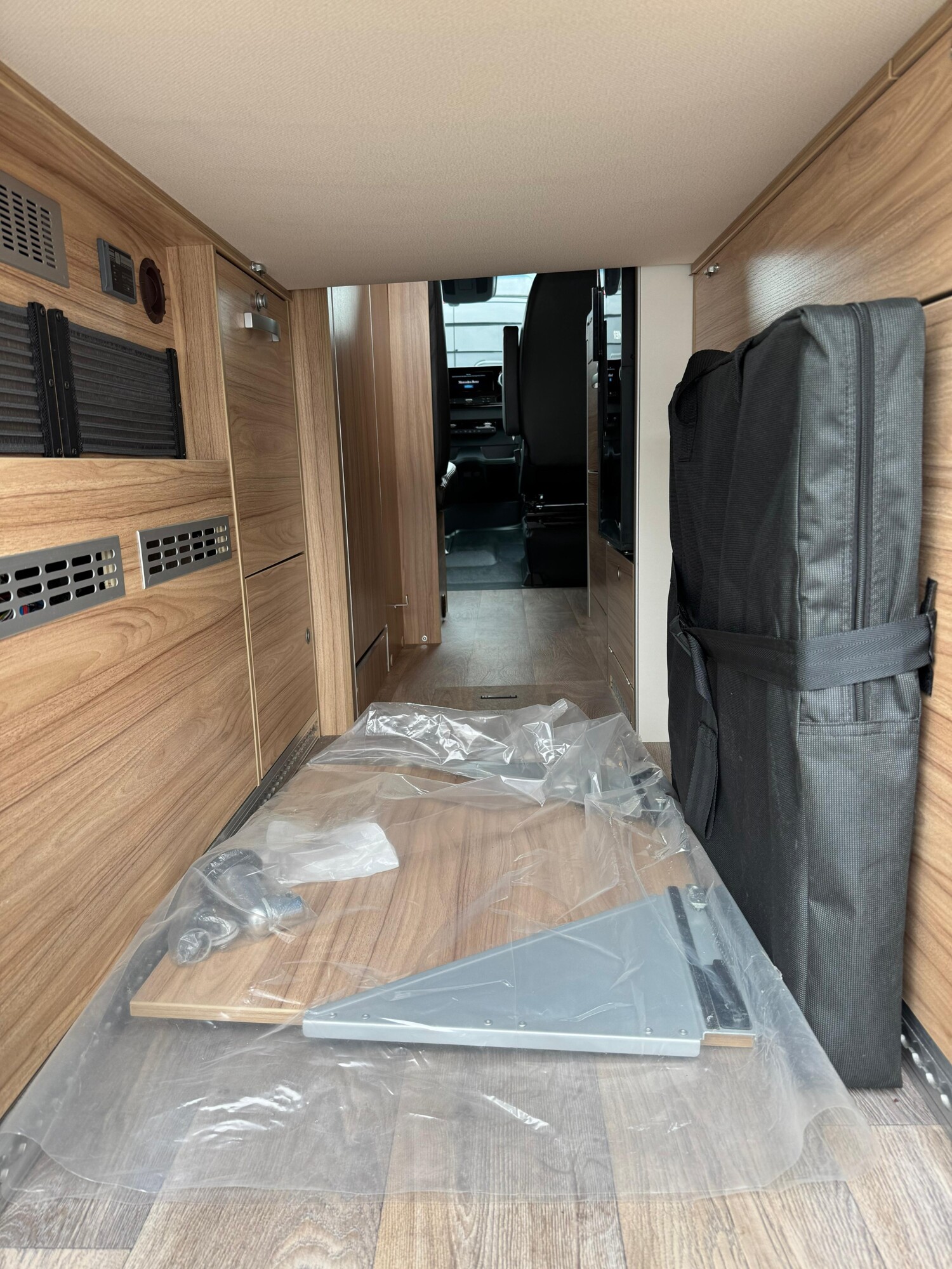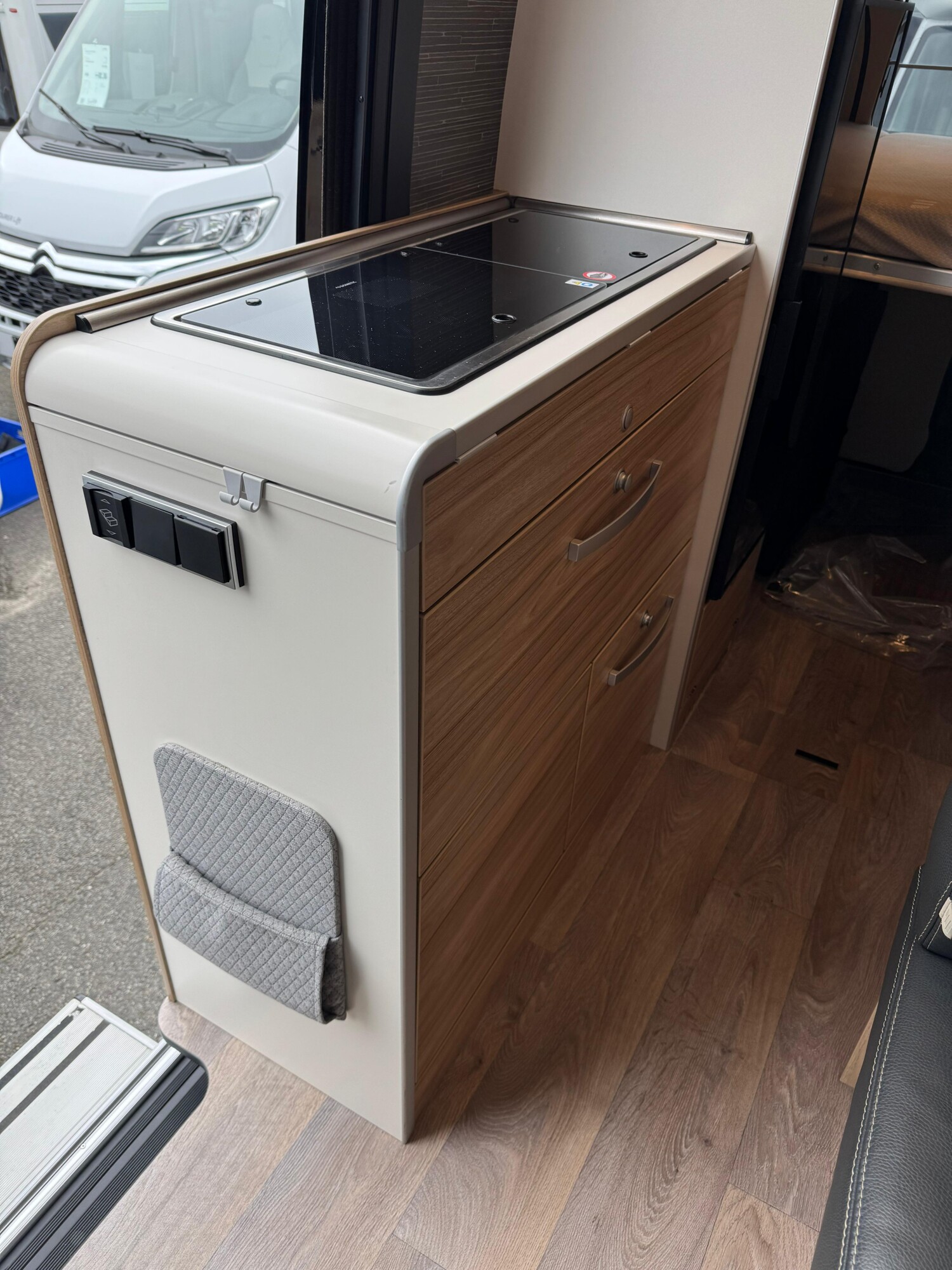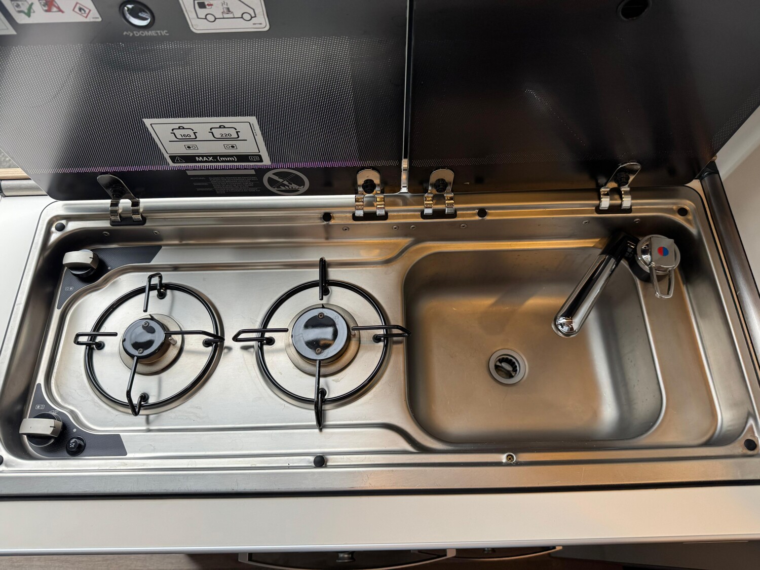 - Küchenzeile mit einem 2-Flamm-Kocher und einer Spüle inkl. Abdeckung, einer erweiterbaren Arbeitsfläche mit Utensilientasche, Schubladen und Stauschränken