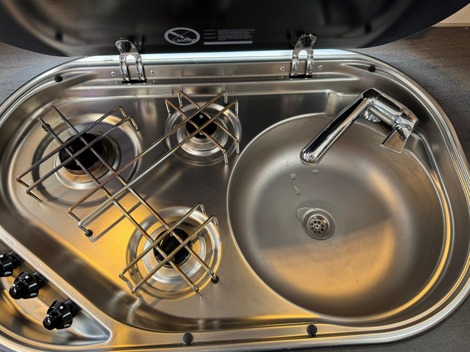 - Küchenzeile mit einem 3-Flamm-Kocher und einer Spüle inkl. Glasabdeckung, Schubladen und Stauschränken