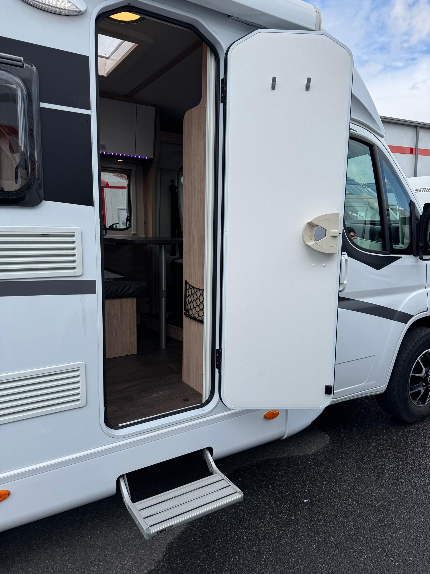 - Aufbautür mit einer elektrischen Trittstufe, einer Fliegenschutztür und einer Utensilientasche