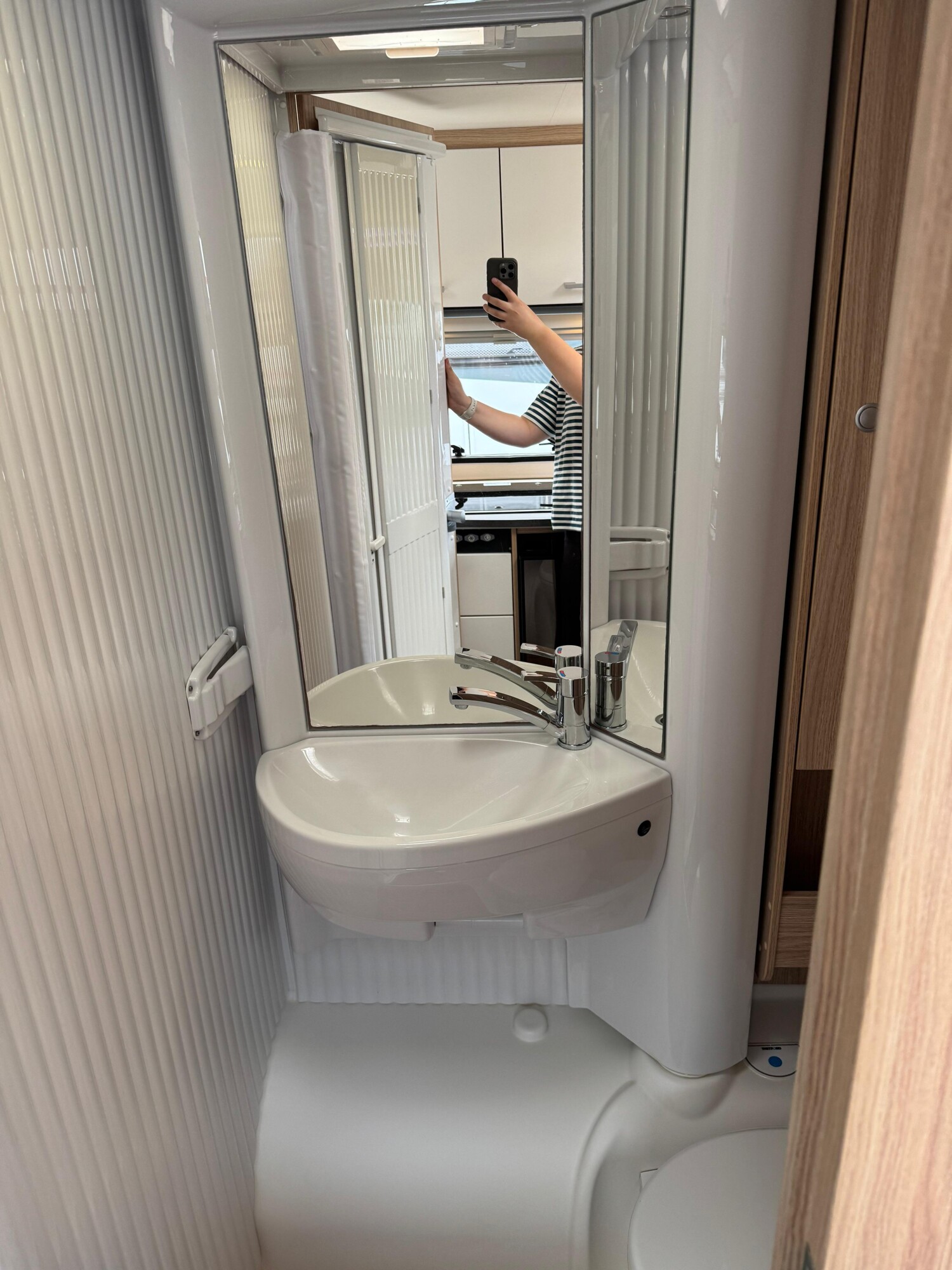 - Nasszelle mit einer Cassettentoilette von Thetford, einem schwenkbarem Waschbecken, einer Duschaustattung und einem Stauschrank