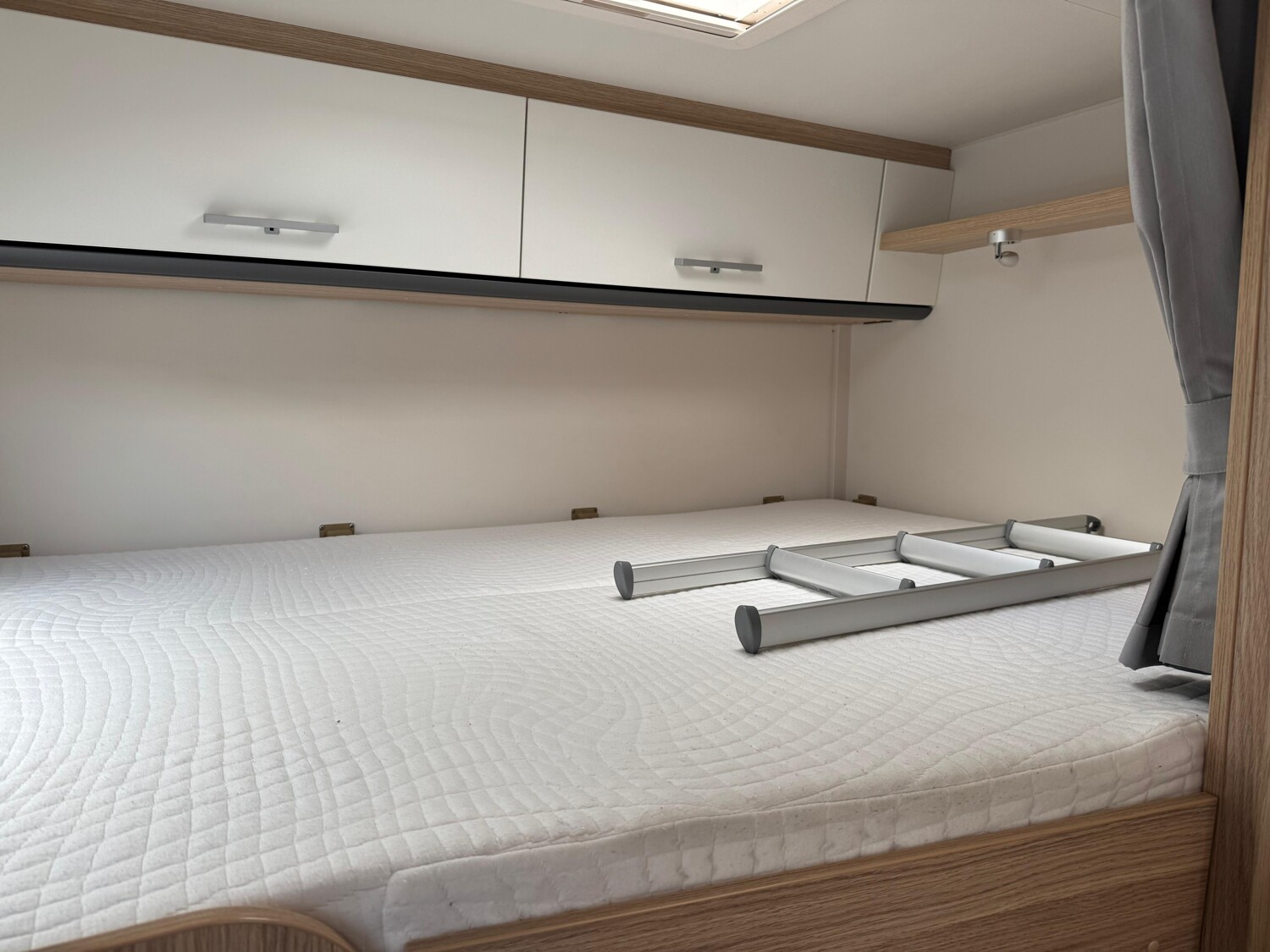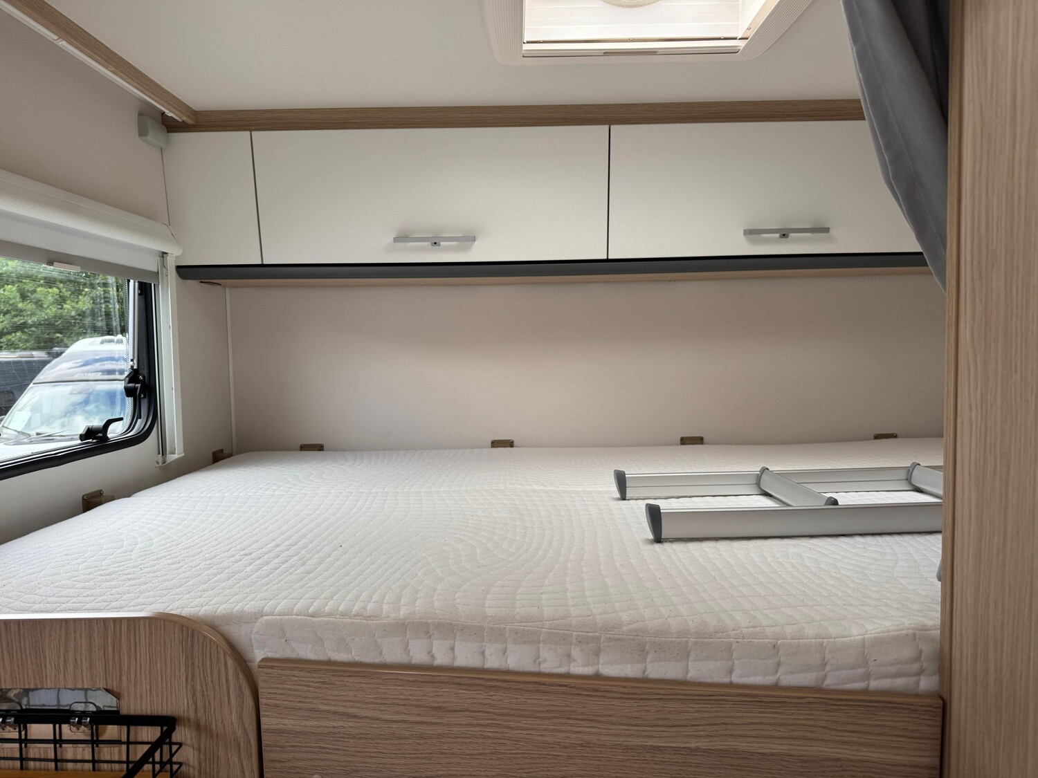 - Doppelbett im Heck mit Stauschränken, einem Vorhang und einem Fenster