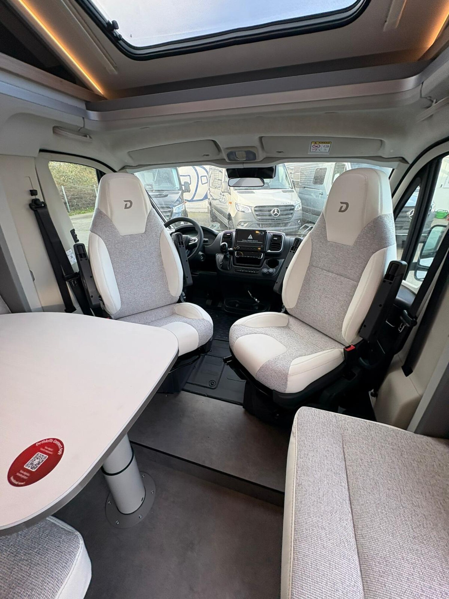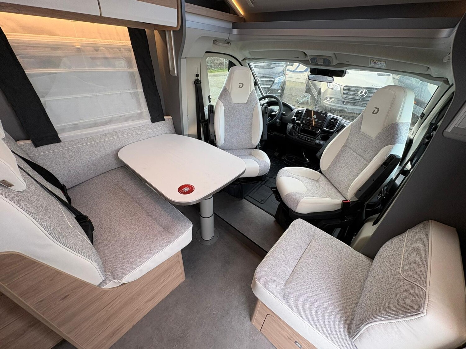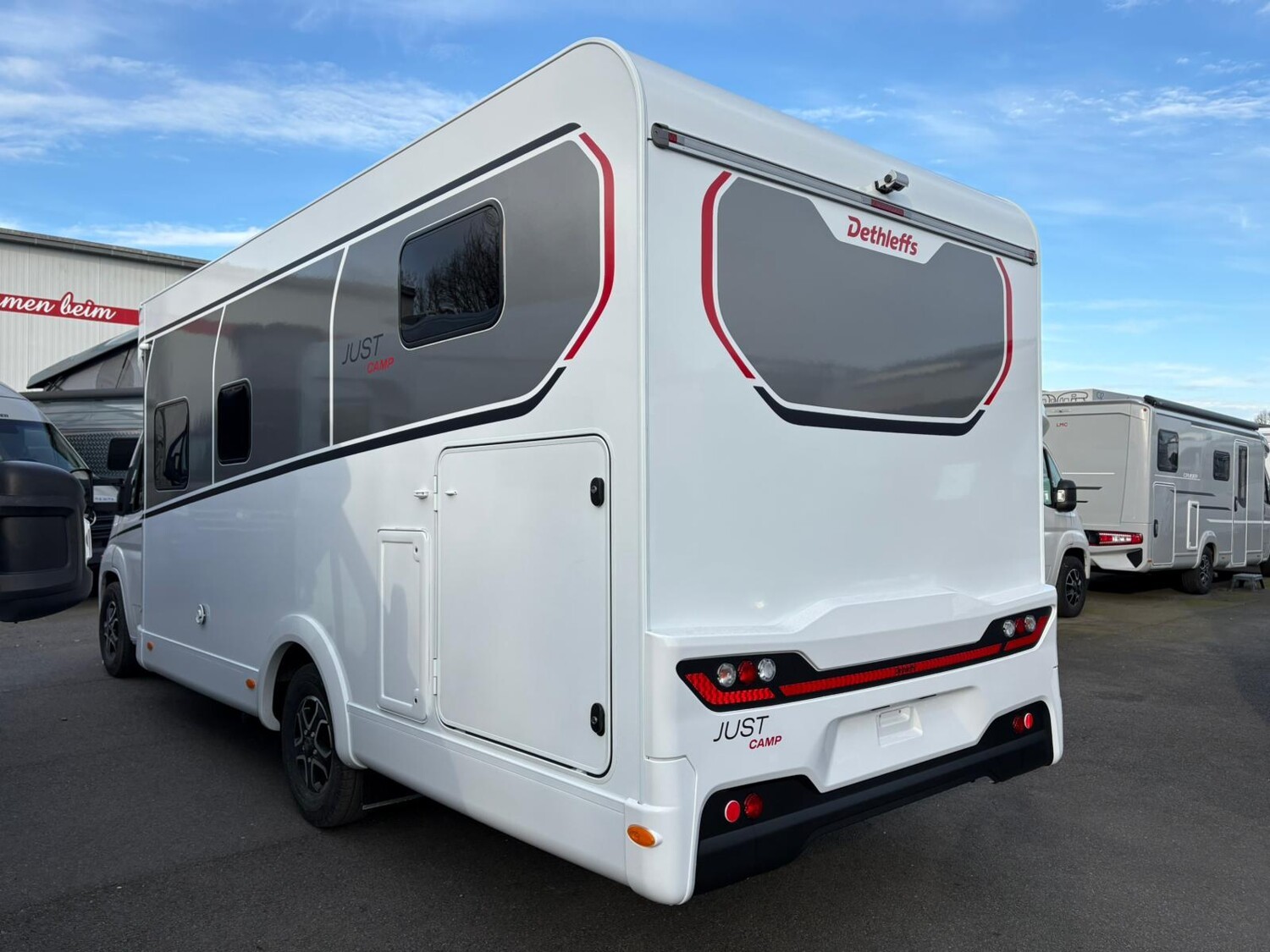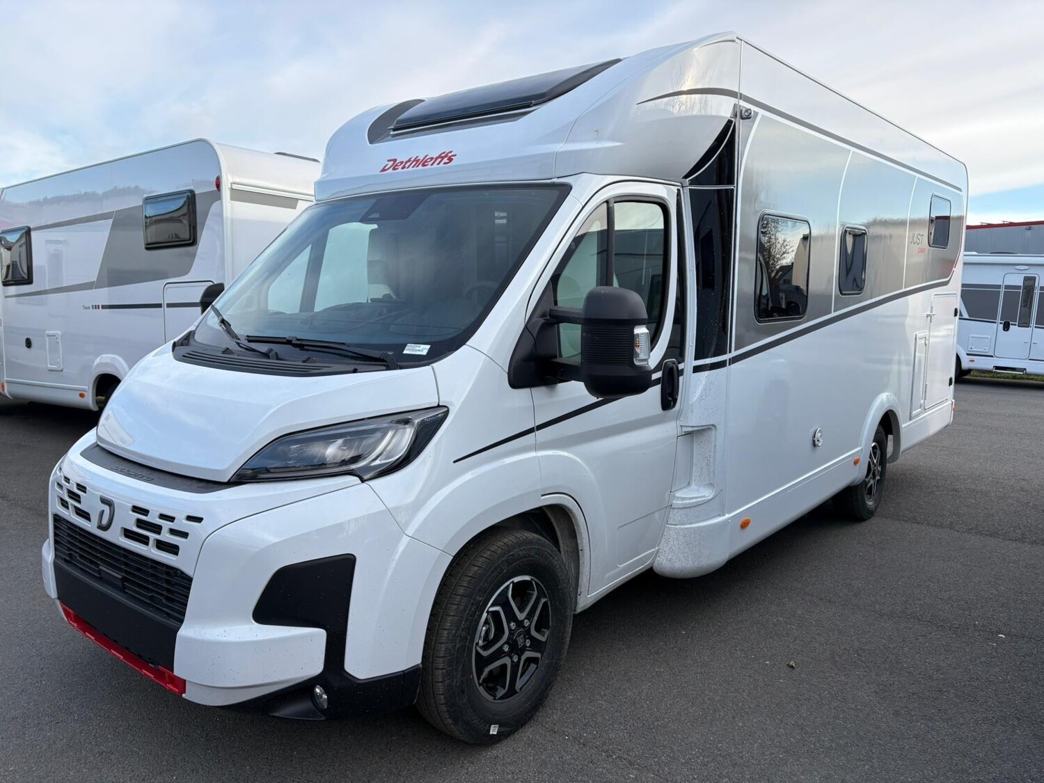 - Active-Paket T 7052 EB (Ausstellfenster in der T-Haube, Wohnraumtür mit Fenster inkl. Verdunkelung und Zentralverriegelung (inkl. Fahrerhaustür), Verdunklungsjalousien im Fahrerhaus, Panorama-Dachhaube 70 x 50 cm im Wohnraum, Light Moments: Indirekte Ambientebeleuchtung über den Dachstauschränken, Light Moments: Indirekte Wandflächen-Ambientebeleuchtung, Stauraum-Türe links, Doppelverglaste Rahmenfenster mit Verdunklung & Mückenschutz inkl. verkleidete Küchenrückwand, Textilleder-Wohnwelt Heron, Vorbereitung Solar, Light Moments: Küchenrückwand beleuchtet, Vorbereitung Dach-Klimaanlage, Digitales Bedienelement für Warmluftheizung, Dethleffs Naviceiver inkl. DAB+, Truck Navigation, Wireless Apple CarPlay und Android Auto, Rückfahrkamera (Einfachkamera), Vorbereitung SAT-Anlage, Active Außendesign (Heckleuchtenträger mit schwarzem Diffusor, erweiterte Beklebung, Skidplate "rot"), Bettumbau Einzelbetten zu Doppelbett, Gemütliche L-Sitzgruppe mit freistehendem, absenkbarem Tischfuß und 2 integrierte 3-Punkt-Gurte, Fenster im Badezimmer, Duschrost, Cassettenmarkise Omnistor 4,5 m (manuell))