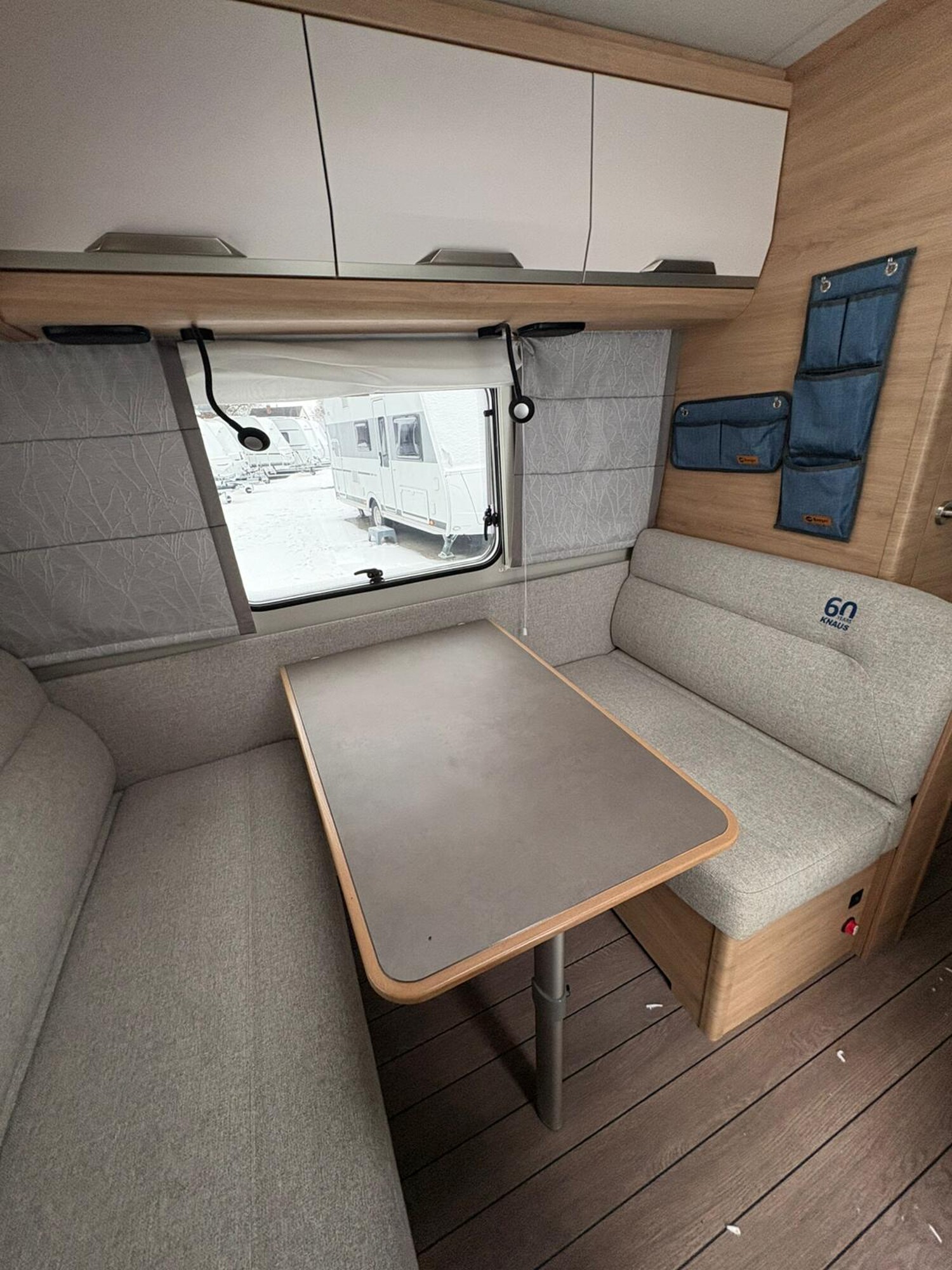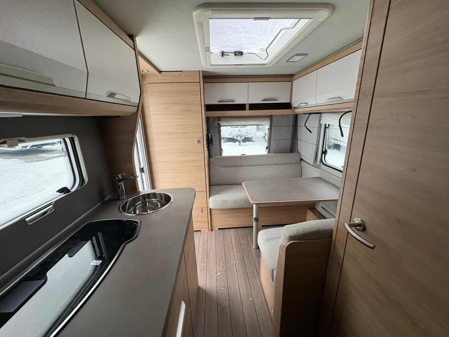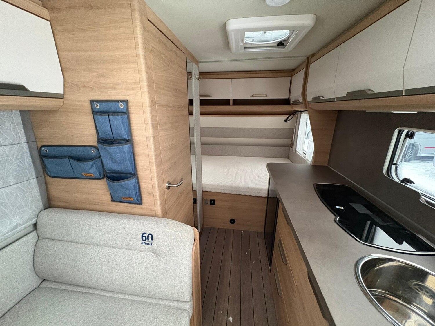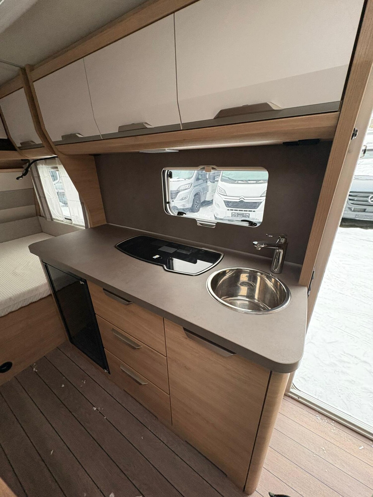 - Küchenzeile mit großzügiger Arbeitsfläche, 3-Flammkocher inkl. Glasabdeckung, Kühlschrank mit integriertem Eisfach, Stauschränke, Schubladen