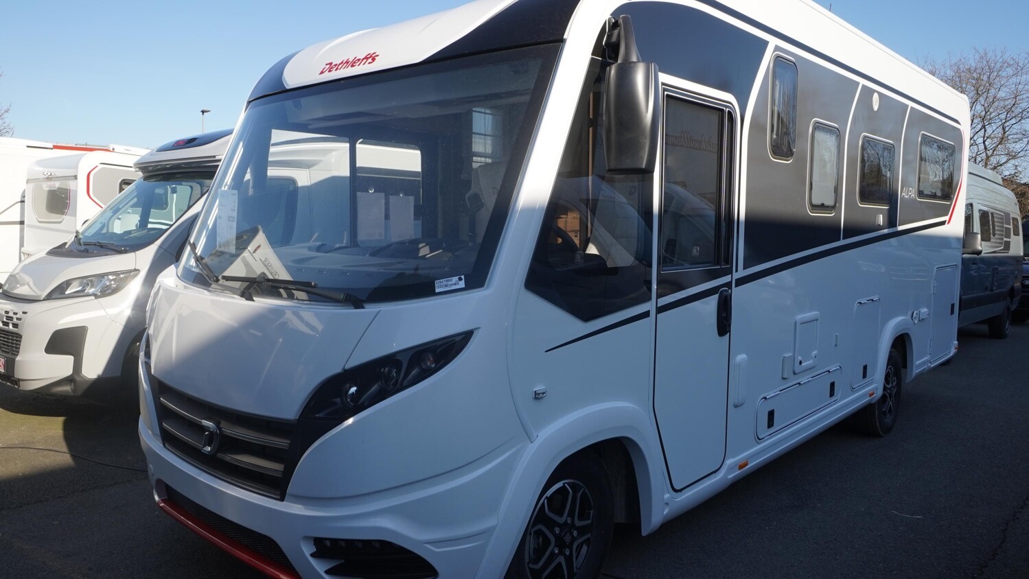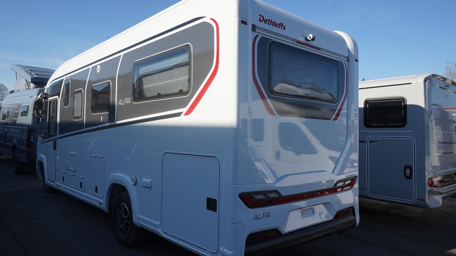 - GT Paket ALPA I (Außendesign GT (Heckleuchtenträger mit schwarzem Diffusor, Kühlergrill mit Chromkeder, Skidplate "rot"), LED-Abblendlicht, Hoher charakteristischer Dethleffs Exklusiv Heckleuchtenträger mit ShapeLine LED Rückleuchten und 3. Bremsleuchte)