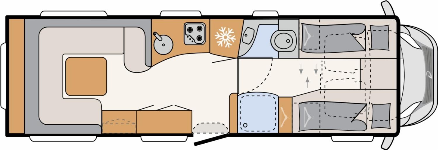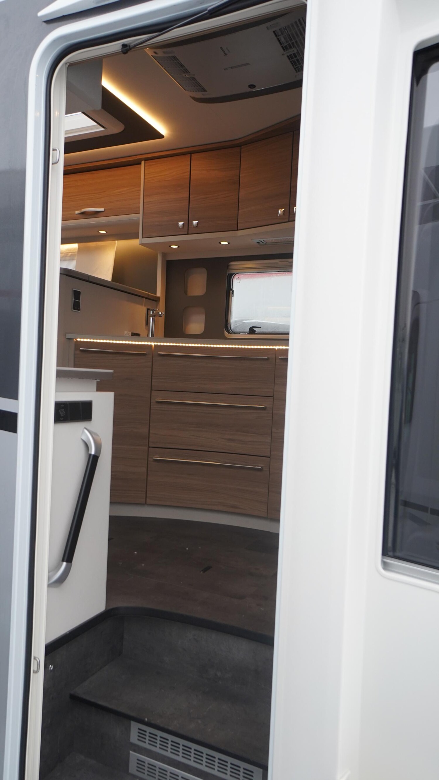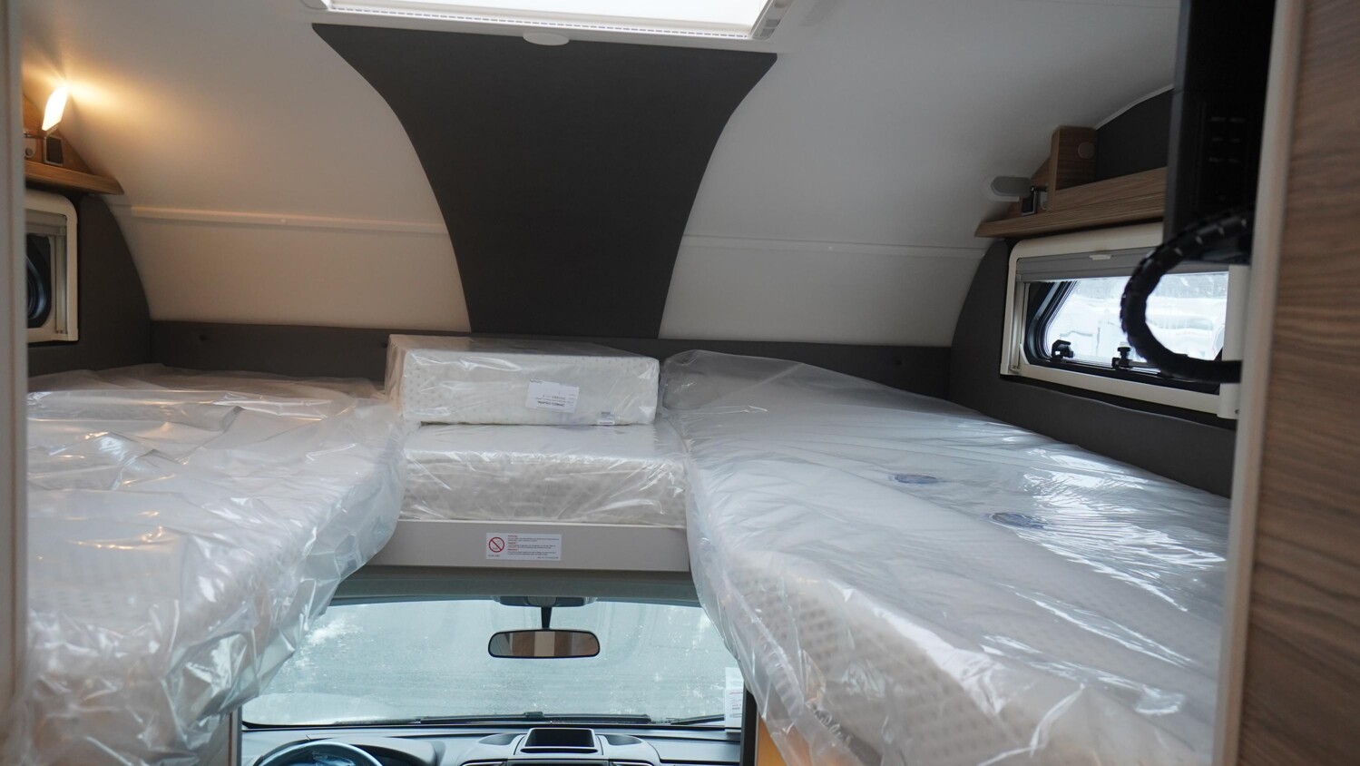 - Travel-Paket A 7820-2 (Light Moments: Indirekte Ambientebeleuchtung über den Dachstauschränken, Verdunklungsjalousien im Fahrerhaus, Dunstabzugshaube (Abluft) mit Zugluft-Stopper, Stützen (2 Stk.) für Anbau hinten, Automatische Gasflaschenumschaltung inkl. Crash Sensor und EisEx, Rückfahrkamera (Einfachkamera), Panoramafenster (zweite Panoramadachhaube 75x105 cm längs über Sitzgruppe Heck) inkl. Baldachin und Raumleuchte, Zentralverriegelung für Fahrerhaus-, Wohnraumtüre und Garagentüren)