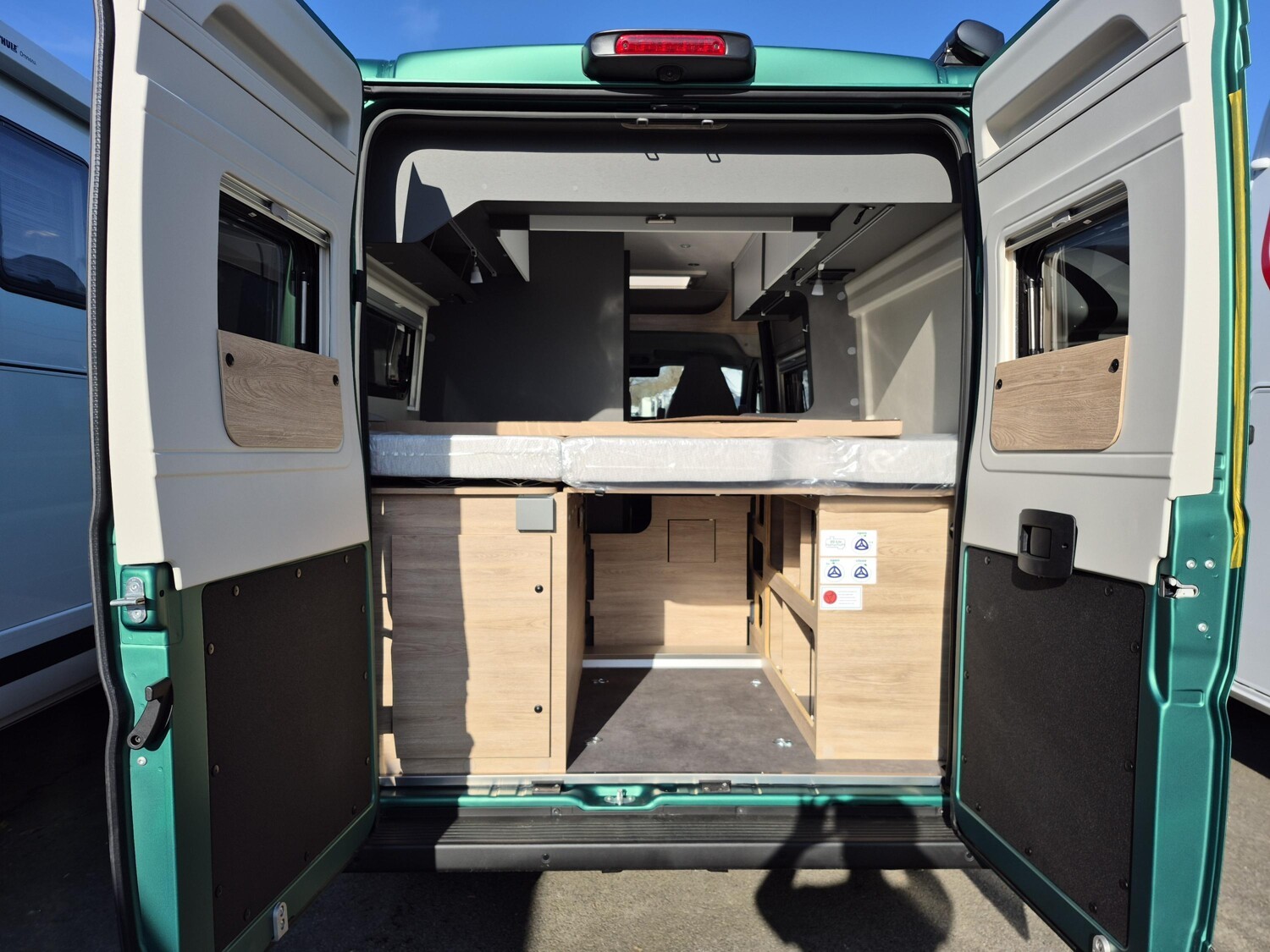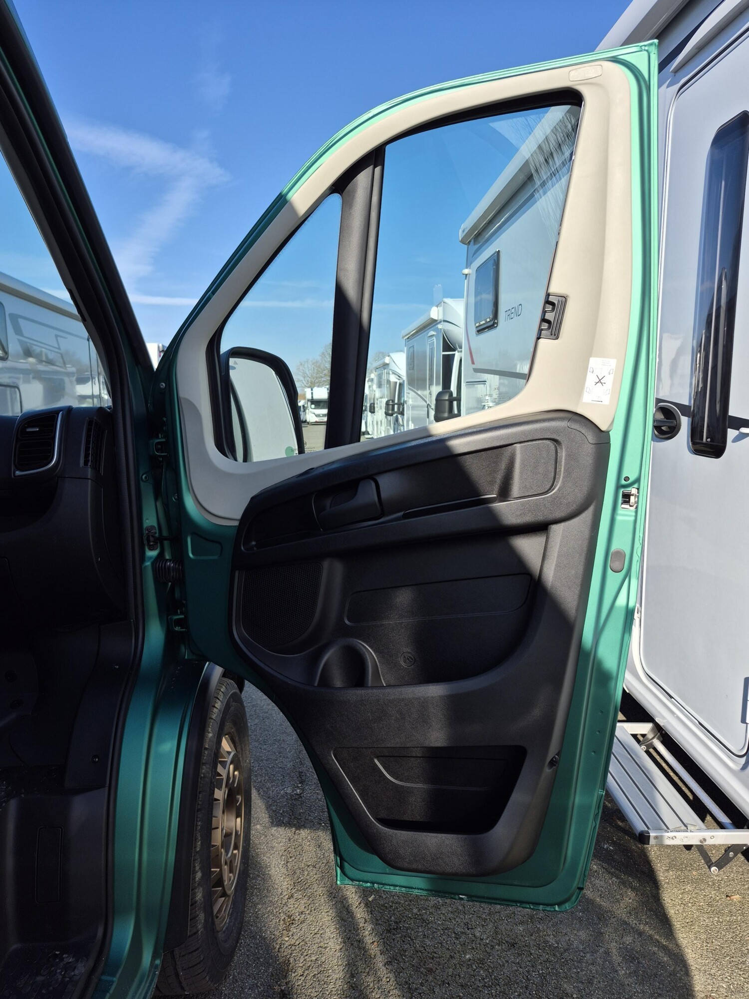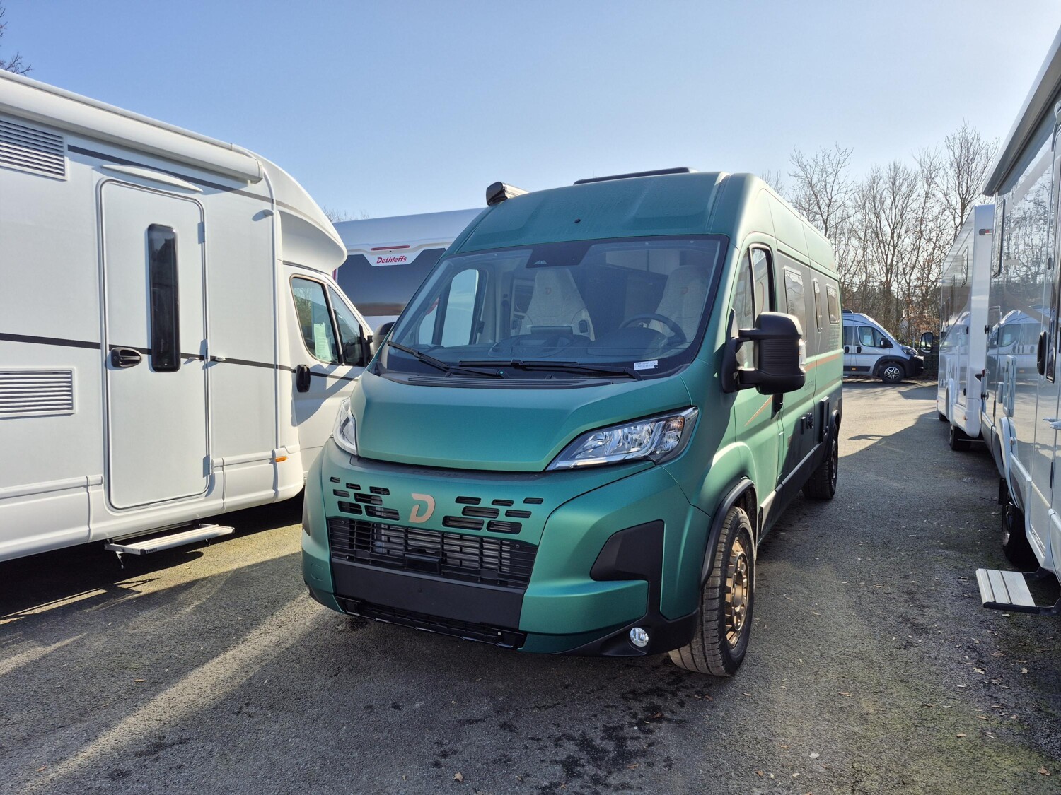 - Bronze - Sierra Green (600DK/DS/DR) (Wohnwelt Scandi Bronze, Möbeldekor Amberes Oak, Absatzdekor Trace Dark Grey, Pack Easy Driving Plus (New Pack Safety, Stoßfänger in Wagenfarbe, Skid Plate Schwarz, Nebelscheinwerfer, Adaptiver Tempomat ACC), Pack Vision Level 2 (Seitenspiegel anklappbar, Parksensoren hinten, Totwinkelassistent), Automatische Klimaanlage, Digitale Rückfahrkamera, Digitales Cockpit, Radio Navigation mit 10 Zoll Display, Wireless Phone Charger, Vorzeltleuchte, Indirekte Beleuchtung, LED-Lichtröhre in der Küche, Vorbereitung Solarmodule, Truma Bedienteil CP Plus, 230-V-Steckdose im Oberschrank Bug links (Sitzgruppe), 12-V-Steckdose im Heckbereich links unten, Zusätzliche Doppel-USB-Steckdose im Bug links, Drehplatte für Tischerweiterung, Fenster mit Fliegenschutz und Verdunklungsrollo im Heck links, Markise 3,75 m (600), Sonderfolierung Black 75k, 18" Borbet Felgen Bronze mit M&S Bereifung, Sonderlackierung Matt - Sierra Green)