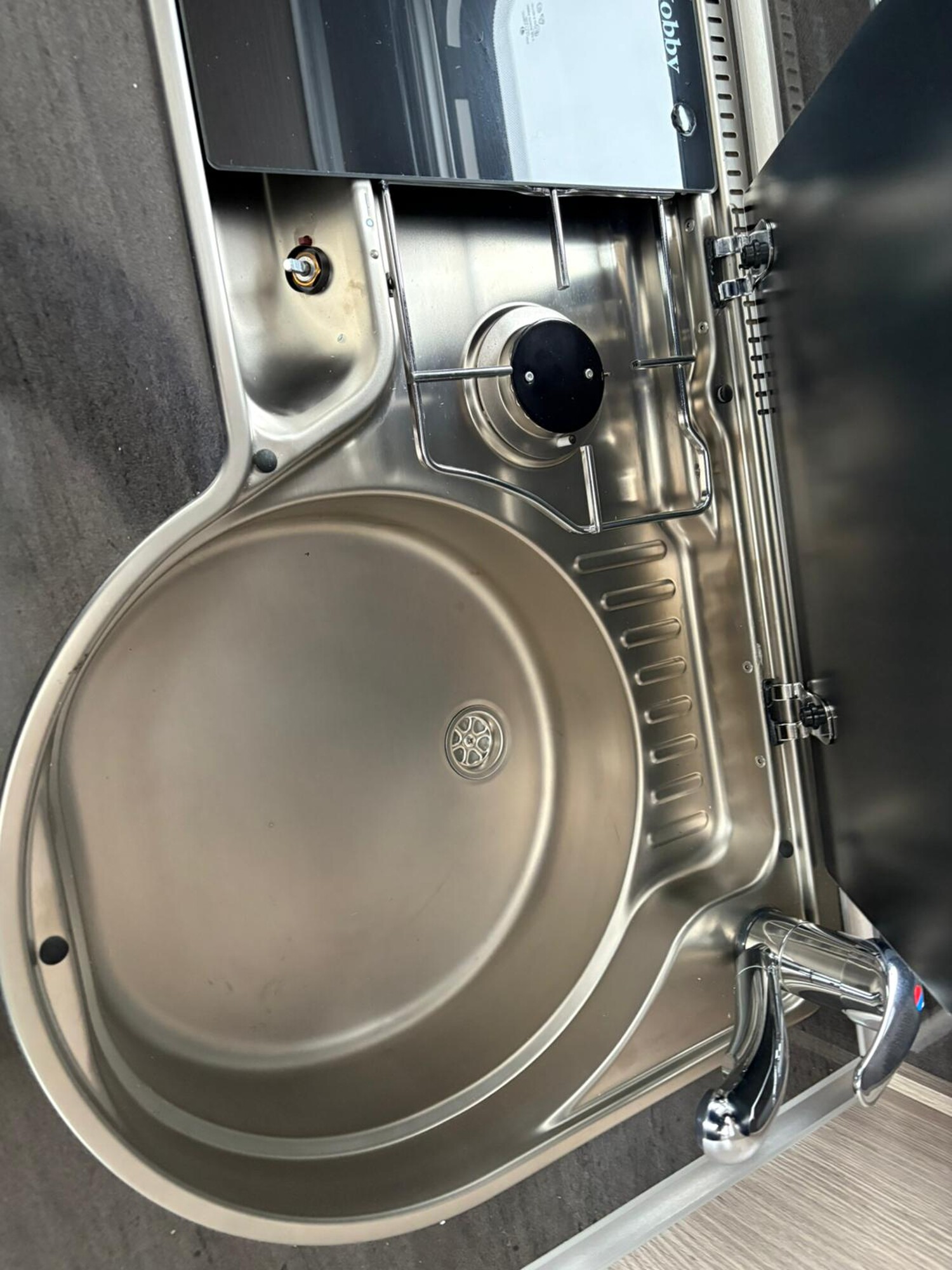 - Küchenzeile mit einem 2-Flammkocher und einer Spüle inkl. Glasabdeckung, Schubladen, Stauschränke
