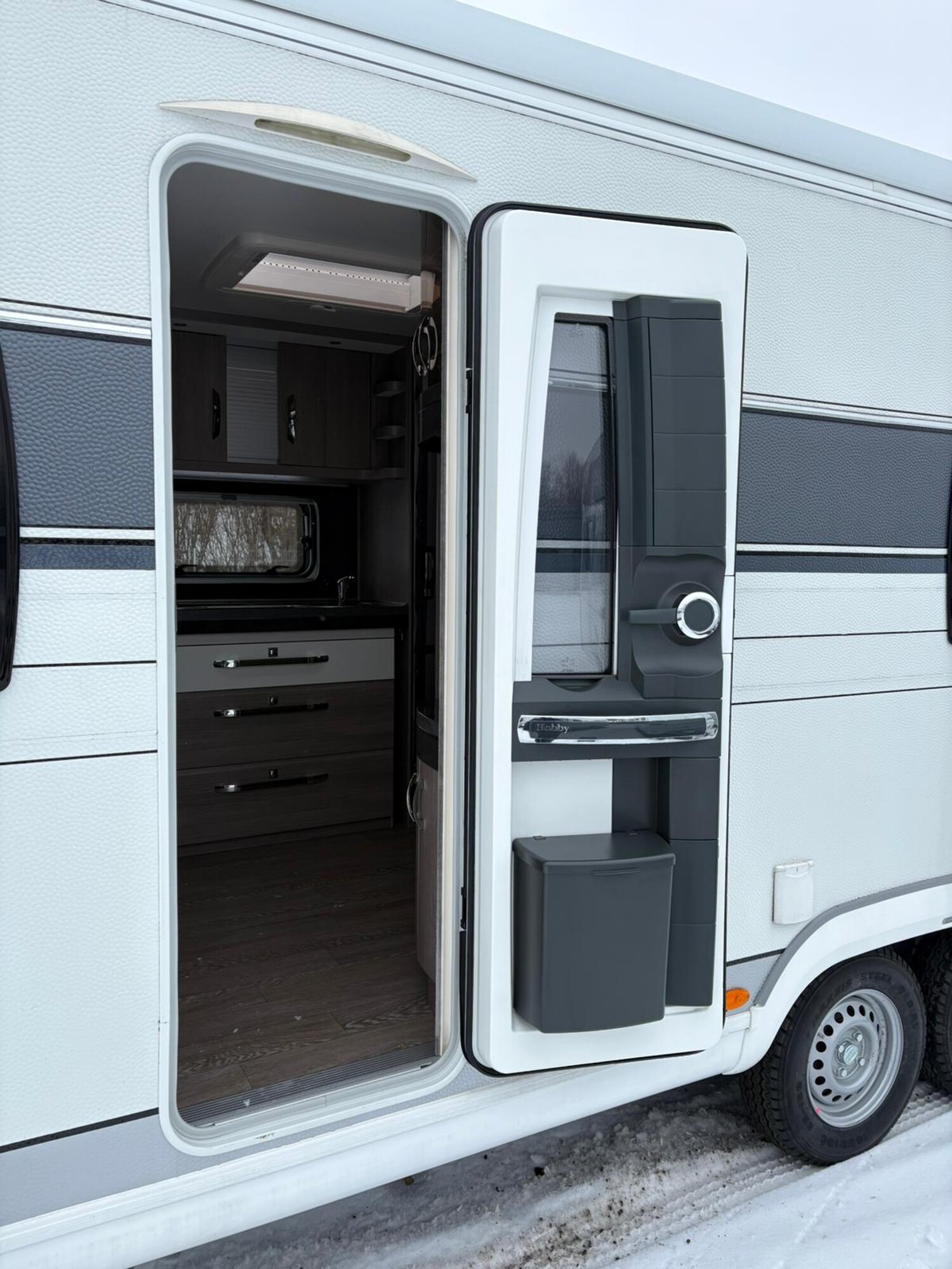 - Eingangstür mit Mülleimer, Fenster, Einstiegsgriff, Fliegenschutztür