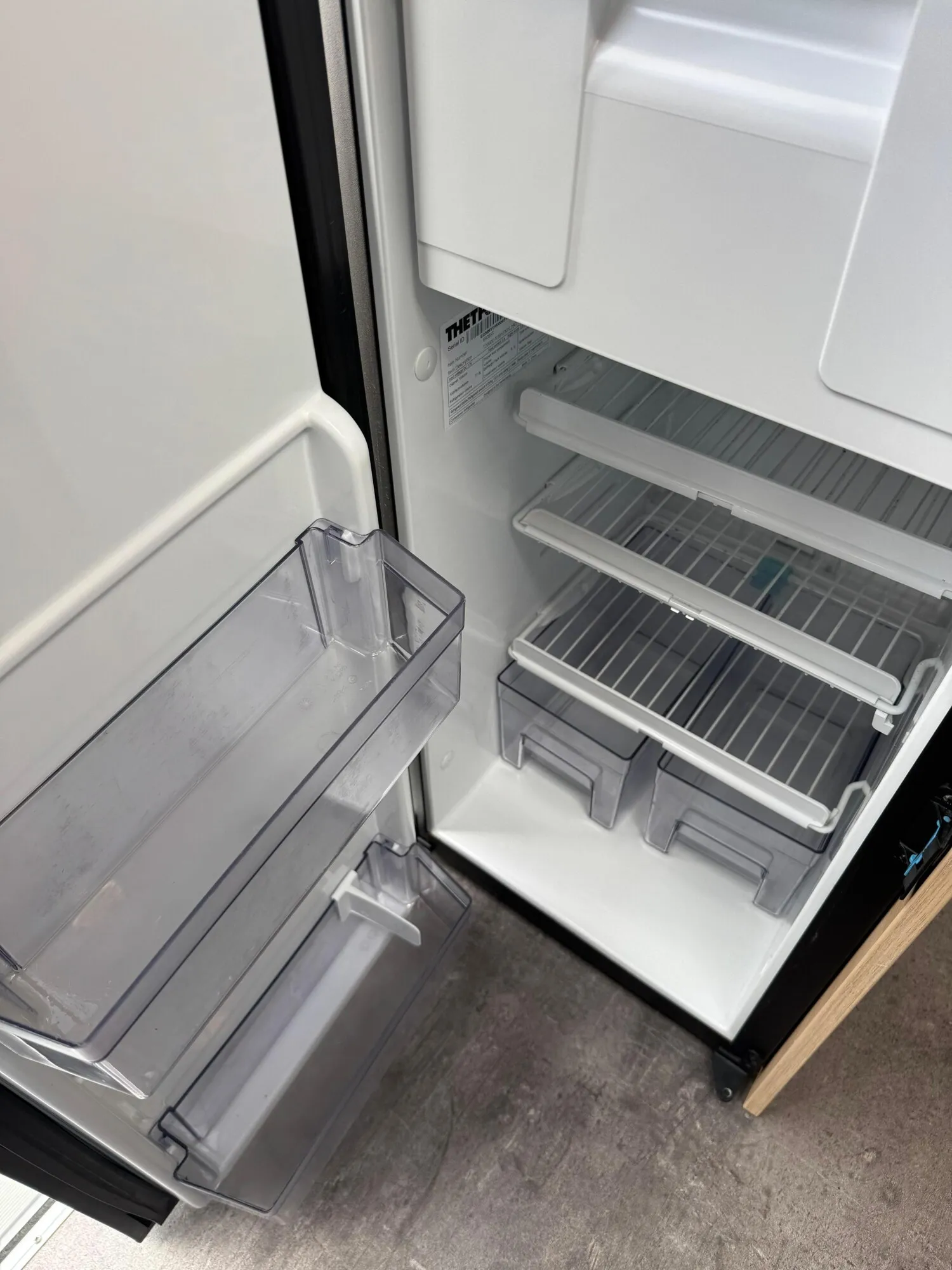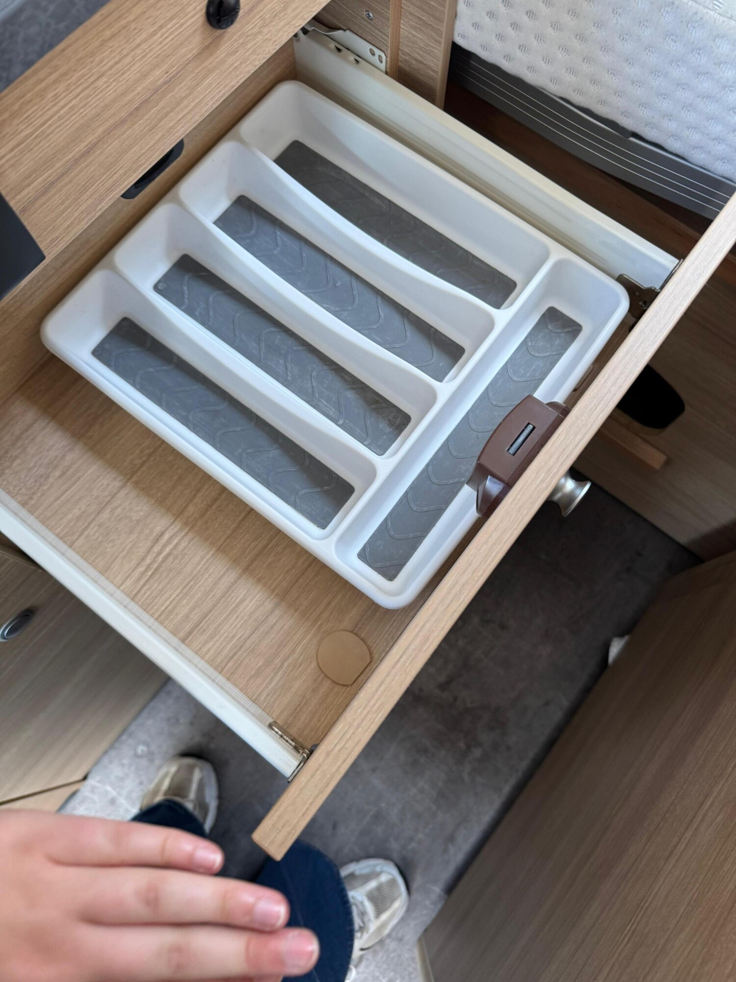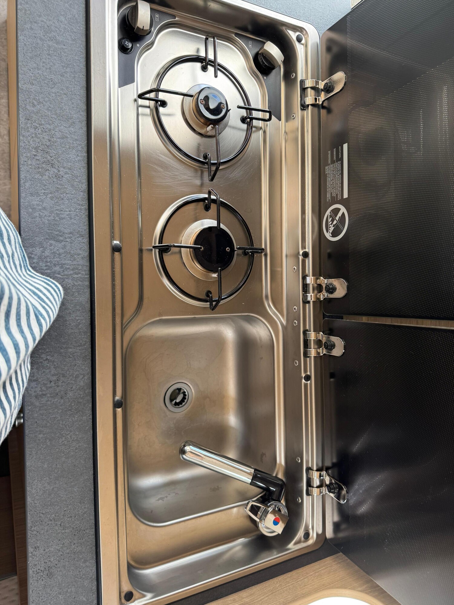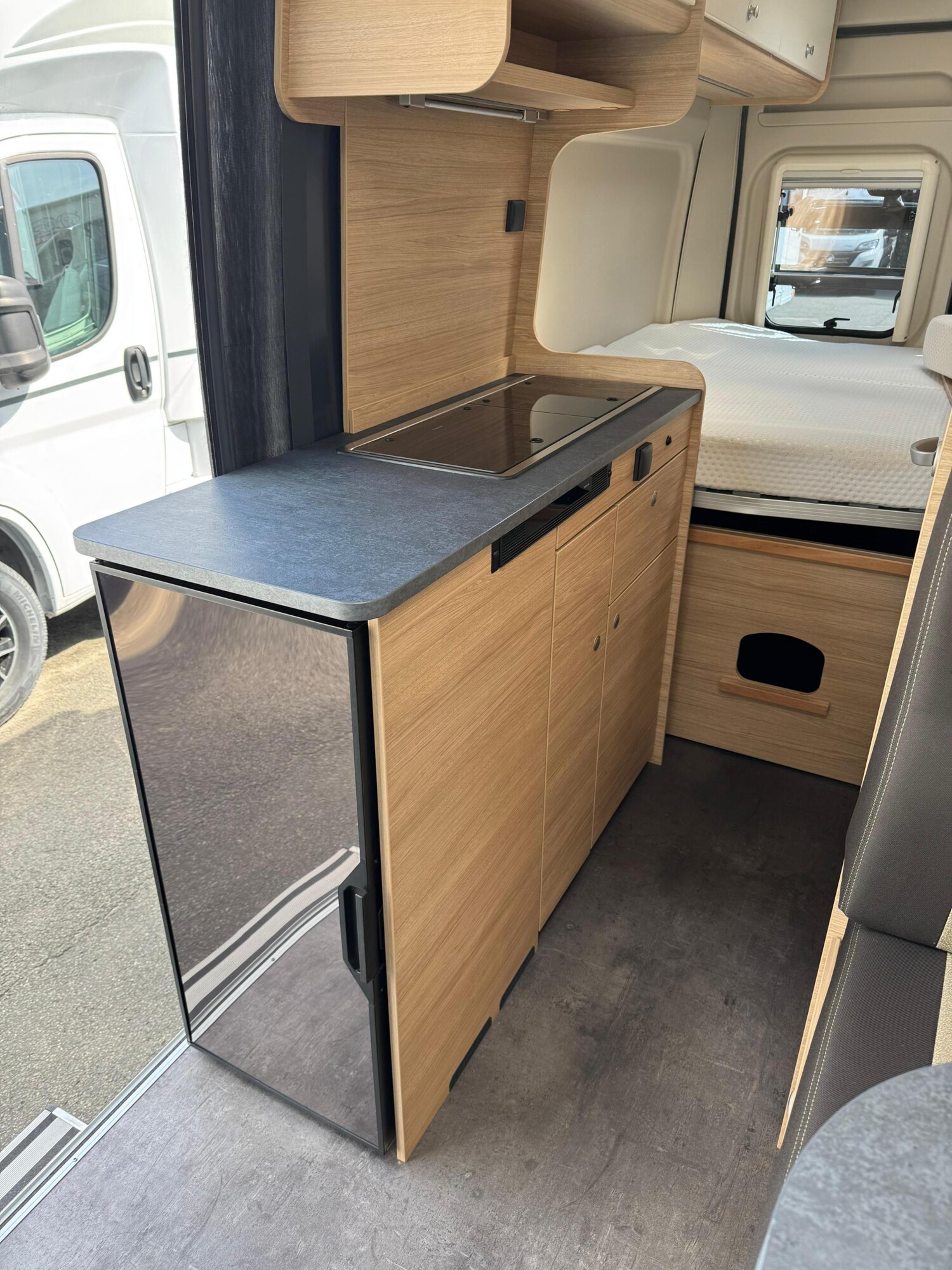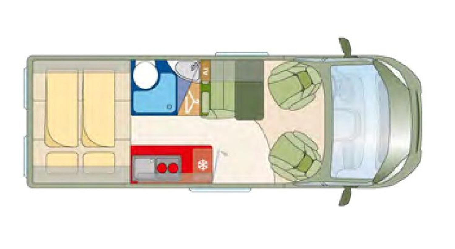 - Küchenzeile mit einem 2-Flamm-Kocher und einer Spüle inkl. Glasabdeckung, einem Kühlschrank mit integriertem Eisfach, Schubladen und Stauschränken