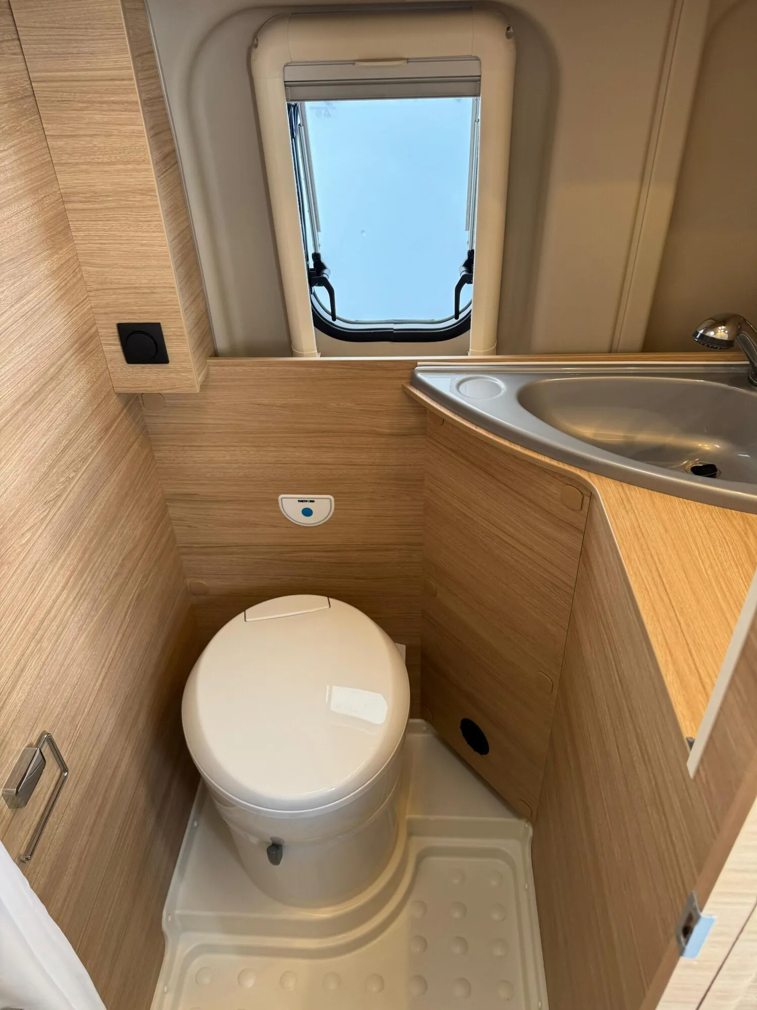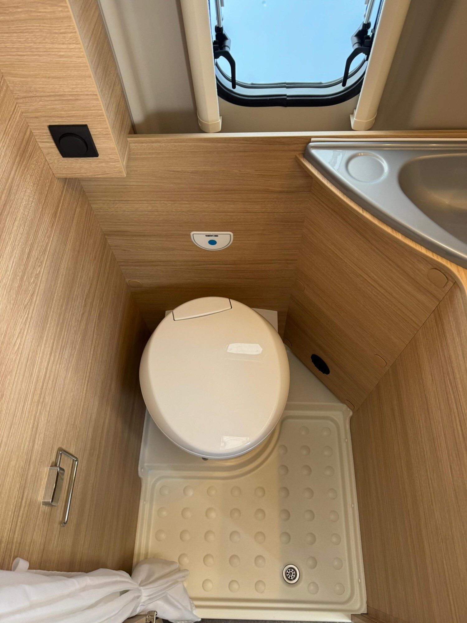 - Nasszelle mti einer Cassettentoilette von Thetford, einem Waschbecken, einer Duschausstattung, einem Spiegel und einem Stauschrank