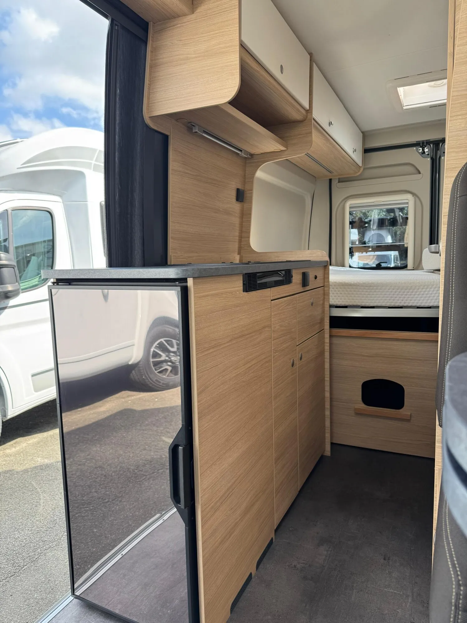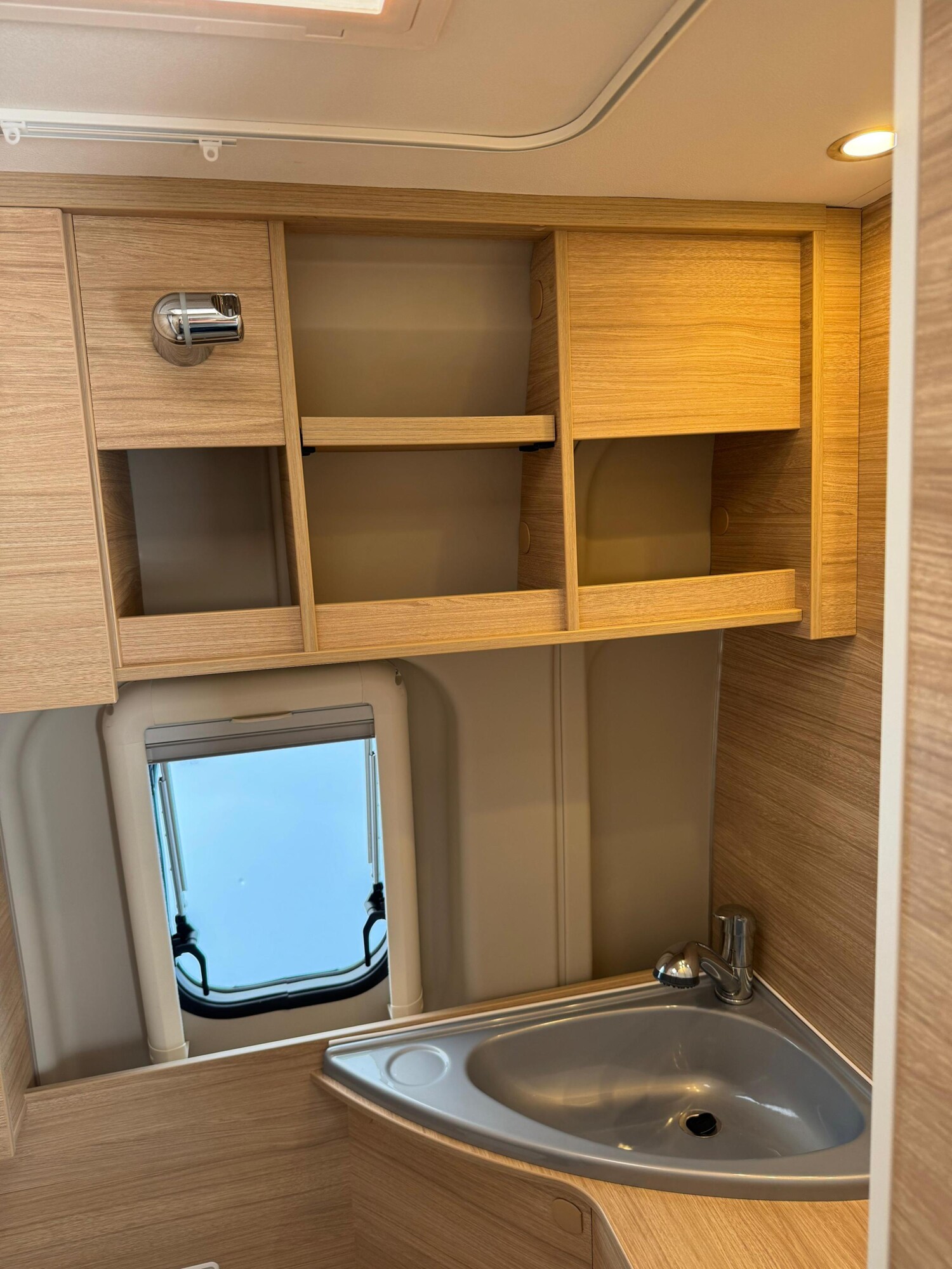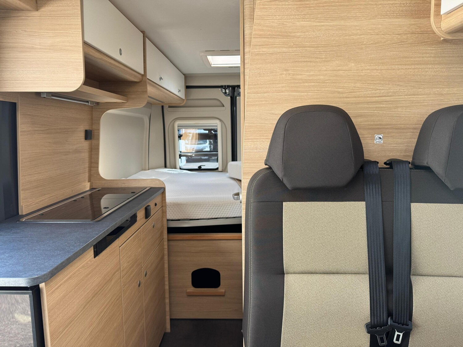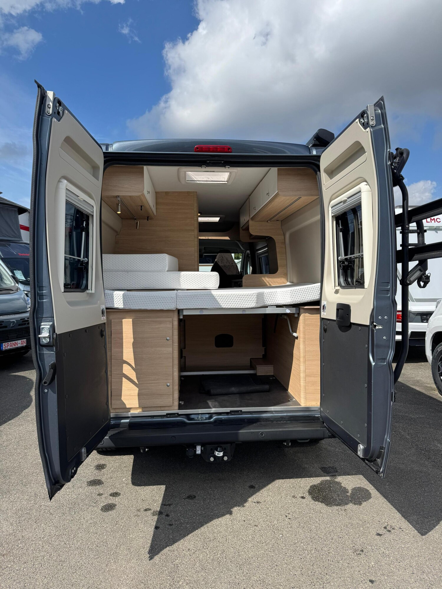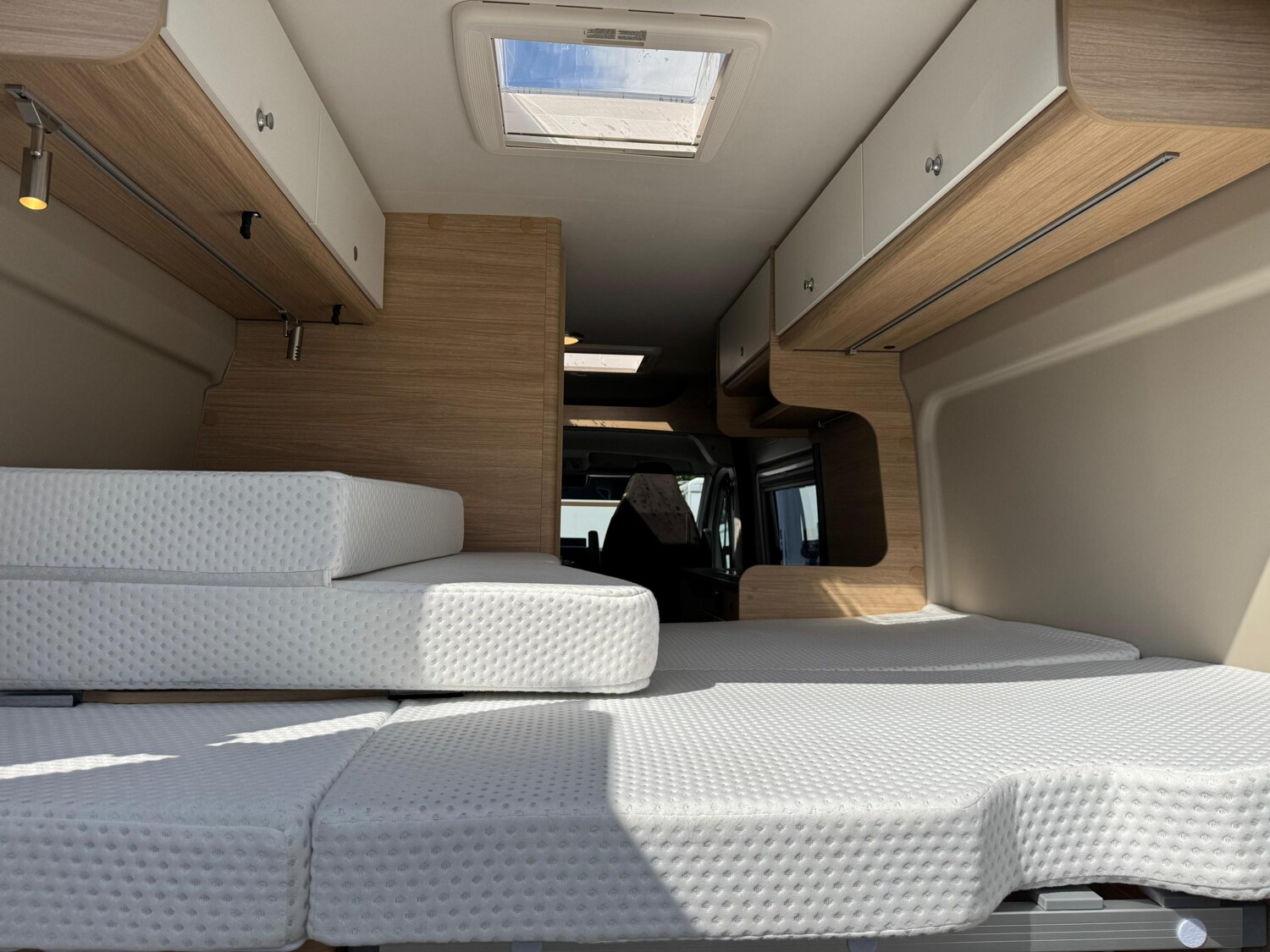 - Doppelbett im Heck mit Staufläche darunter, Stauschränken und Leselampen