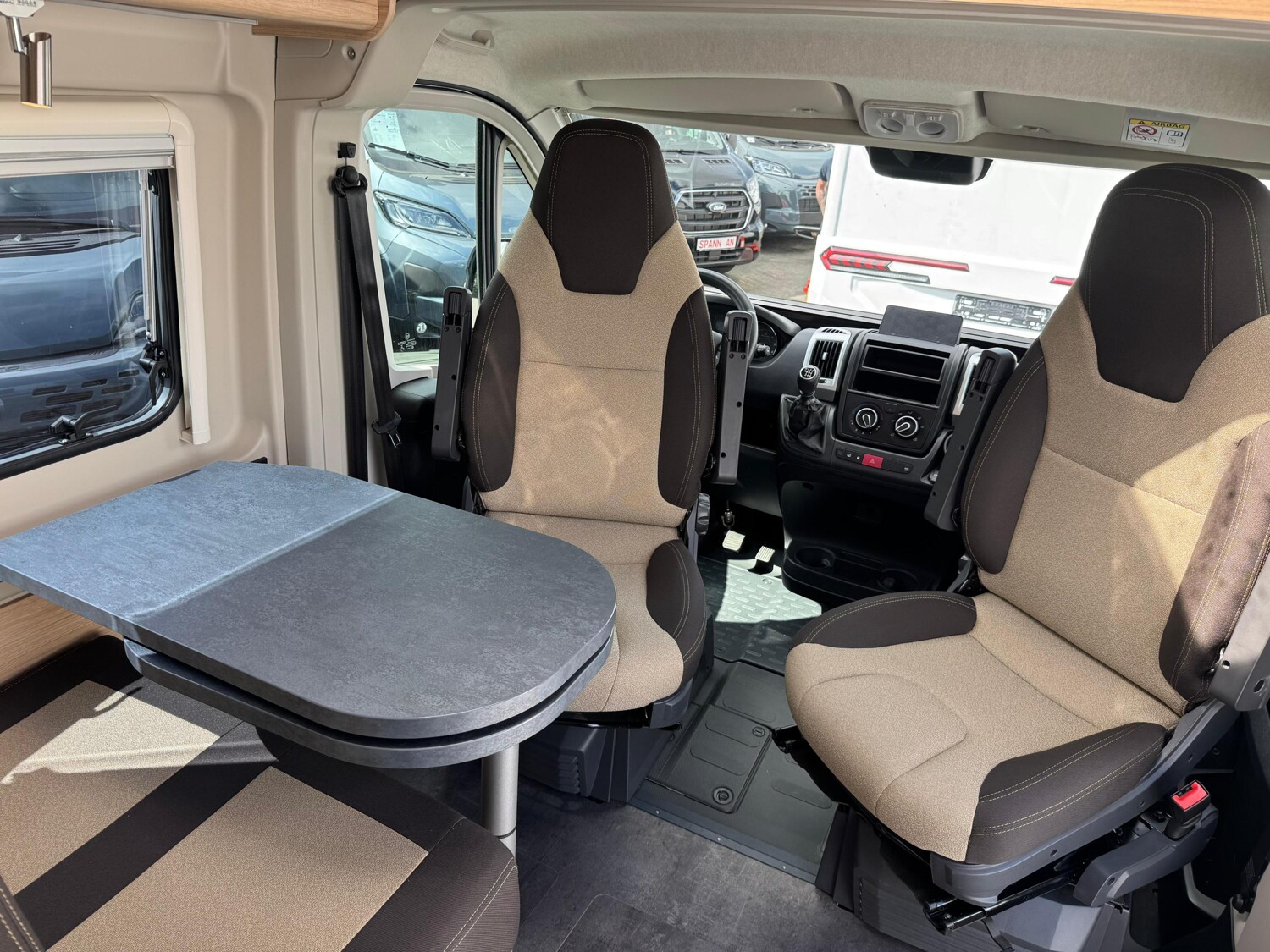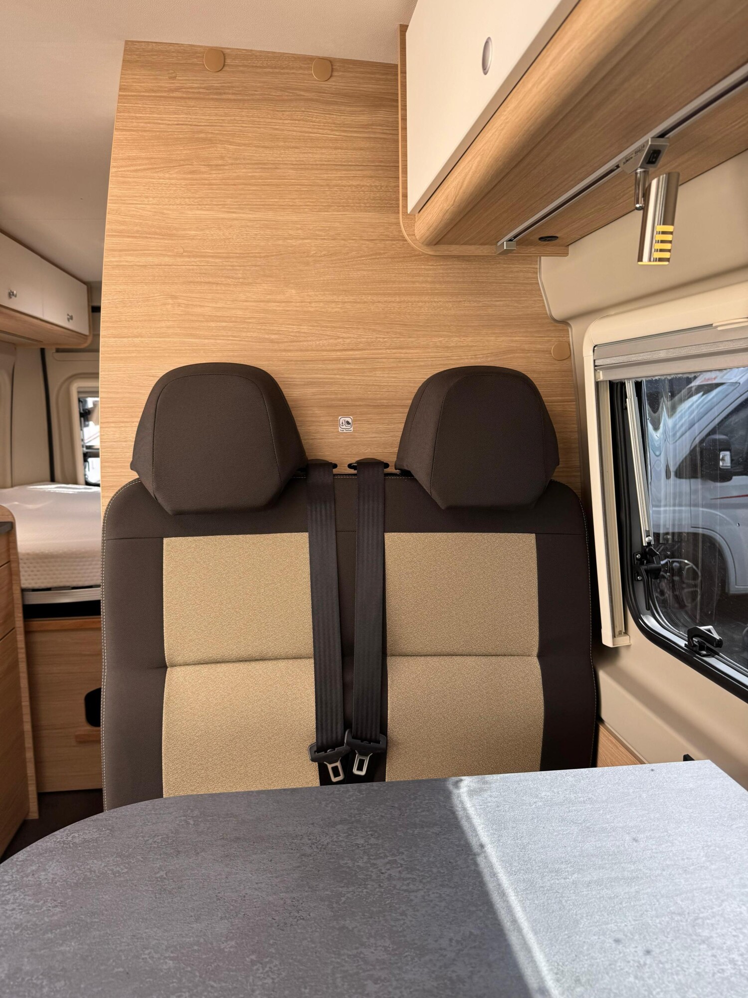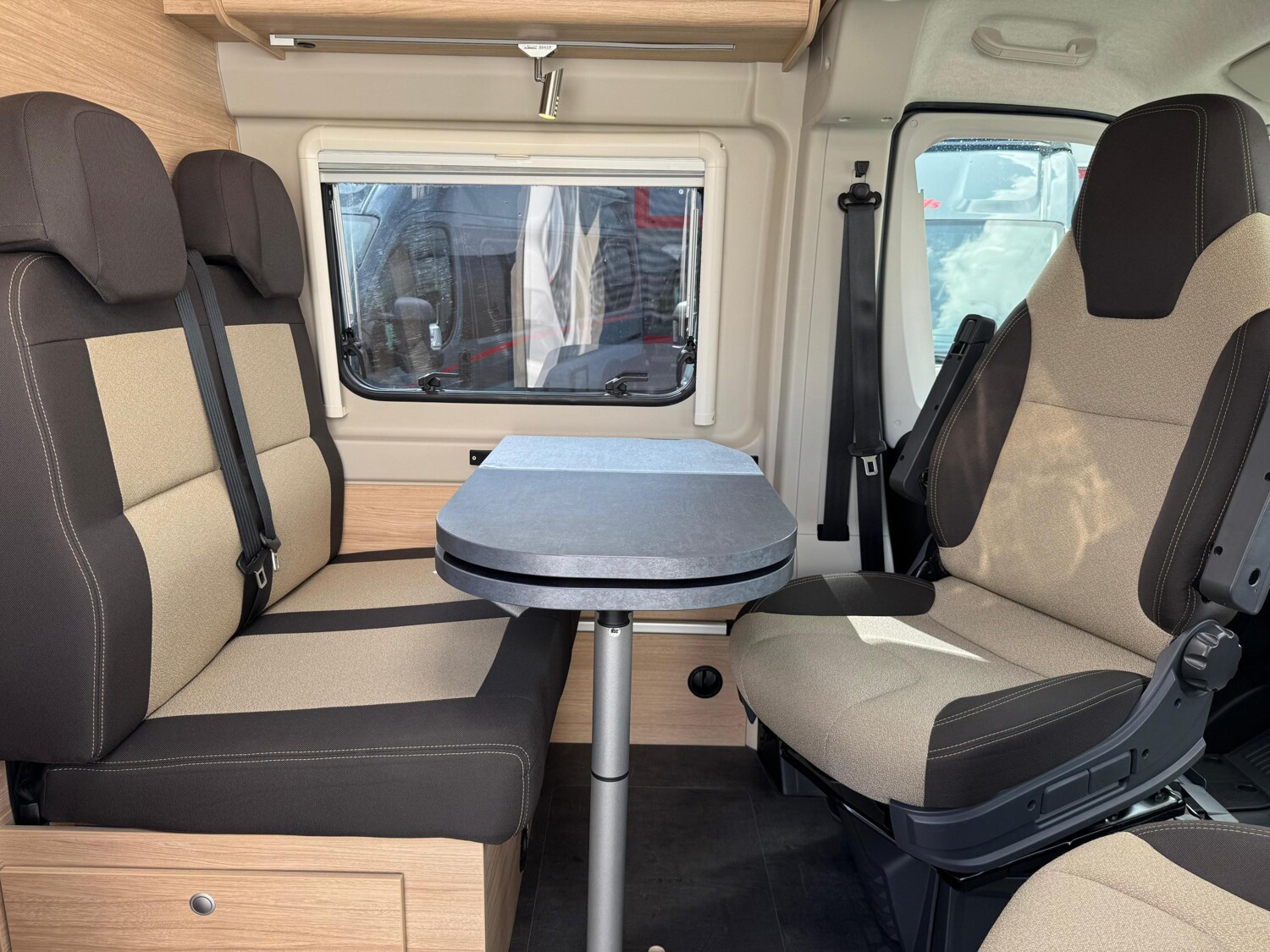 - Seitensitzgruppe, umbaubar zu einer weiteren Schlafmöglichkeit, mit einem Tisch inkl. ausziehbarer Erweiterung, einer Leselampe und einem Stauschrank