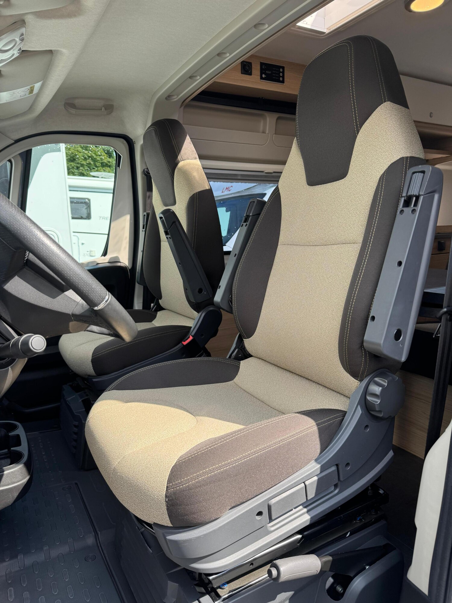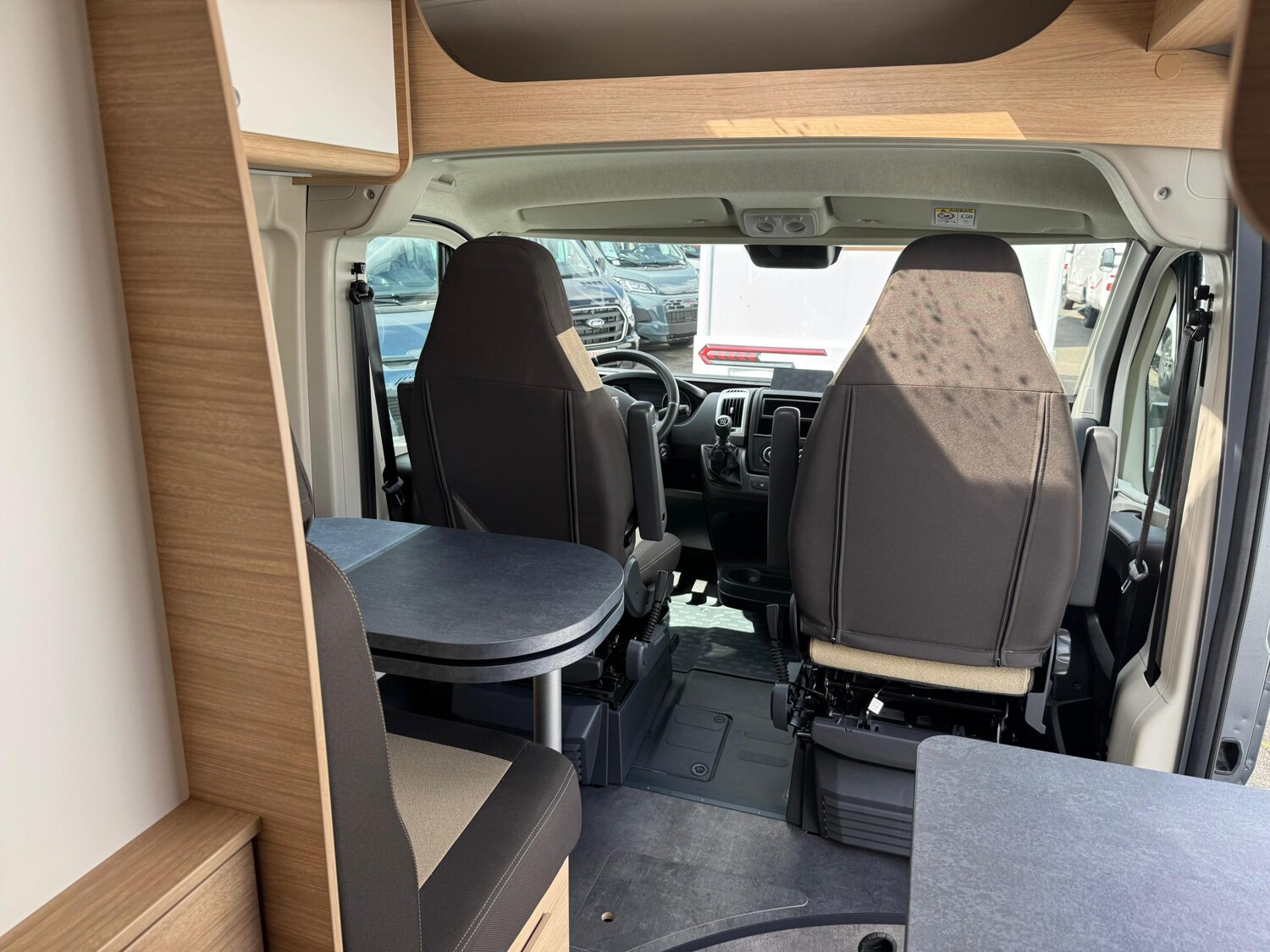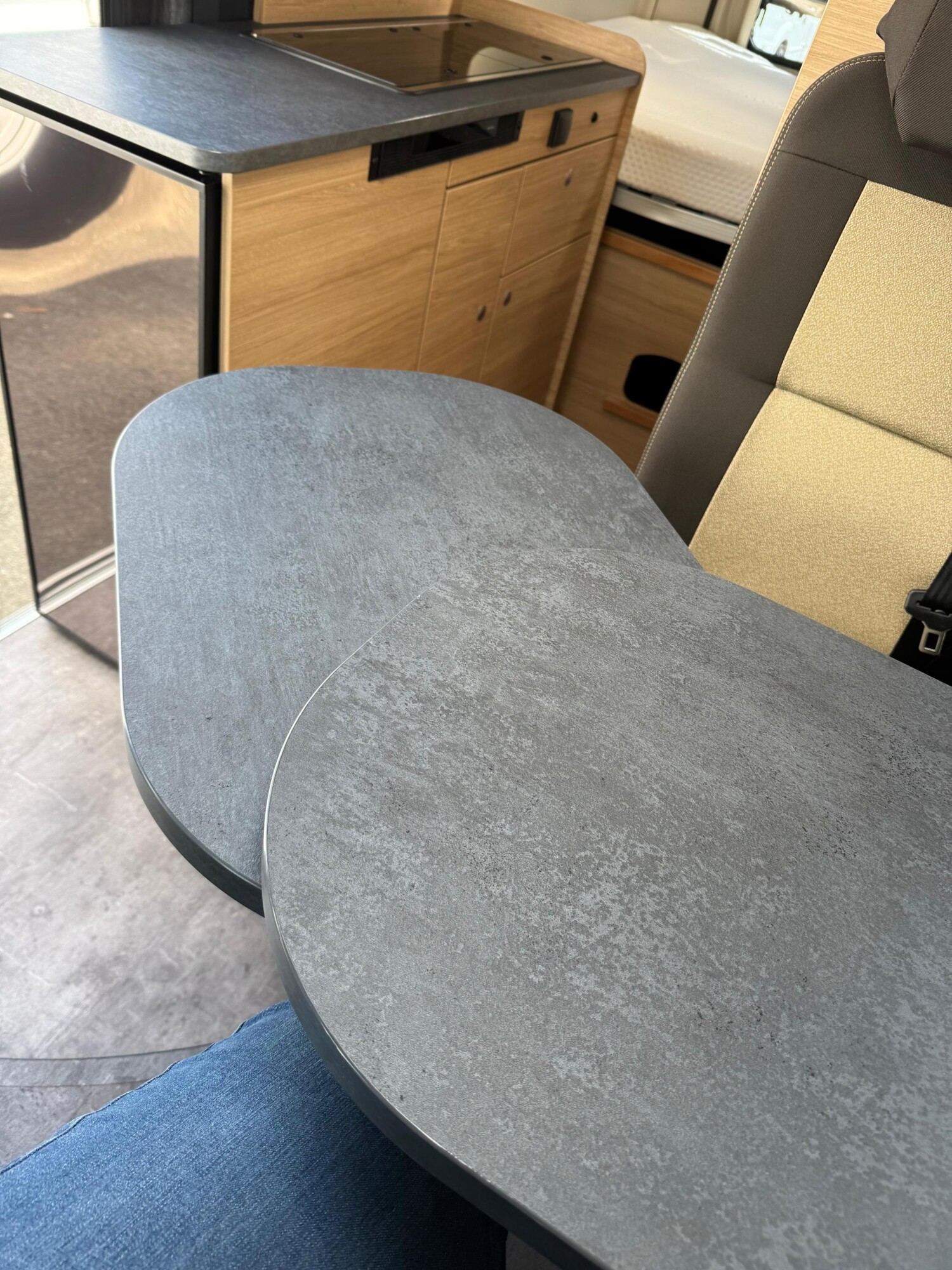 - Seitensitzgruppe, umbaubar zu einer weiteren Schlafmöglichkeit, mit einem Tisch inkl. ausziehbarer Erweiterung, einer Leselampe und einem Stauschrank