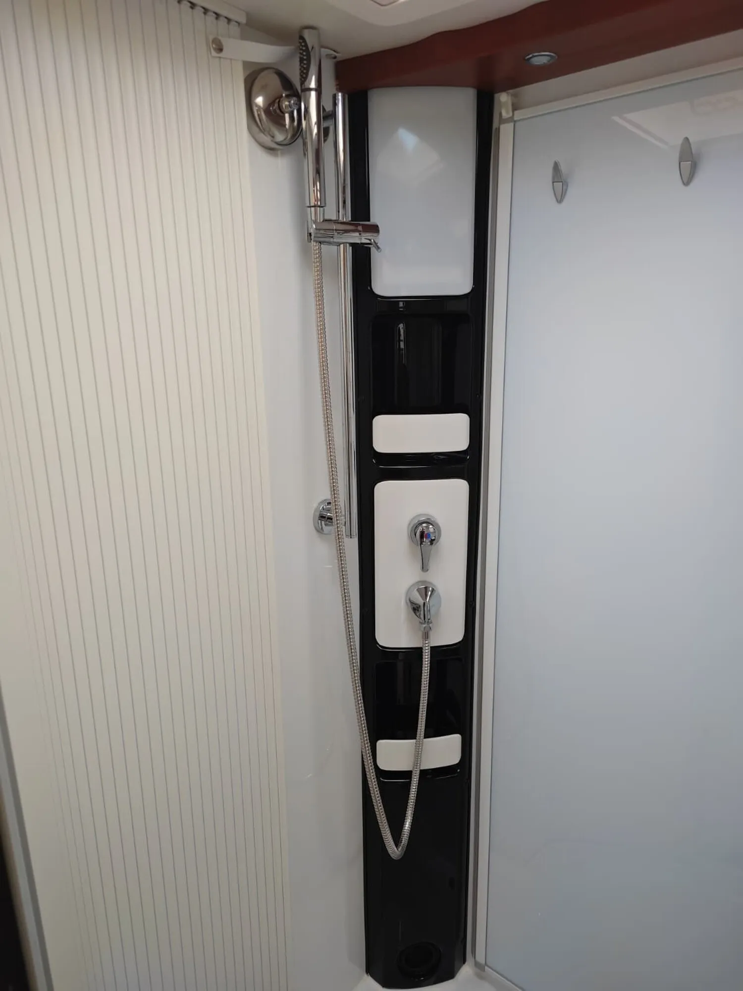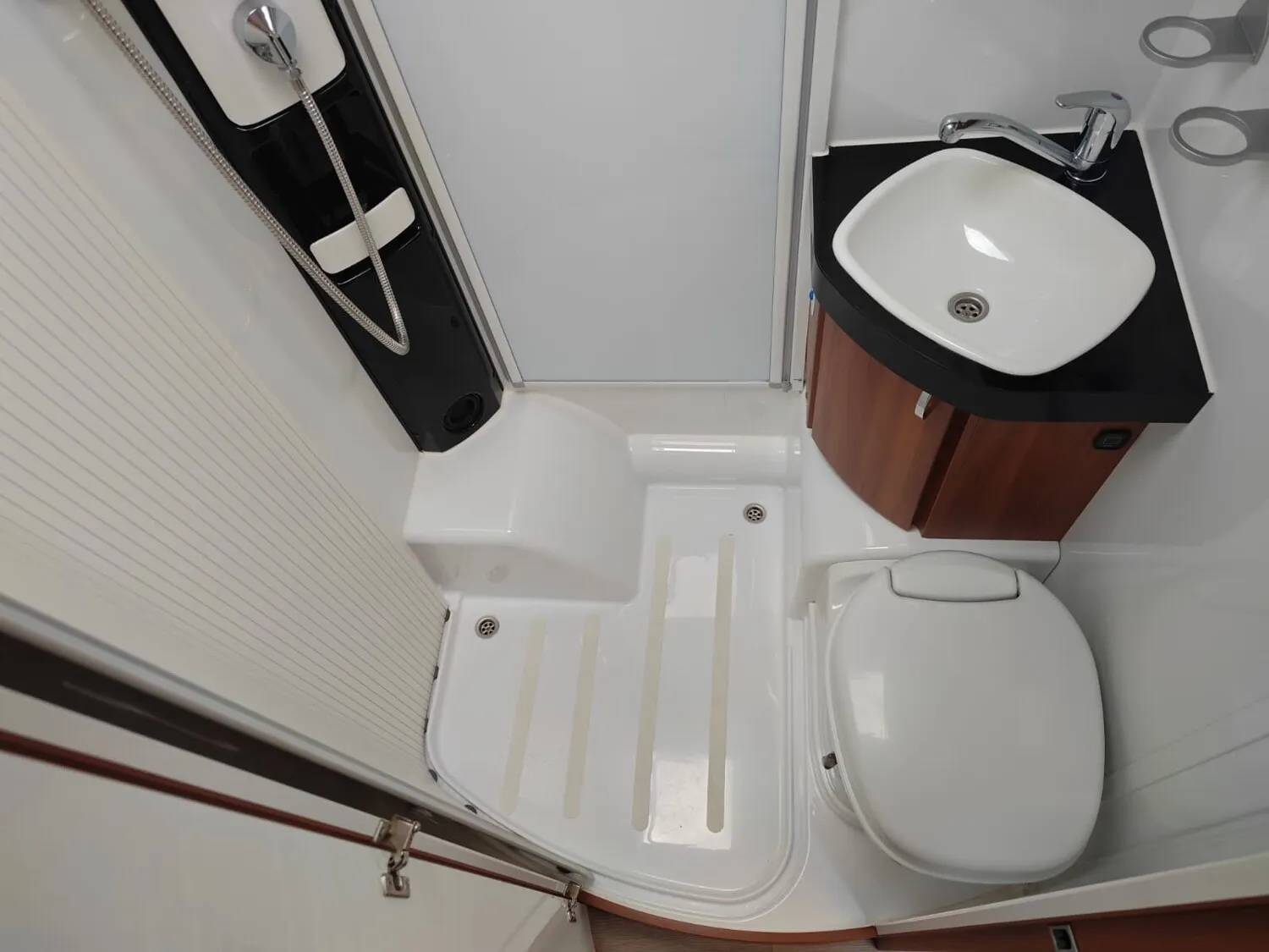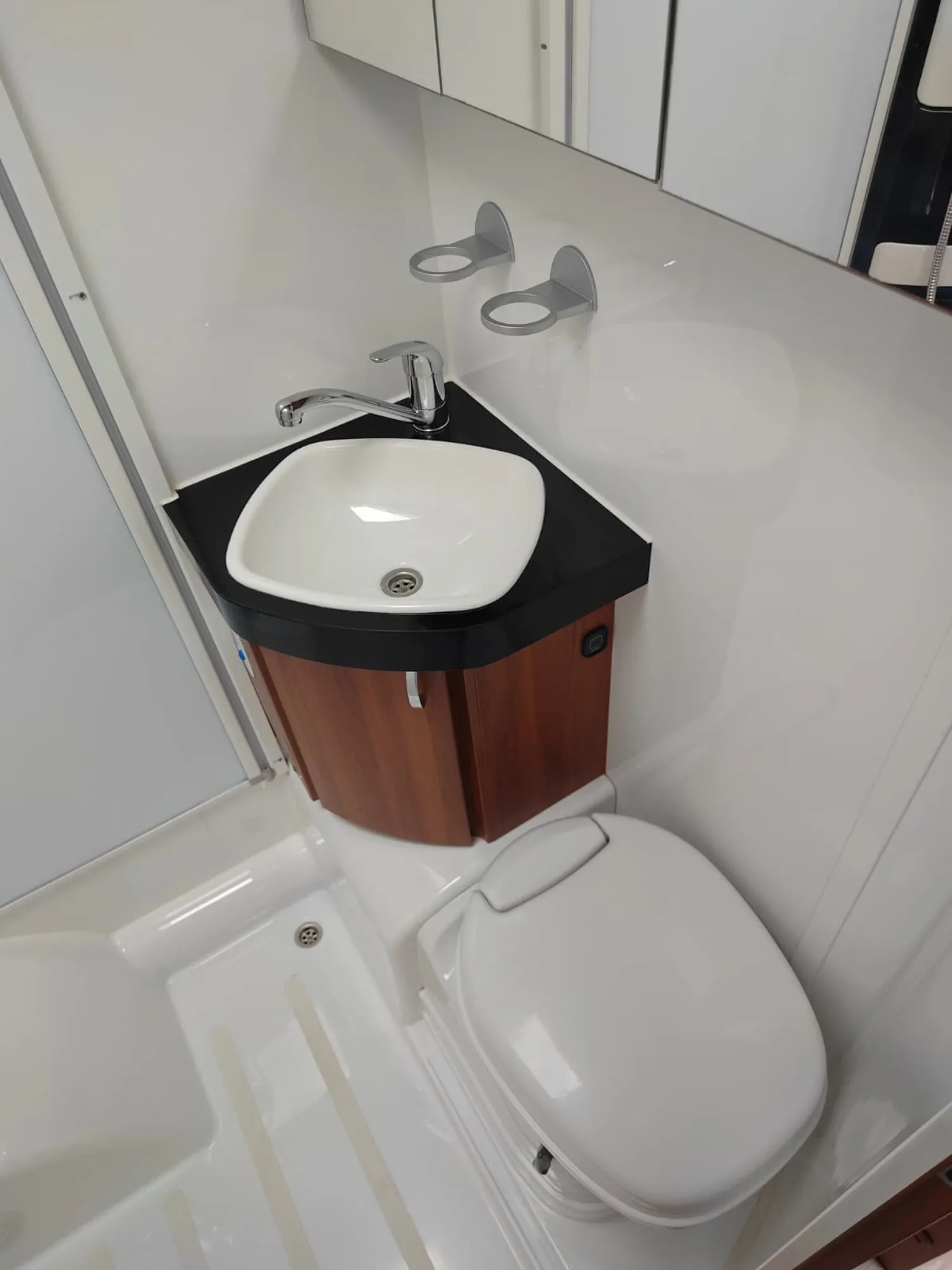 - Nasszelle mit einer Cassettentoilette von Thetford, einem Waschbecken, Spiegelschränken und einer Duschausstattung