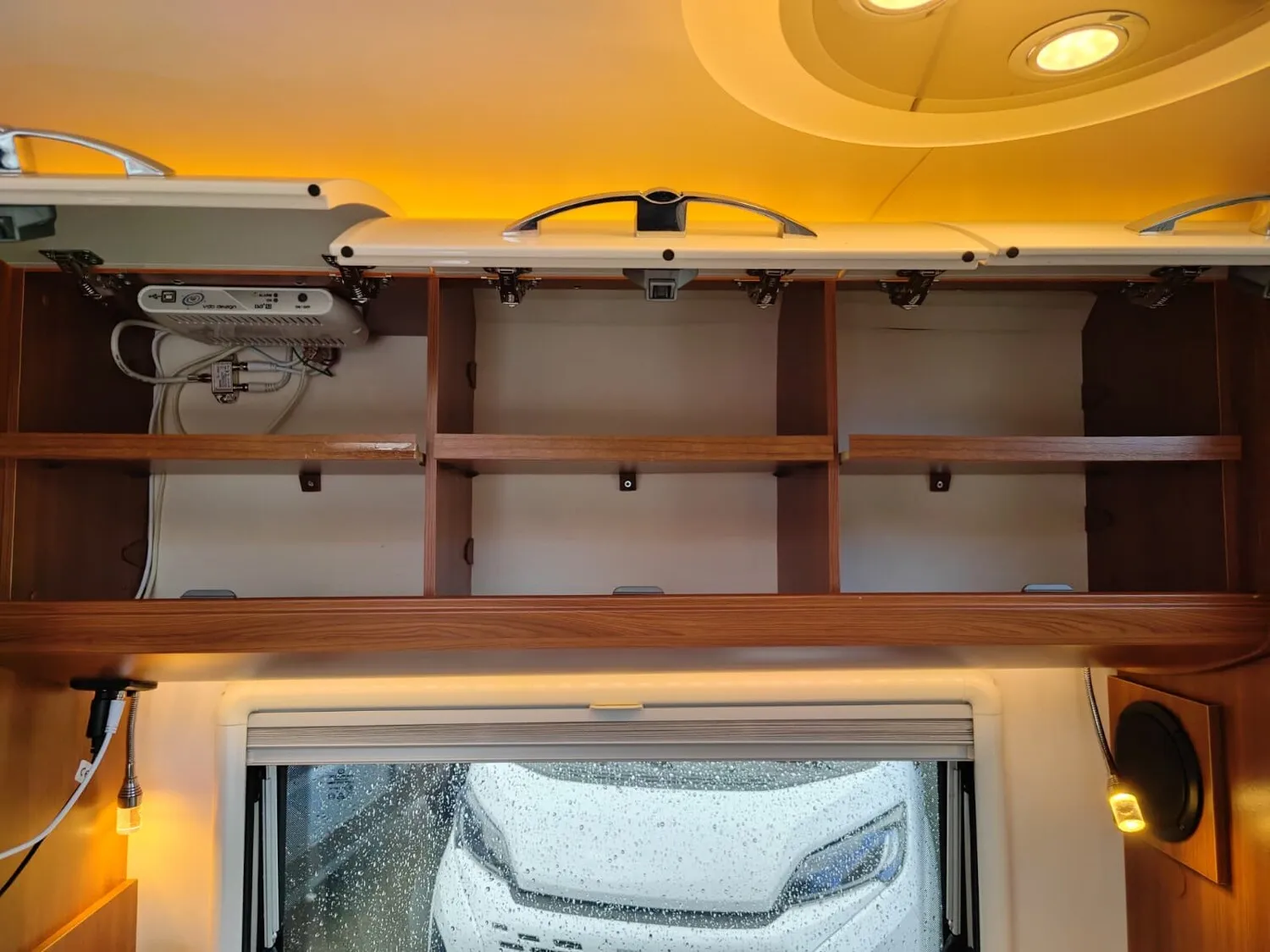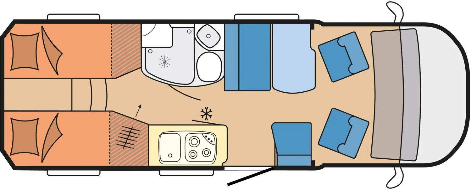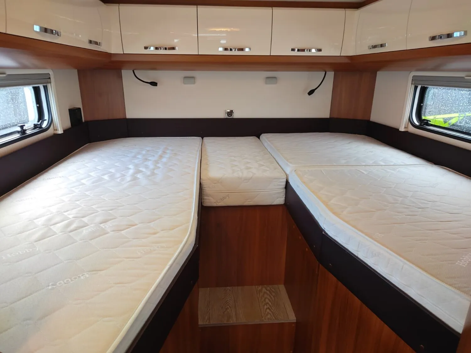 - Einzelbetten im Heck mit Kleiderschränken darunter und umliegenden Dachstauschränken