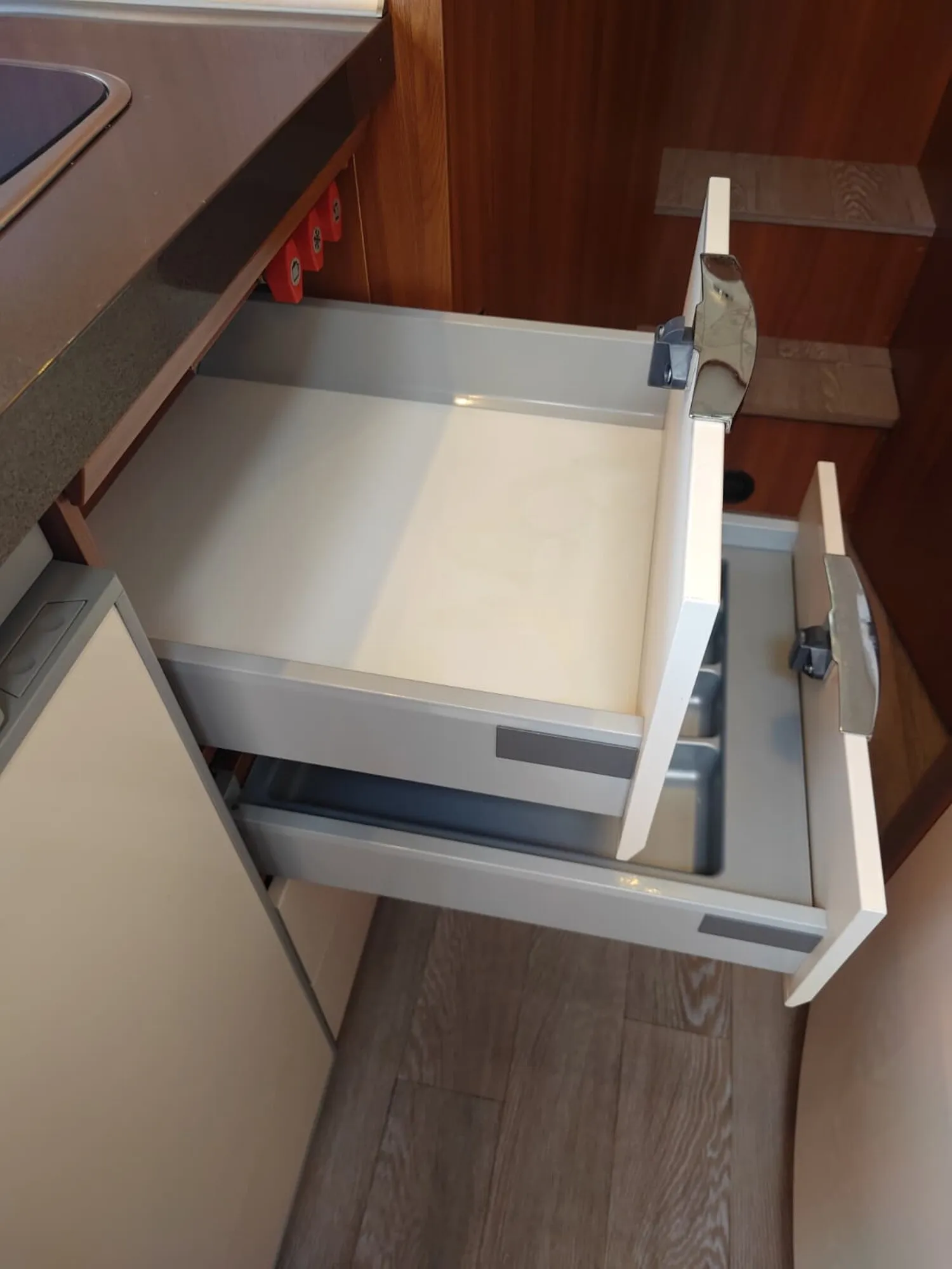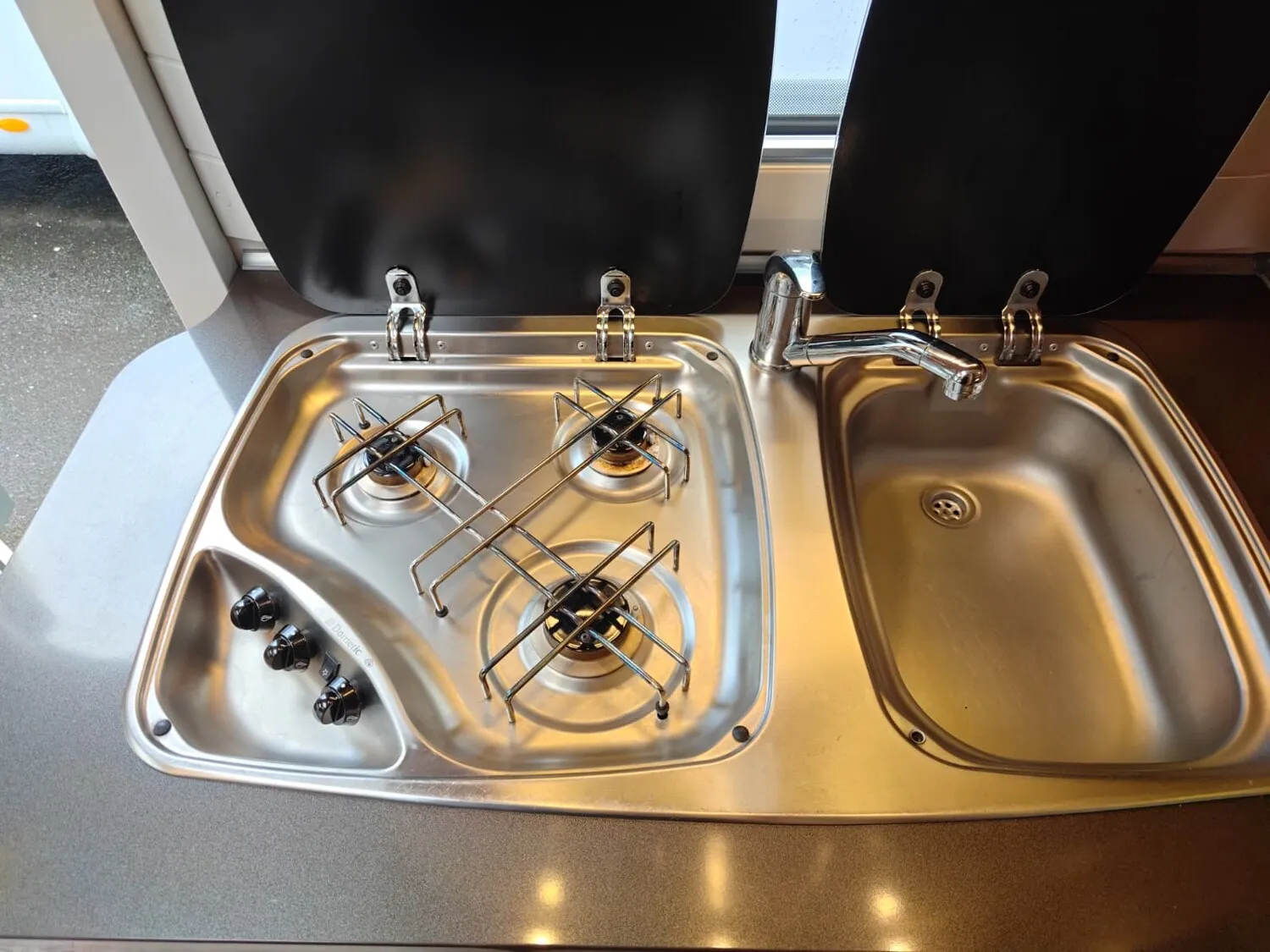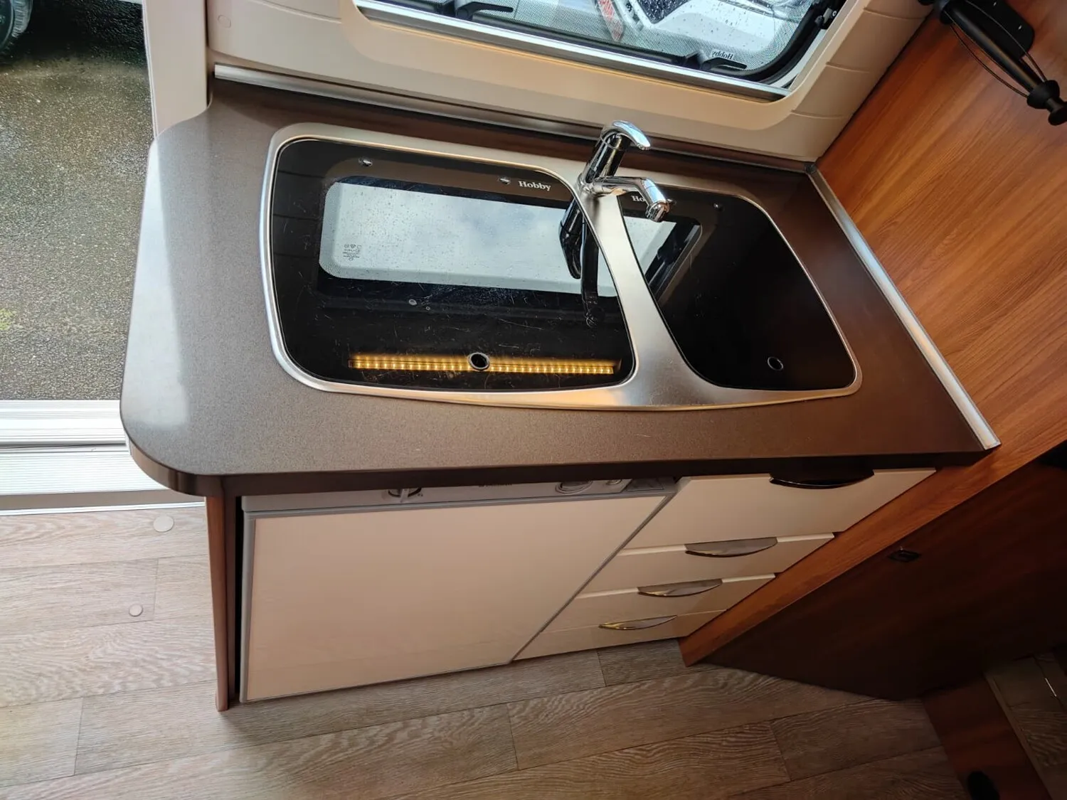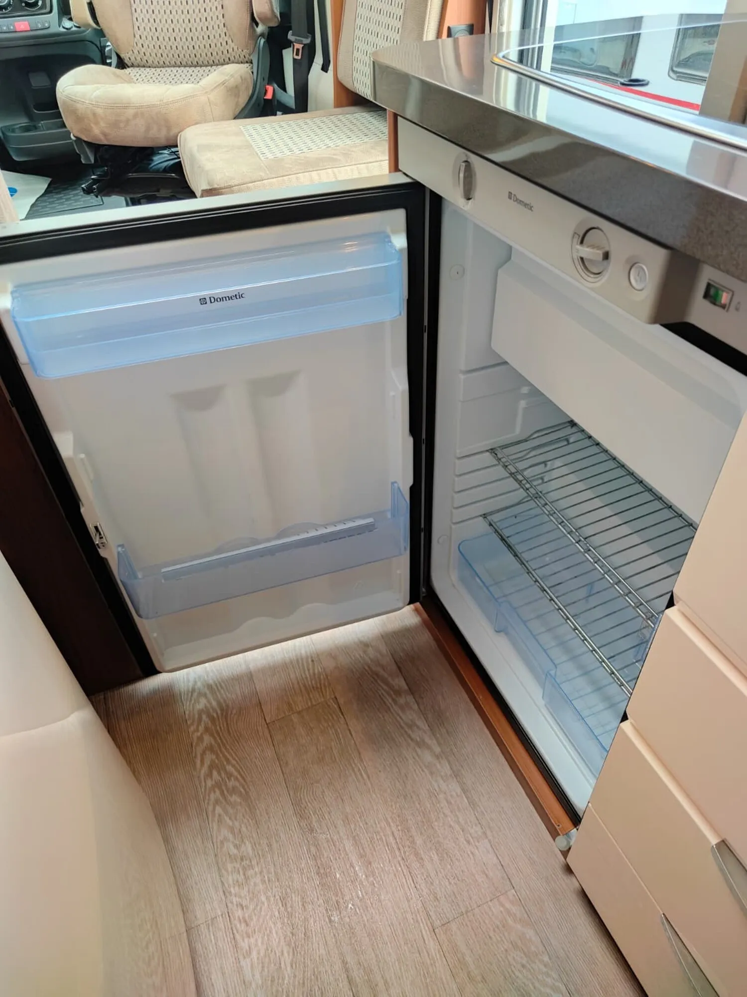 - Küchenzeile mit einem 3-Flammenkocher und einer Spüle inkl. Glasabdeckung, Schubladen, Dachstauschränken und einem Kühlschrank inkl. Eisfach