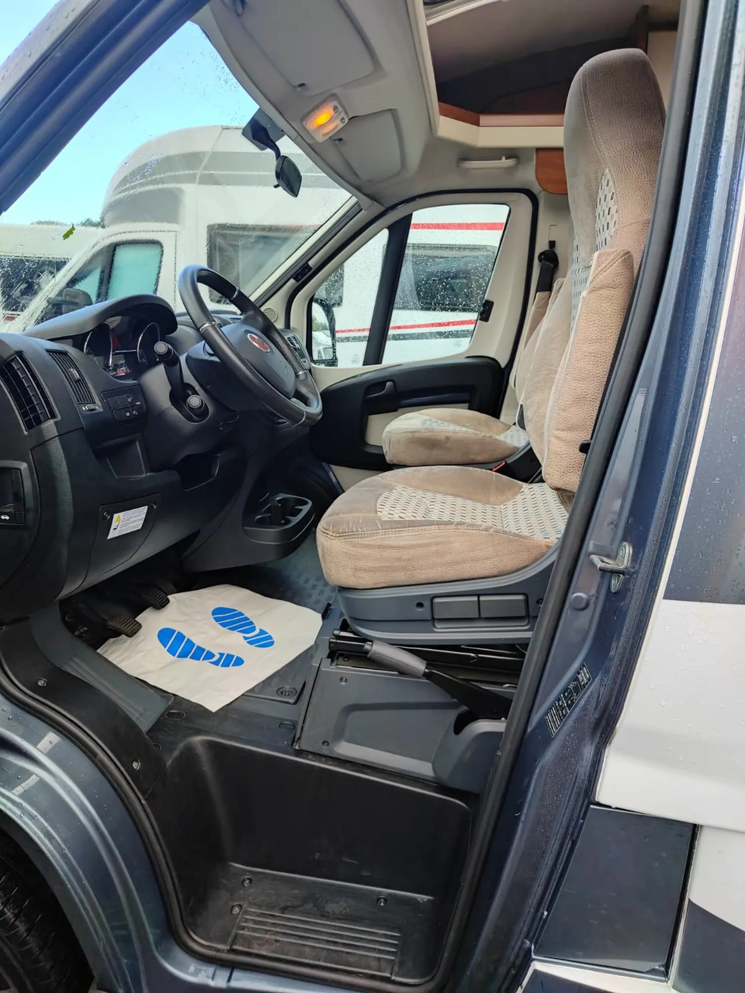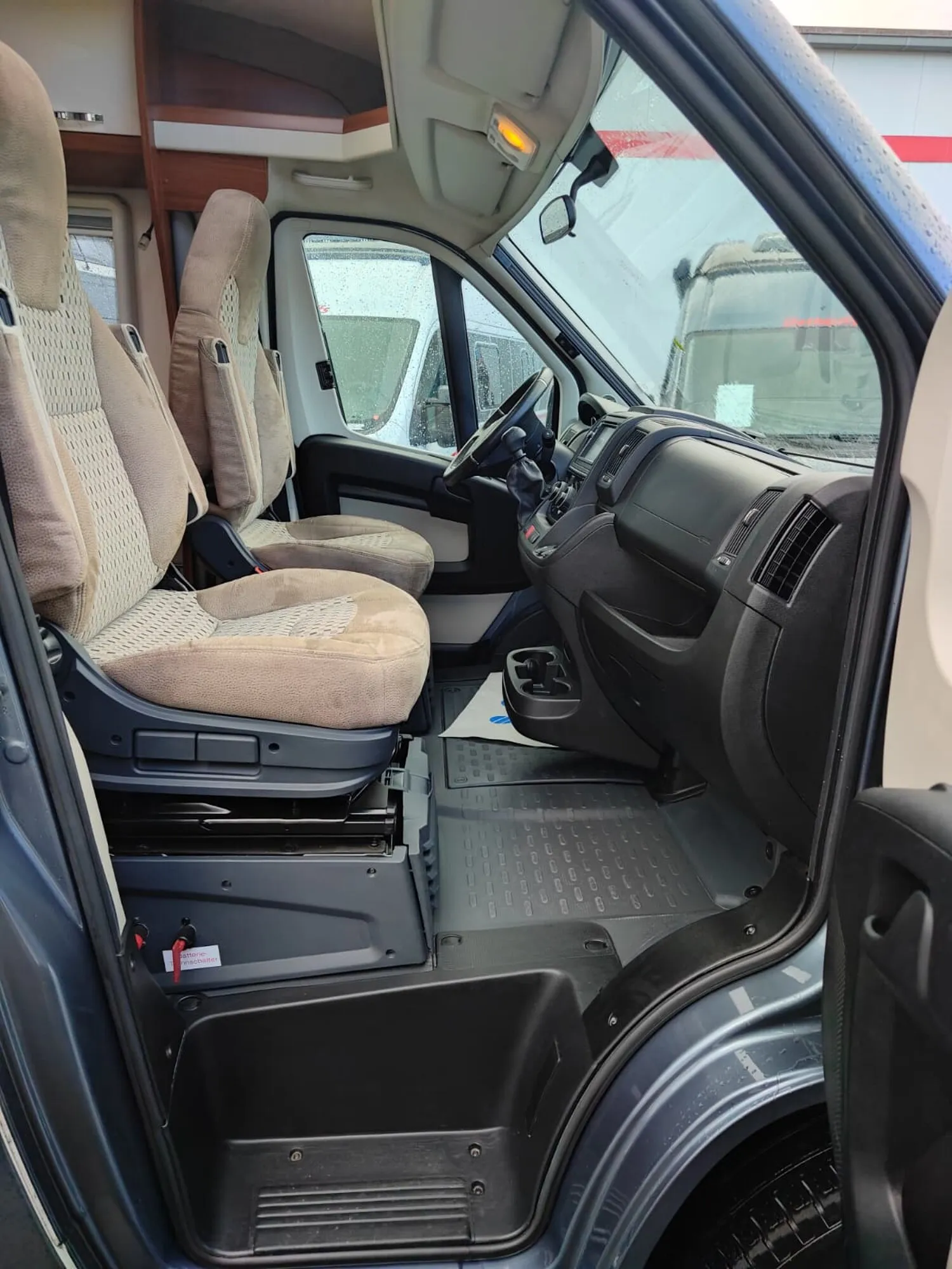 - Fahrerhaussitze drehbar, in Wohnraumstoff bezogen