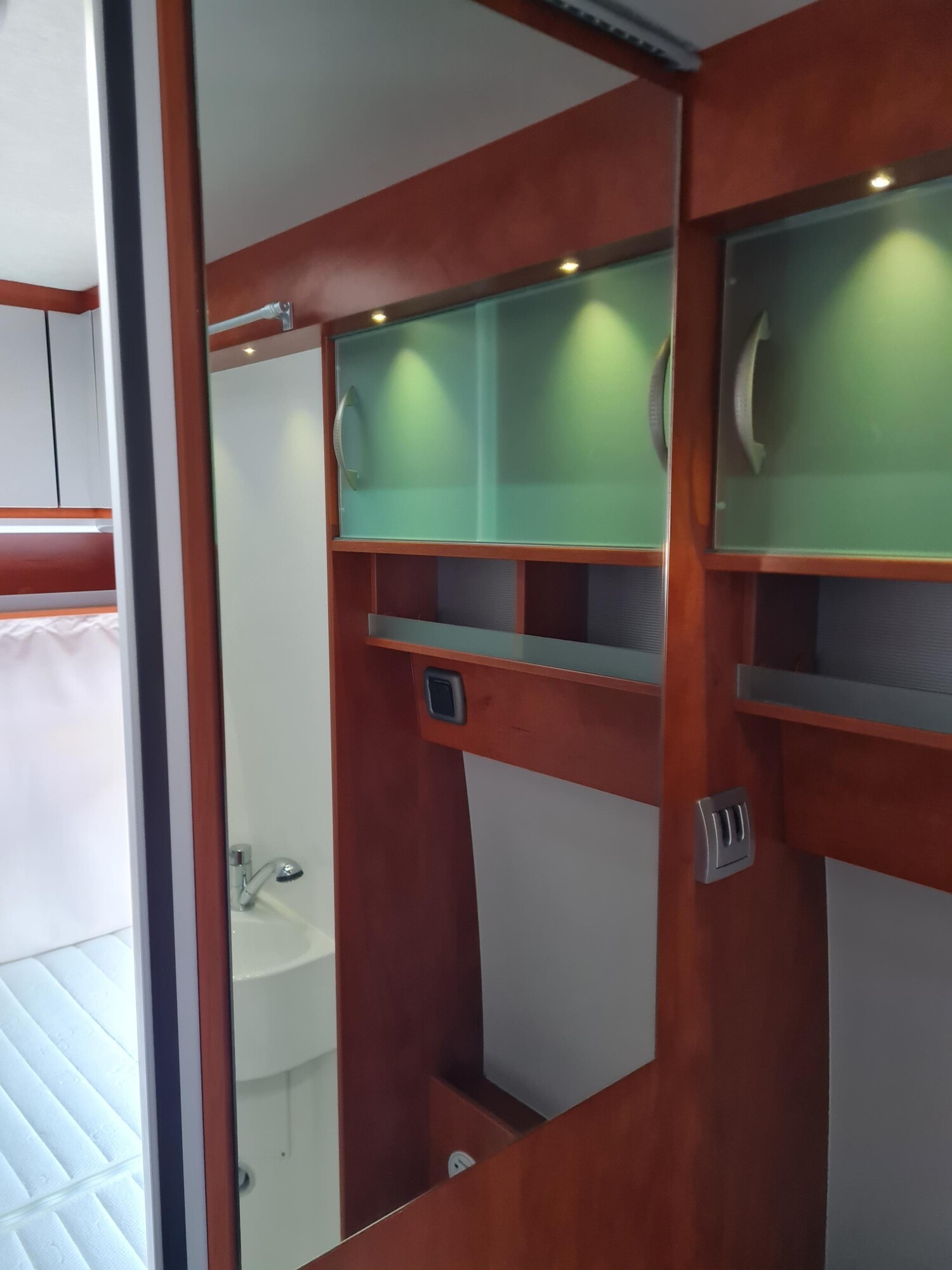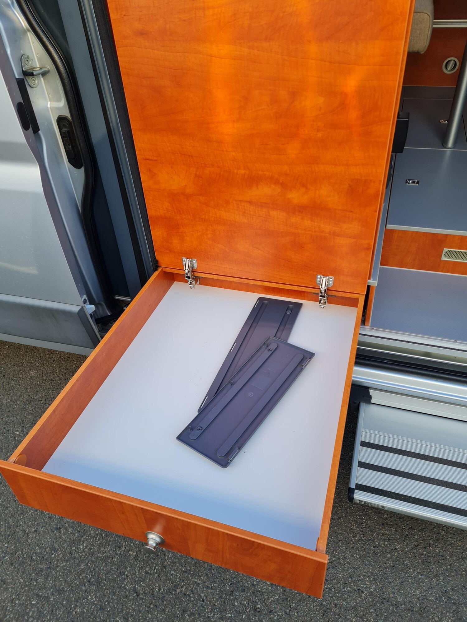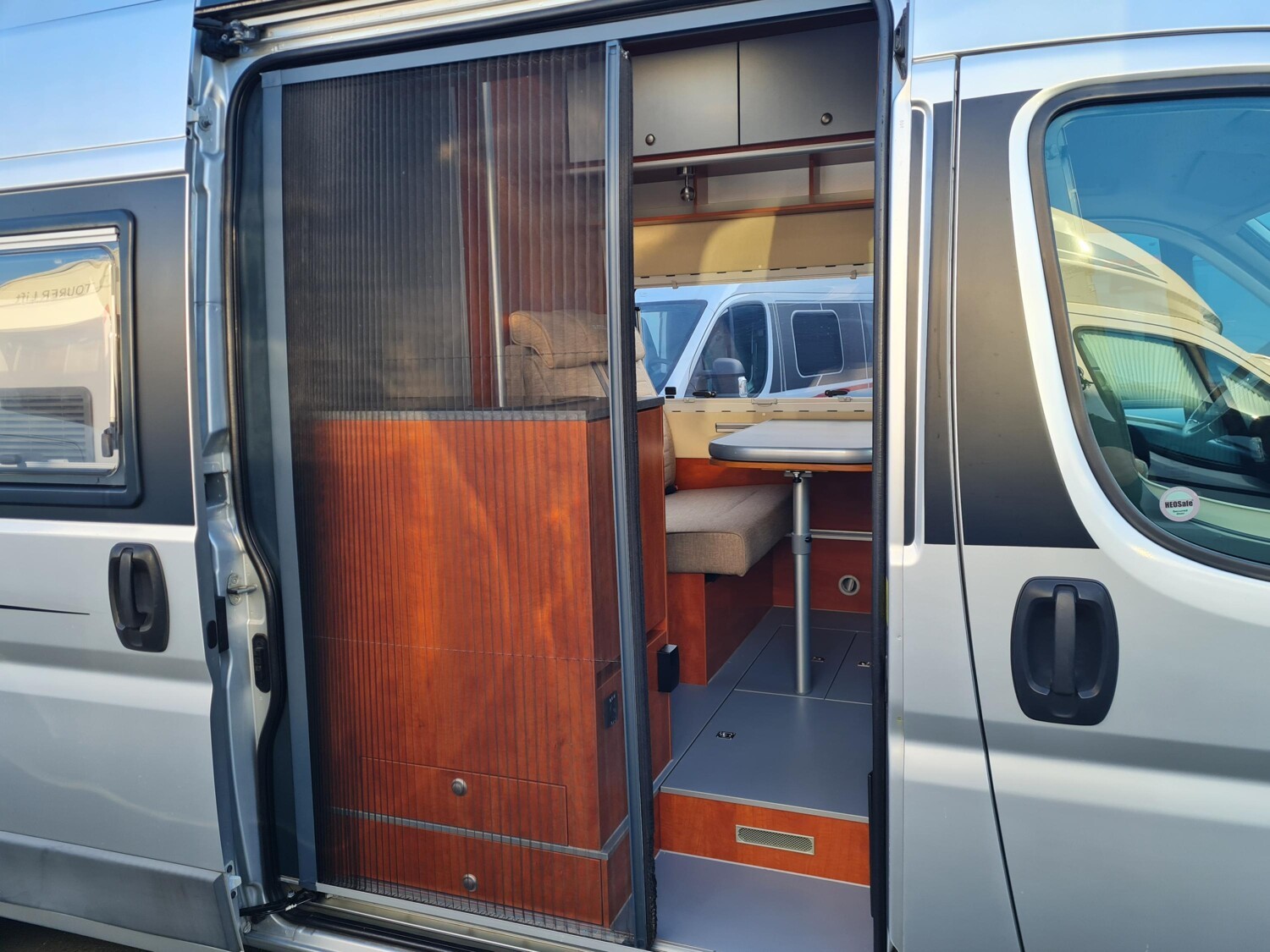 - Schiebetür mit einer elektrischen Trittstufe, einer Fliegenschutztür, ausziehbaren Schubladen der Küchenzeile von außen und einem LED-Leuchtstreifen über der Tür