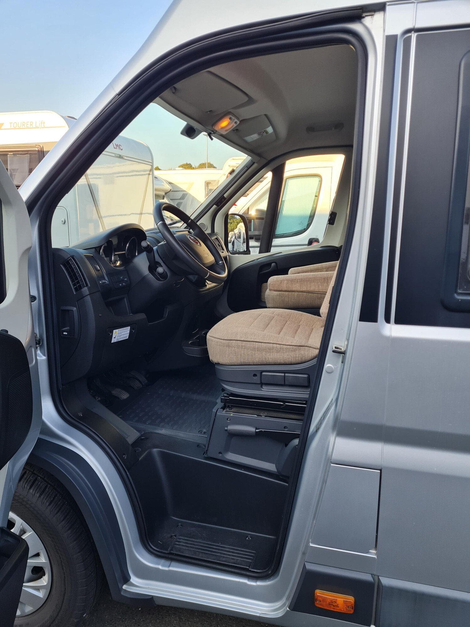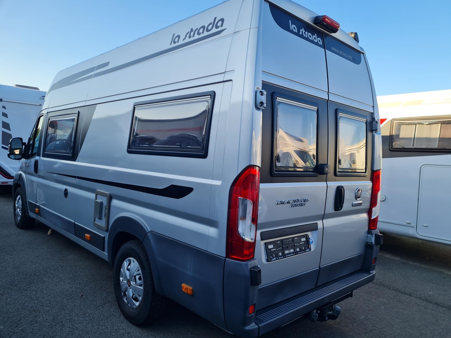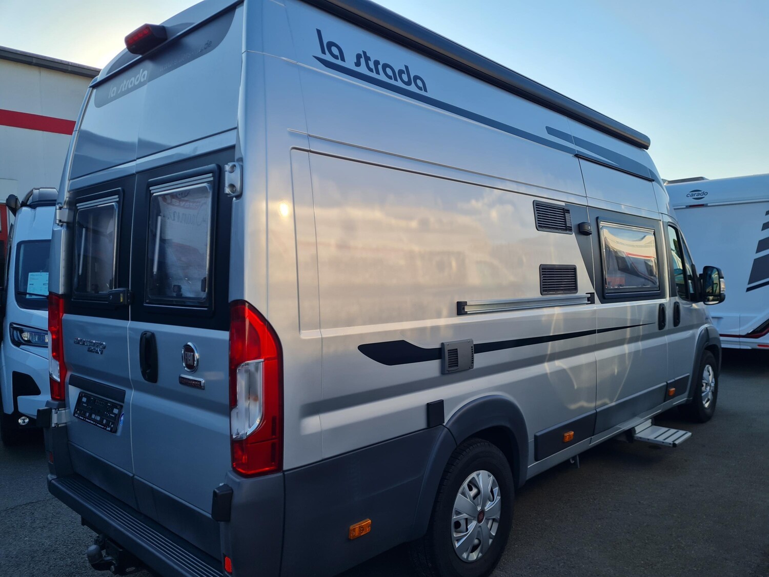 - Schiebetür mit einer elektrischen Trittstufe, einer Fliegenschutztür, ausziehbaren Schubladen der Küchenzeile von außen und einem LED-Leuchtstreifen über der Tür