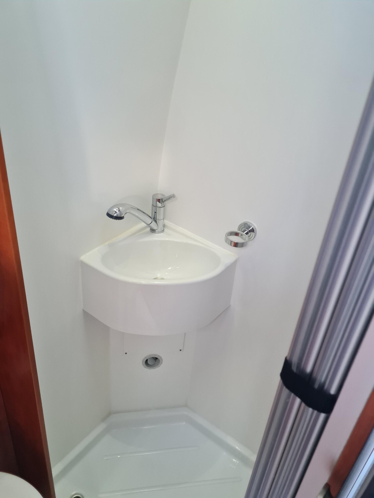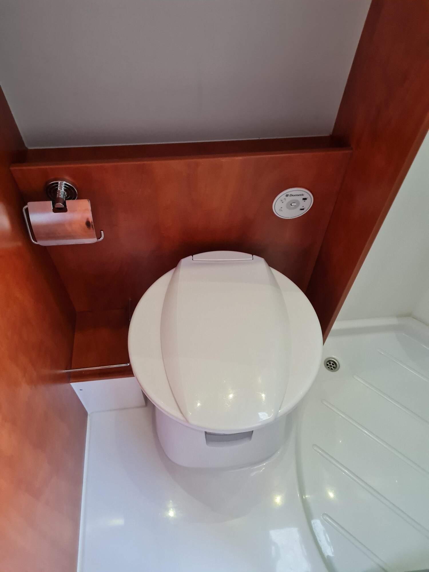 - Nasszelle mit einer Cassettentoilette von Dometic, einer separaten Duschkabine mit einem Waschbecken