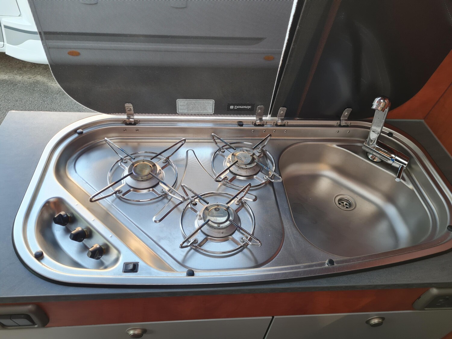 - Küchenzeile mit einem 3-Flammenkocher und einer Spüle inkl. Glasabdeckung, Schubladen und Dachstauschränken