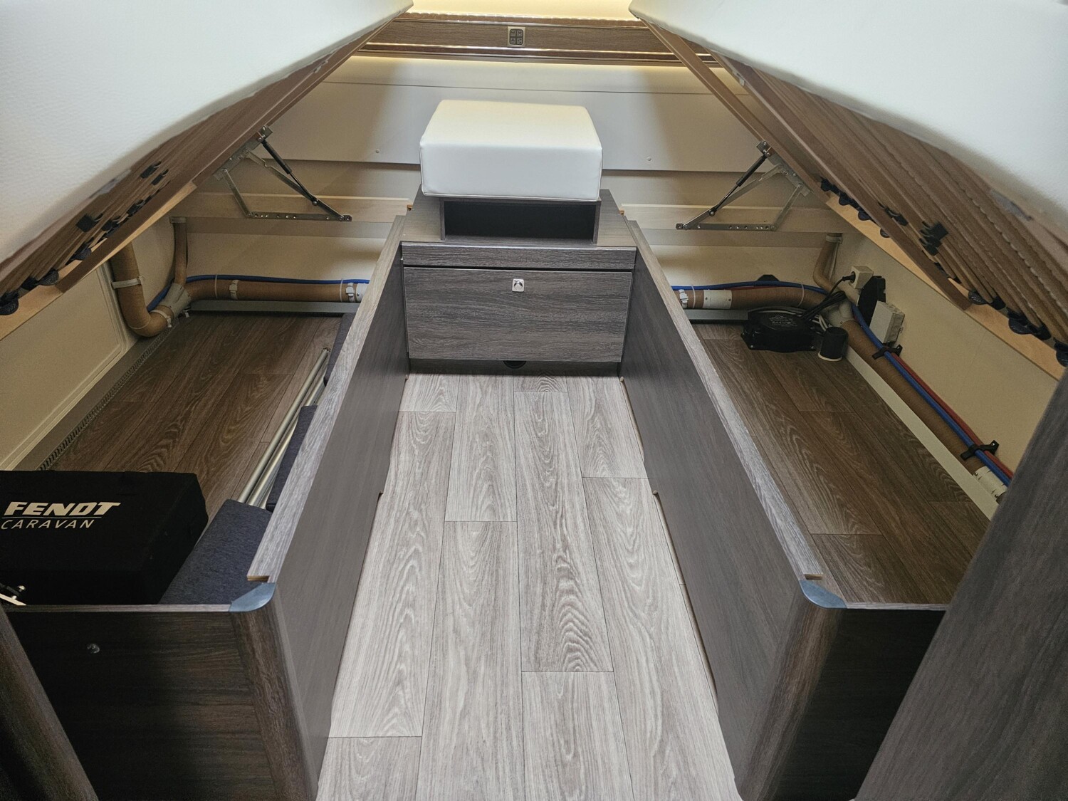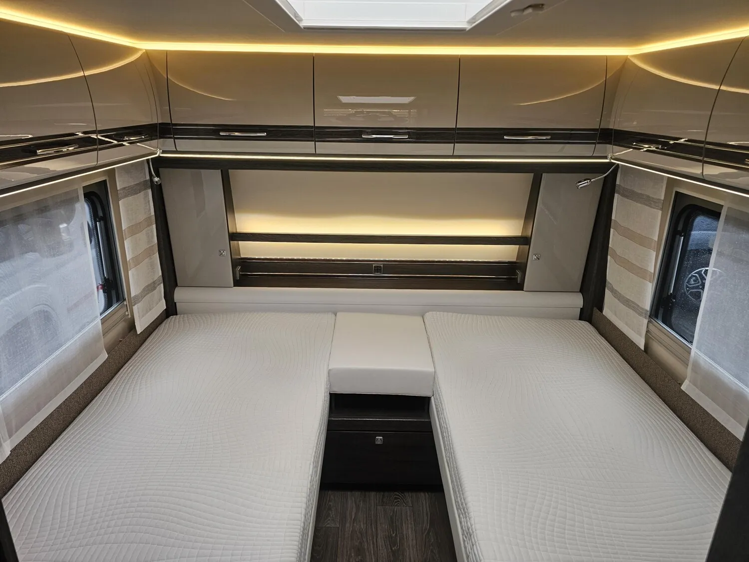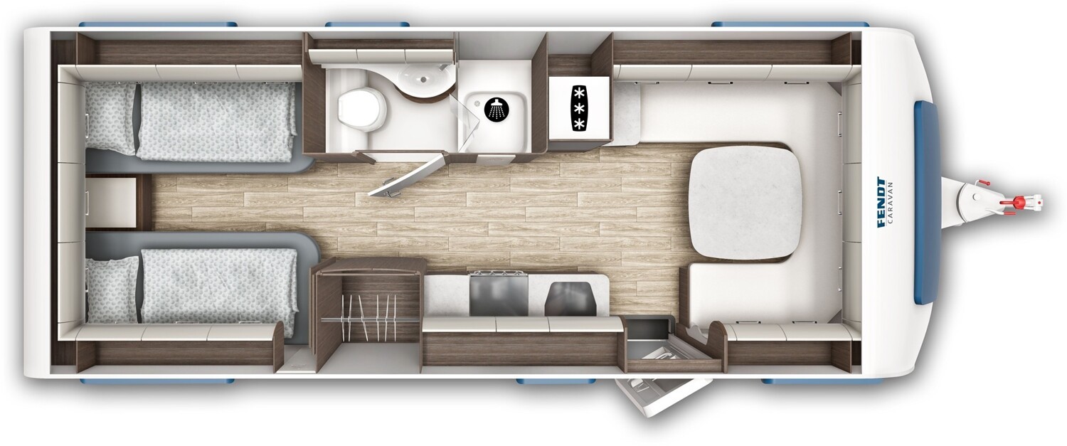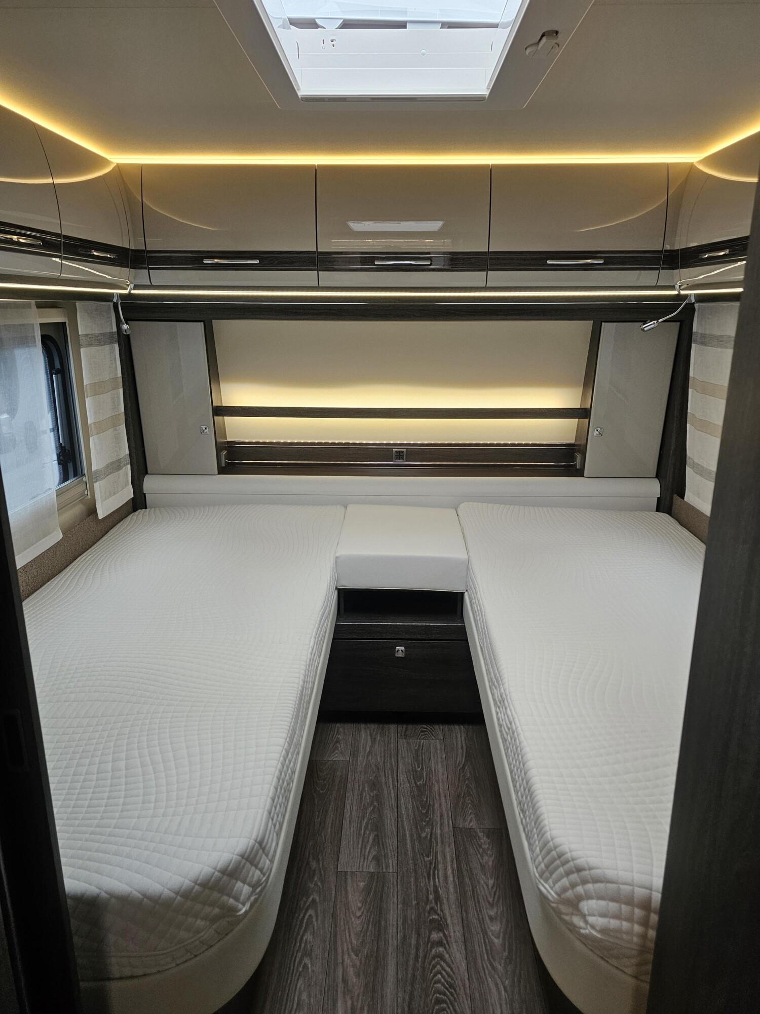 - Einzelbetten im Heck mit einer Trennschiebewand zum Wohnbereich