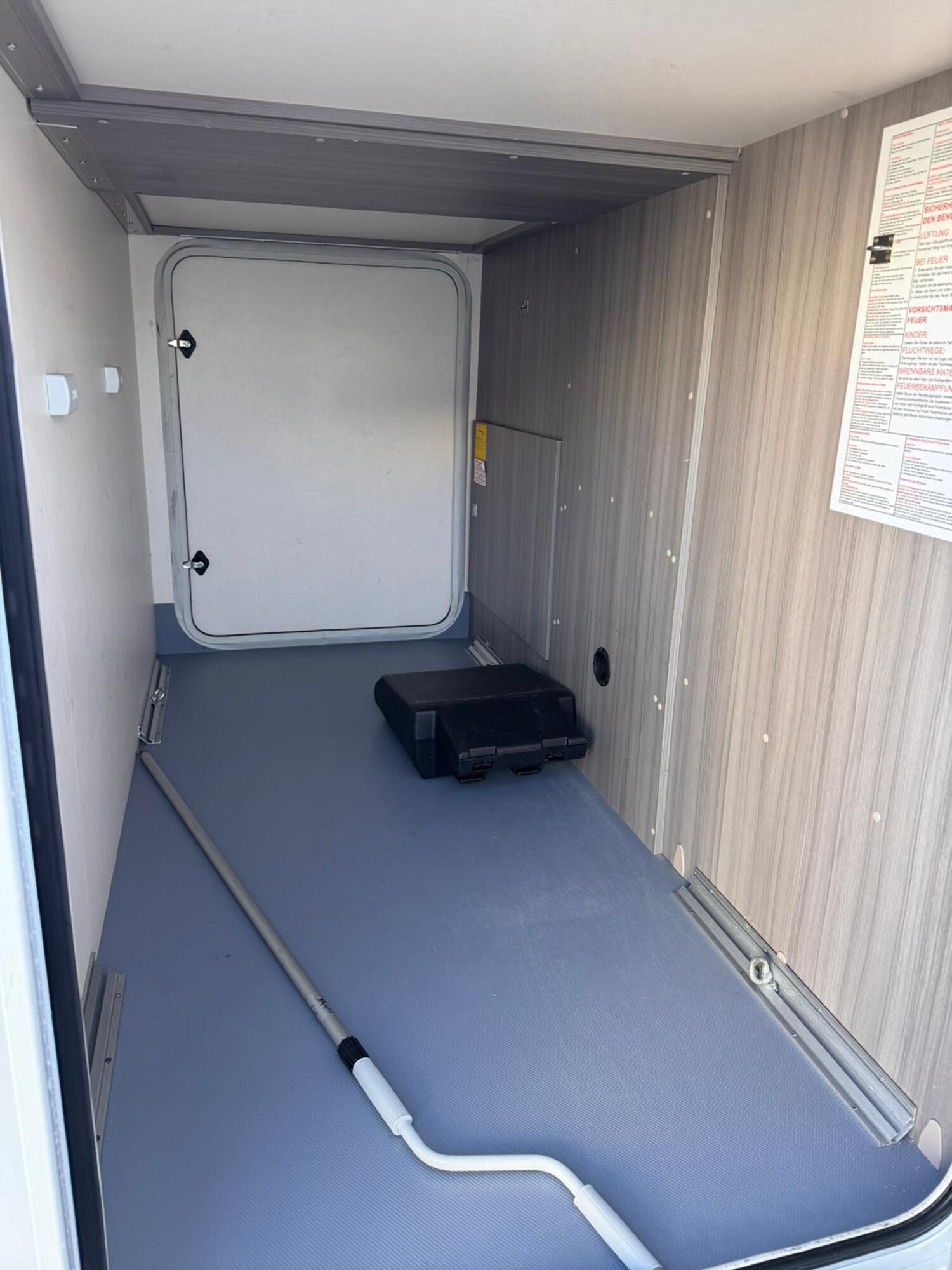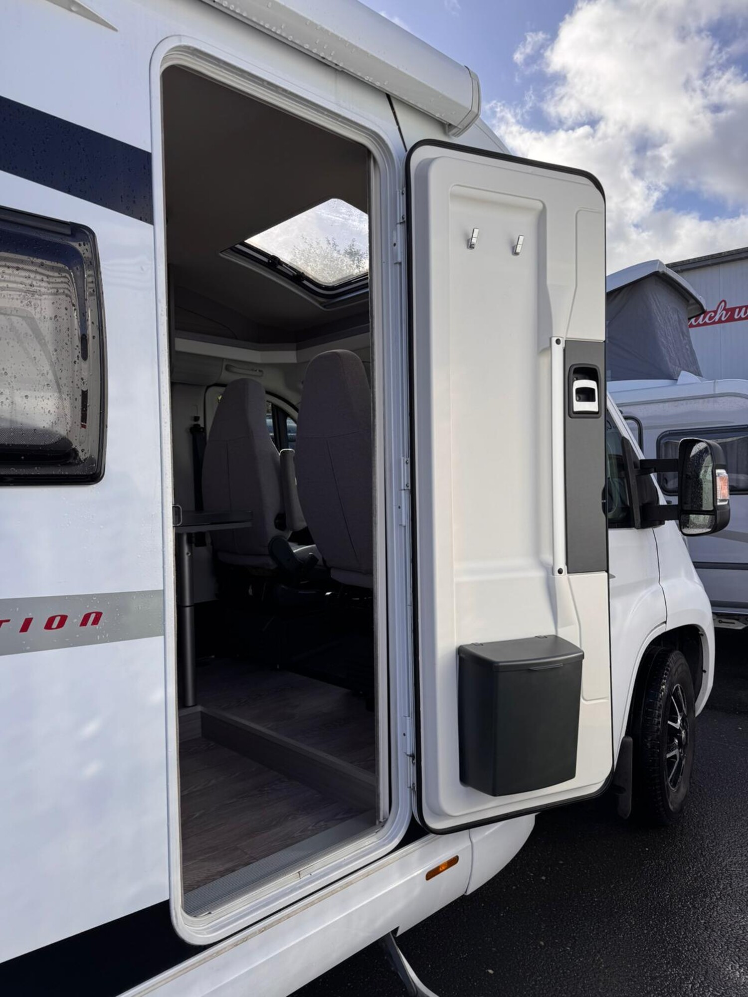 - Aufbautür mit einer Fliegenschutztür, einem Mülleimer, einer Garderobe und einem Einstiegsgriff