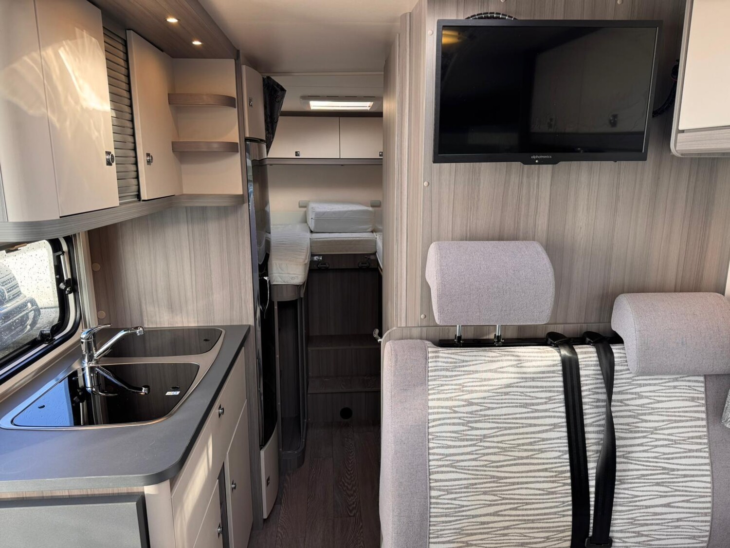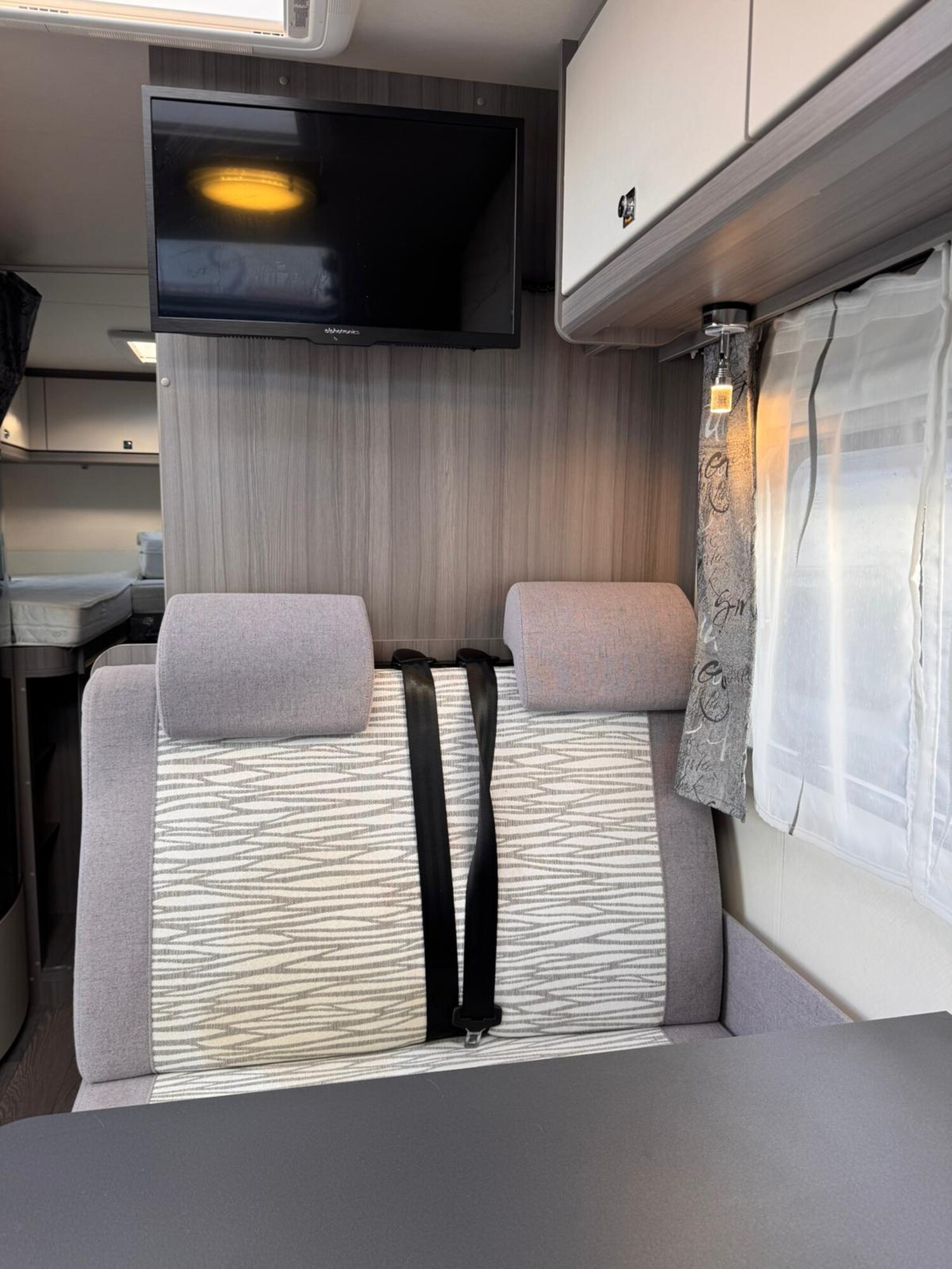 - Einzelbetten im Heck inkl. Polster für eine Bettverbreiterung, Stauraum unter den Betten, Leselampen und umliegenden Stauschränken