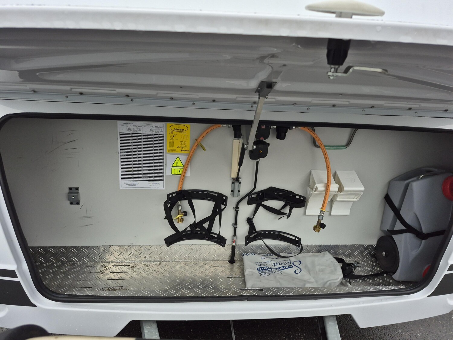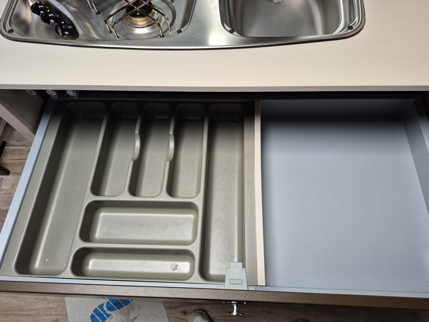 - Küchenzeile mit einem 3-Flammenkocher, einem Spülbecken sowie Stauschränken unf Staufächern
