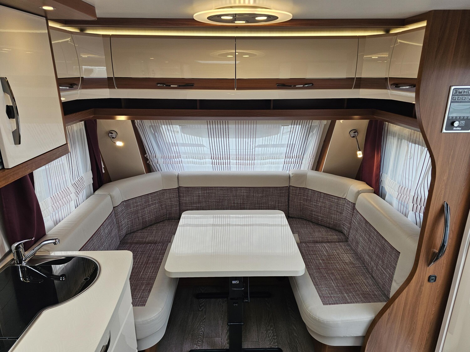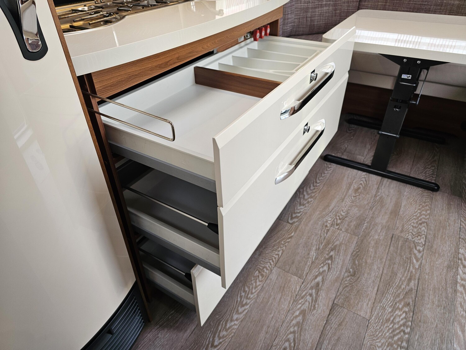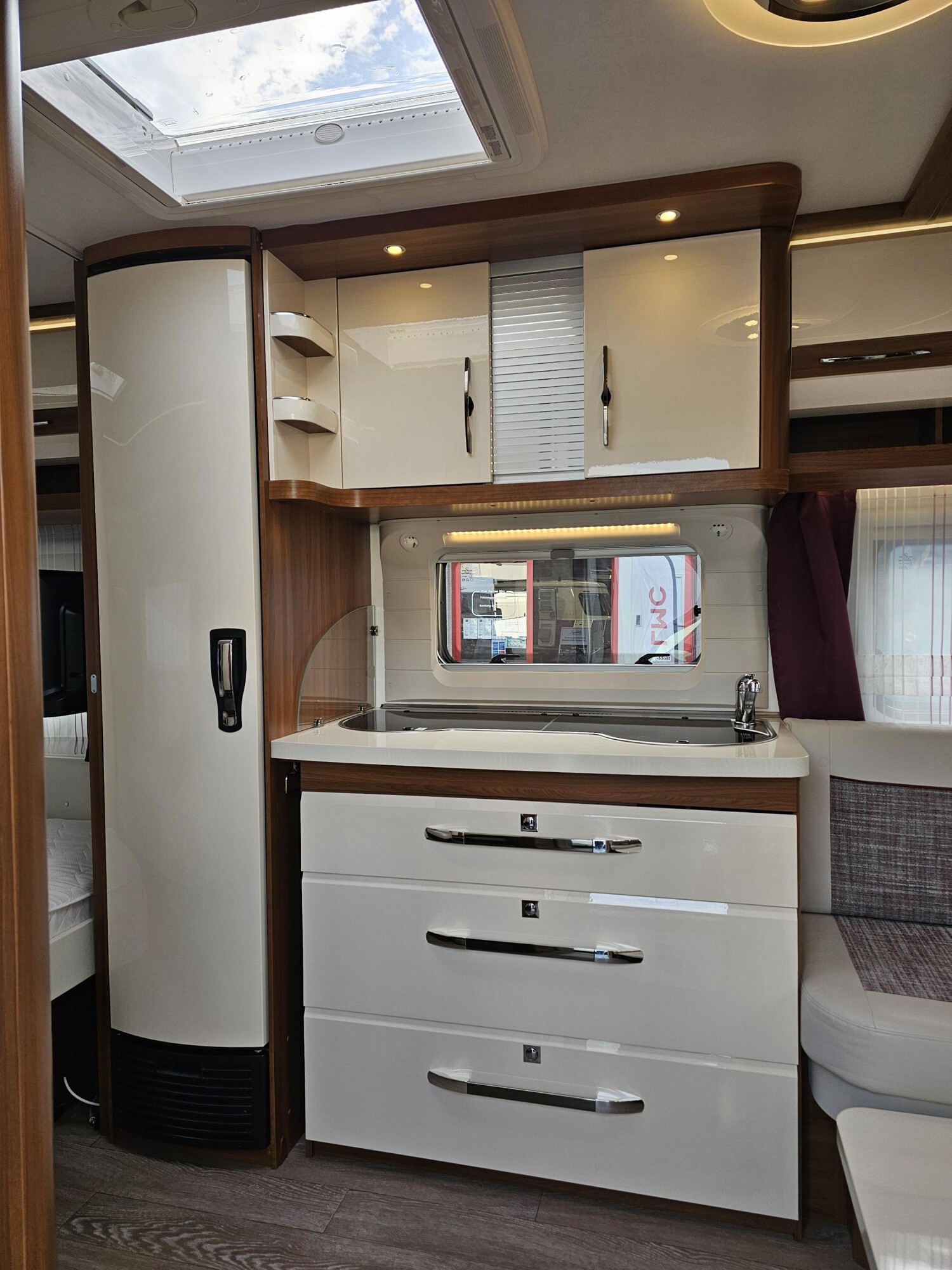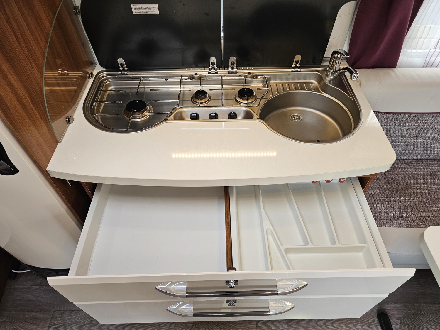 - Küchenzeile mit einem 3-Flammenkocher und einer Spüle mit Glasabdeckung, großzügige Schubladen, einem großen Dometic Kühlschrank mit kleinem Eisfach
