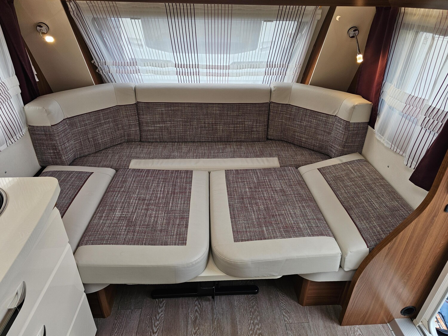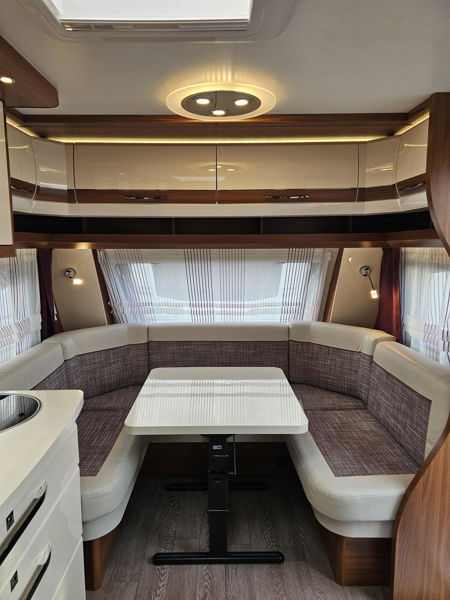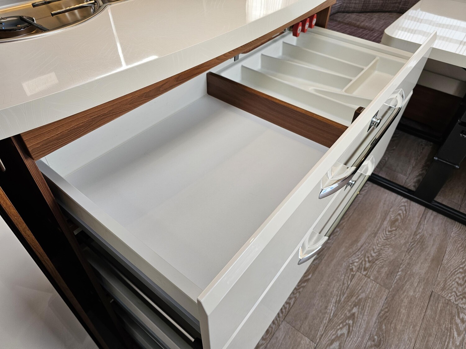 - Küchenzeile mit einem 3-Flammenkocher und einer Spüle mit Glasabdeckung, großzügige Schubladen, einem großen Dometic Kühlschrank mit kleinem Eisfach