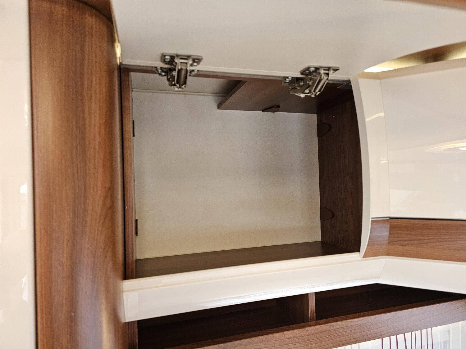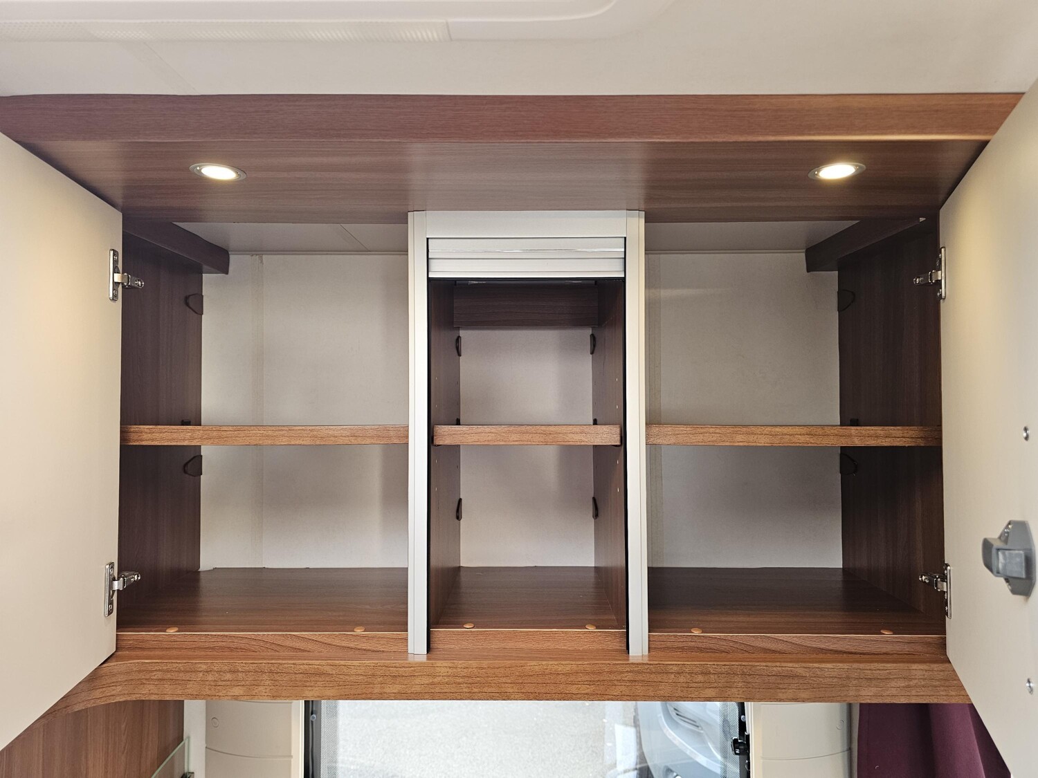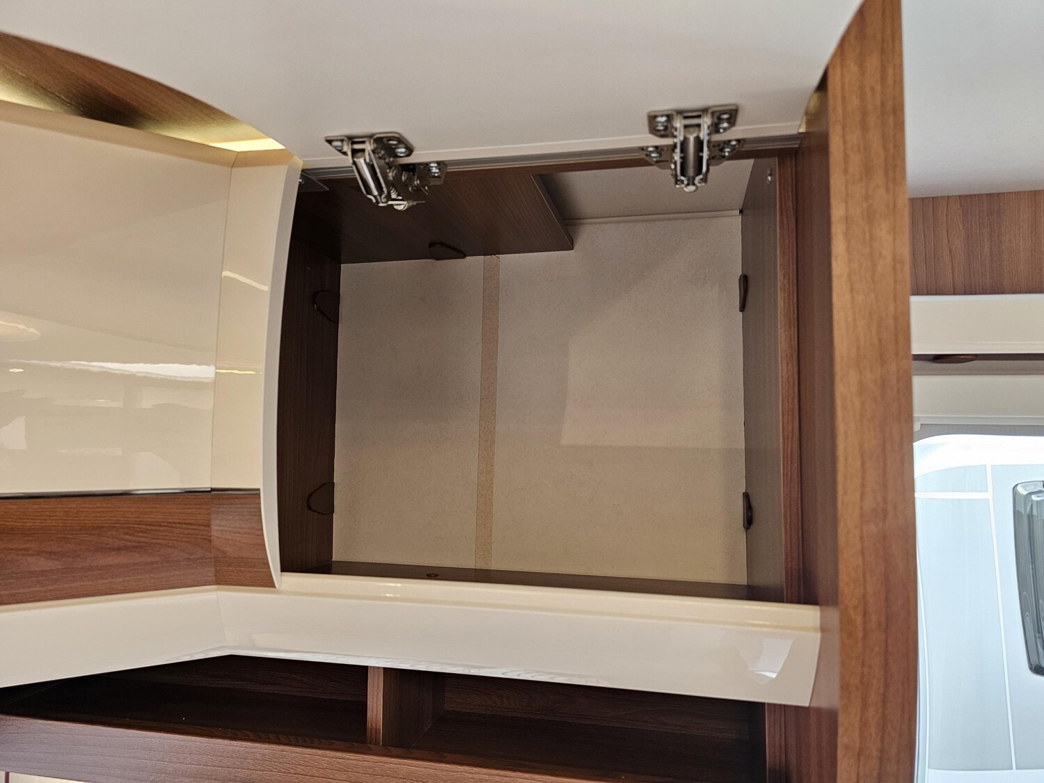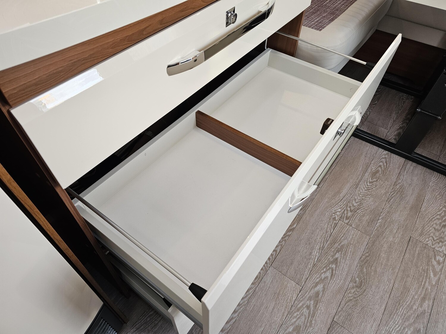 - Küchenzeile mit einem 3-Flammenkocher und einer Spüle mit Glasabdeckung, großzügige Schubladen, einem großen Dometic Kühlschrank mit kleinem Eisfach