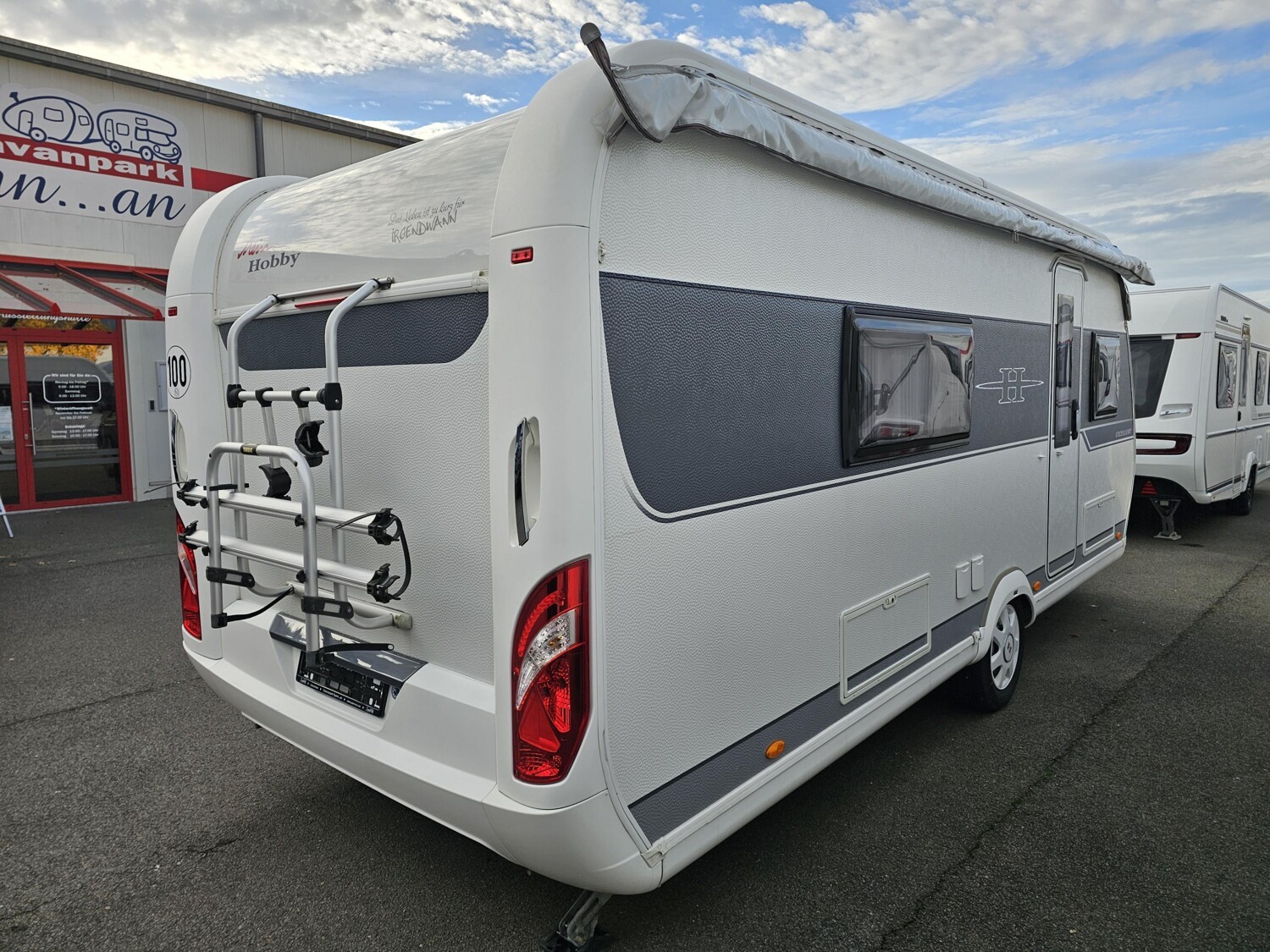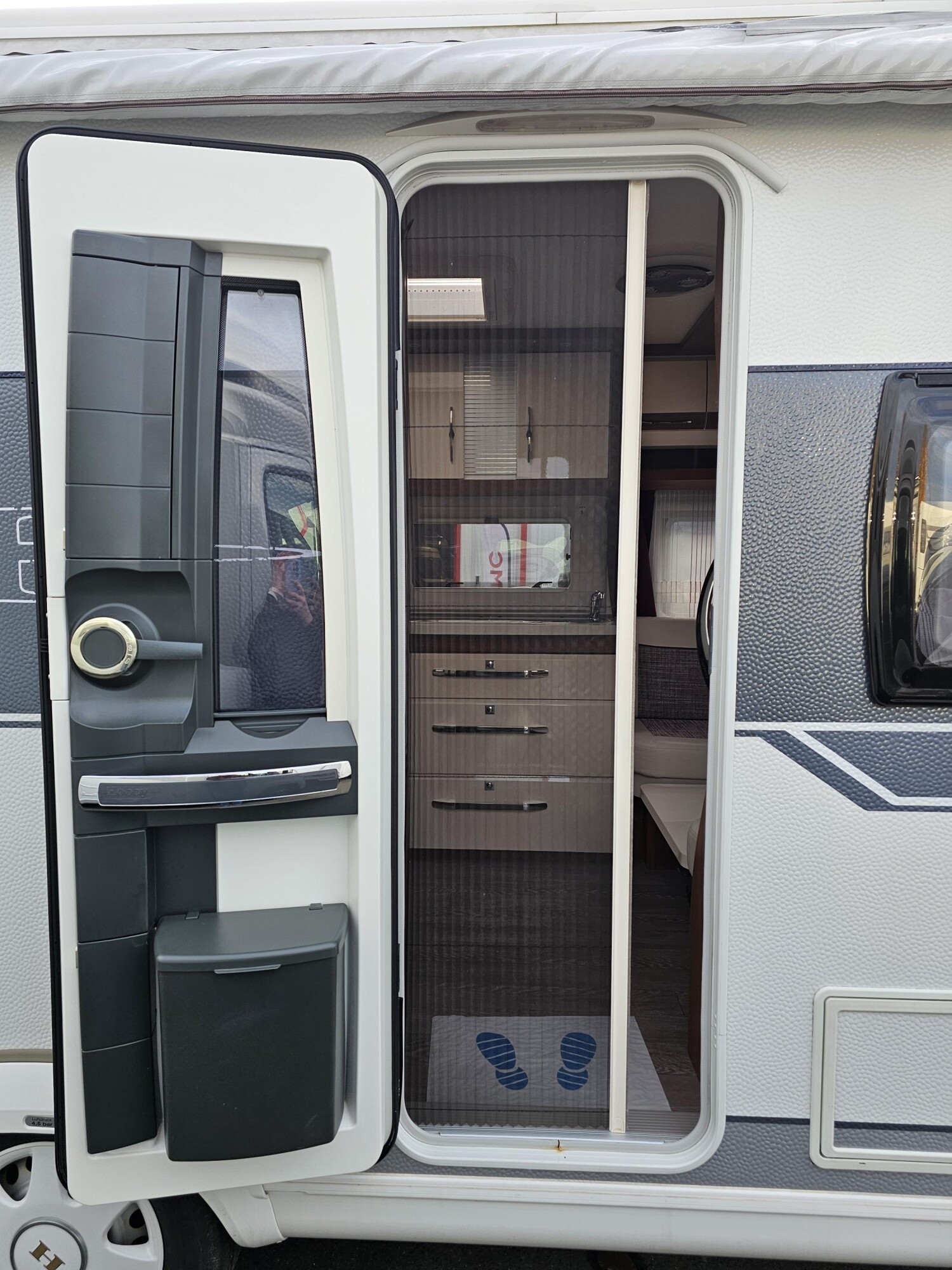 - Eingangstür inkl. Fenster, einem integriertem Mülleimer, Staufächer, Fliegenschutztür und Vorzeltleuchte