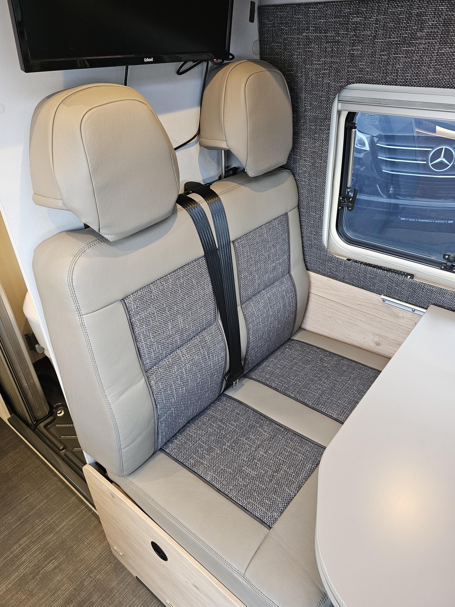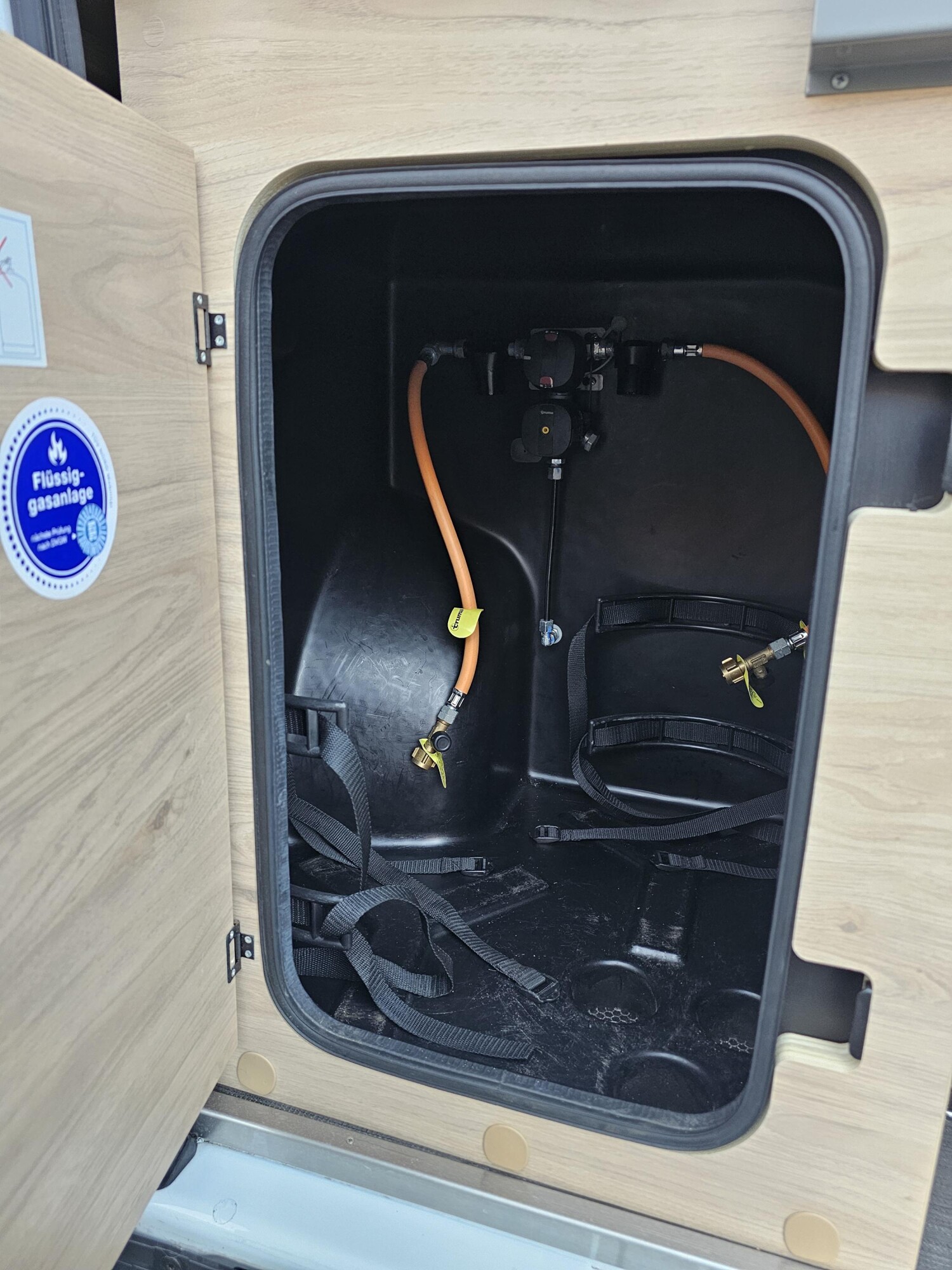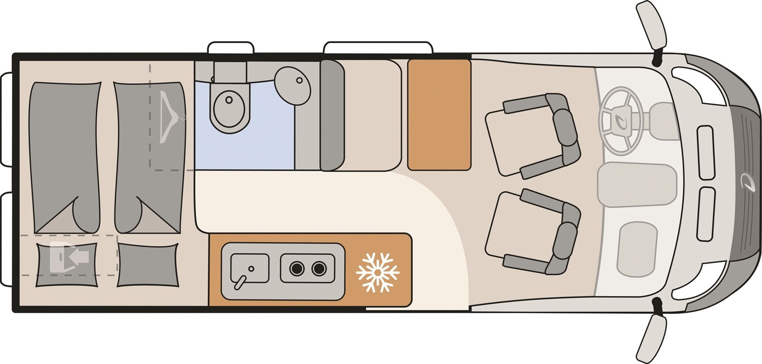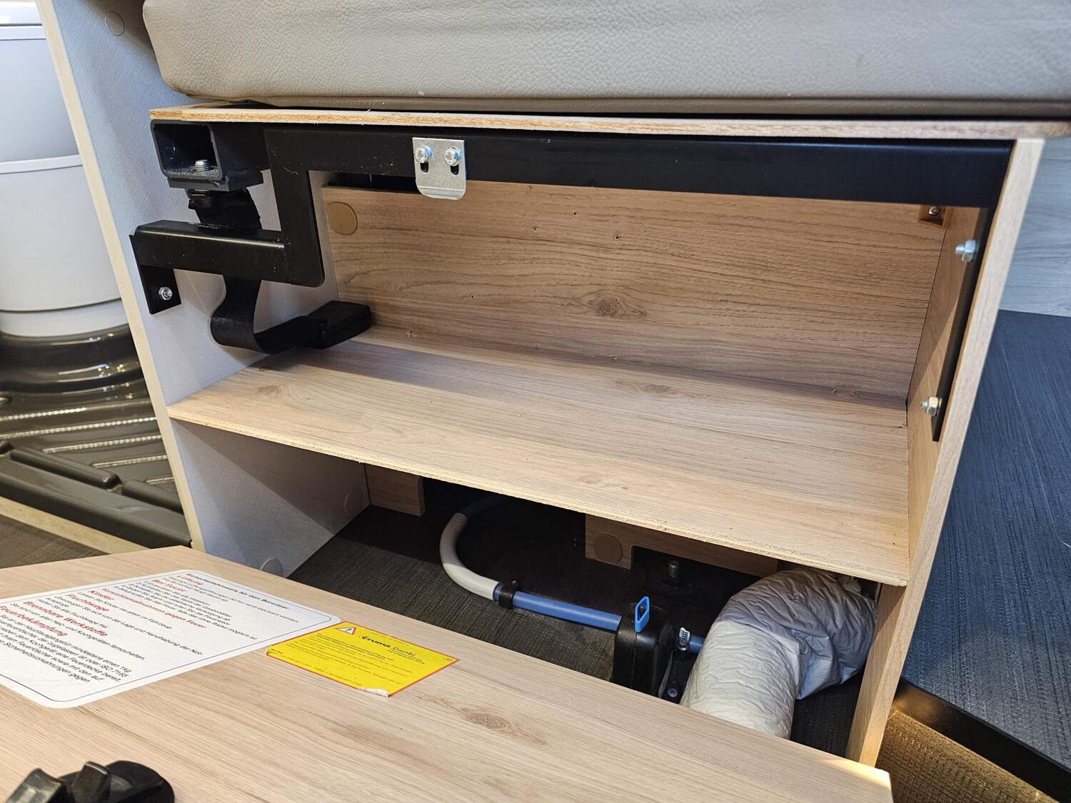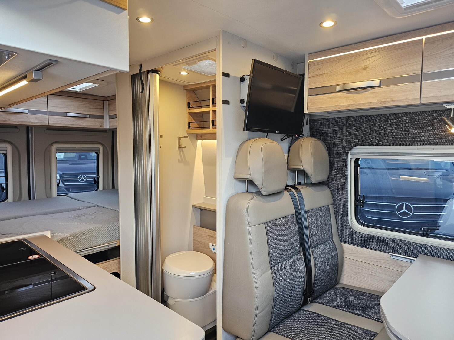 - Nasszelle mit einer Thetford Cassettentoilette, Duschausstattung, Waschbecken, Seitenfenster und einem Stauschrank