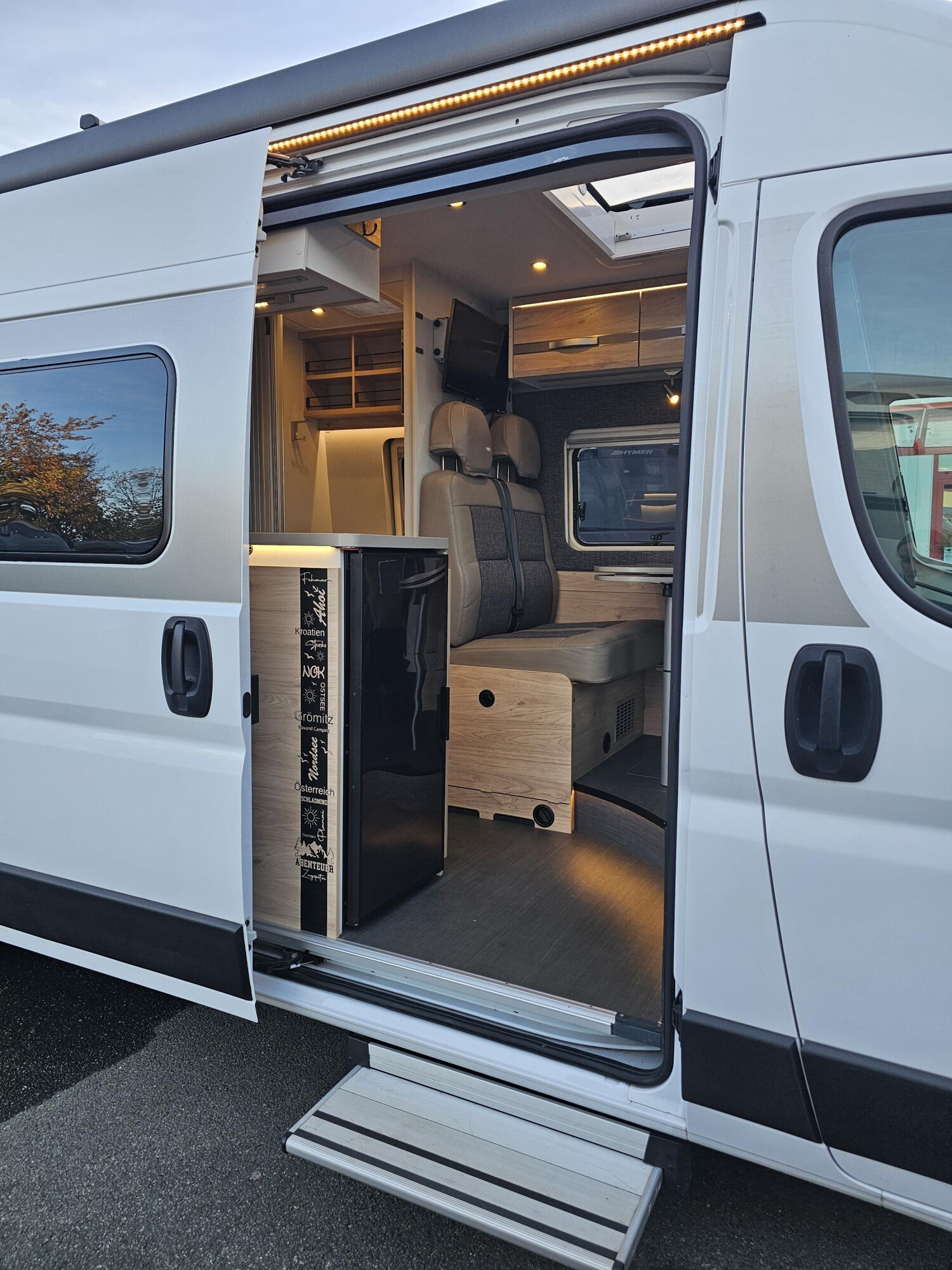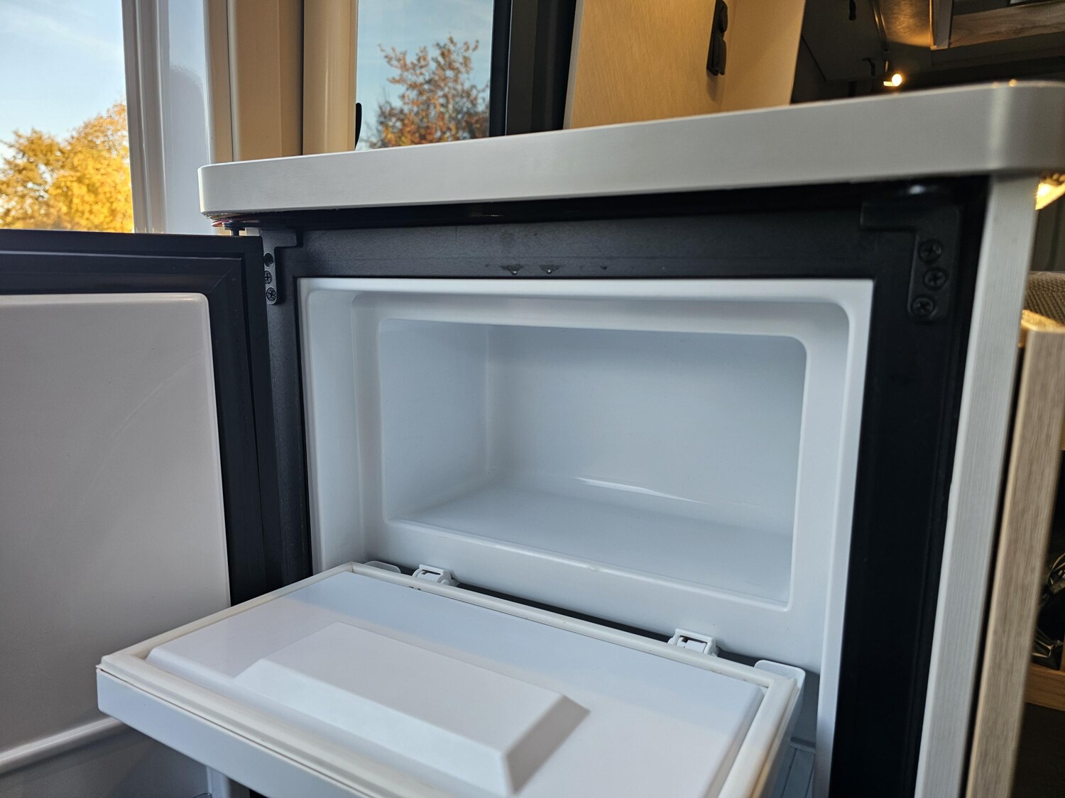 - Küchenzeile mit einem 2 Flammenkocher und einer Spüle inkl. Glasabdeckung, Schubladen und einem Thetford Kühlschrank