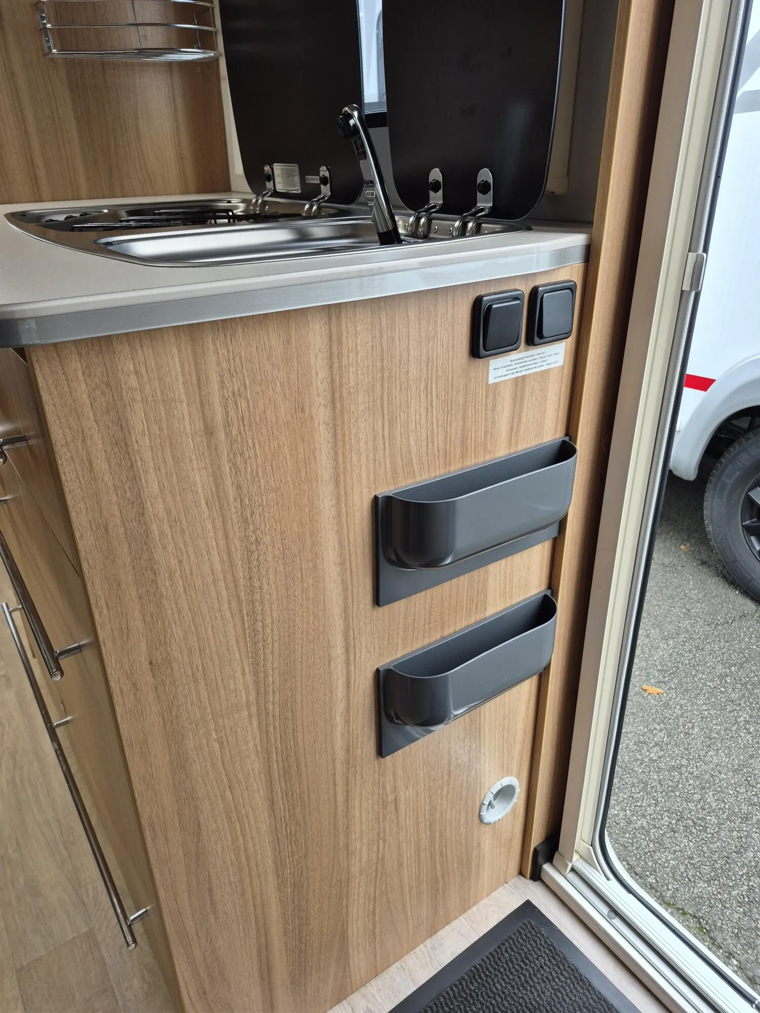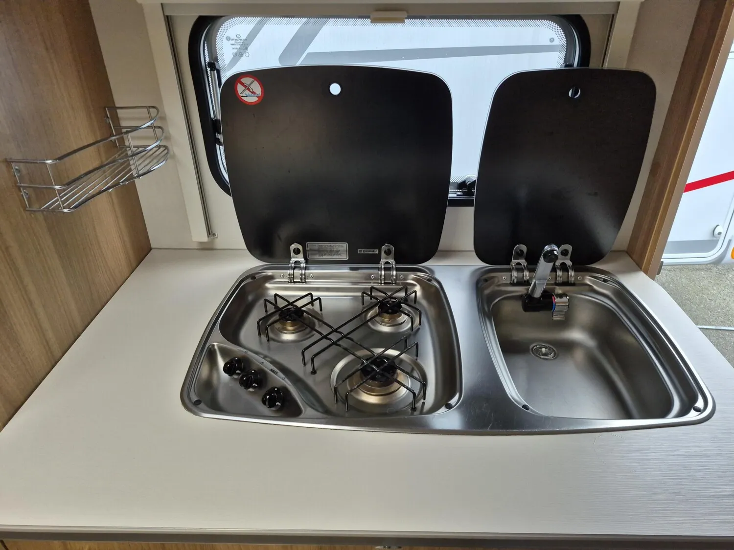 - Küchenzeile mit einem 3-Flammenkocher und einem Spülbecken inkl. Glasabdeckung, einem Schubladen-Kühlschrank (150L isotherm), Besteckschublade und Gewürzregal