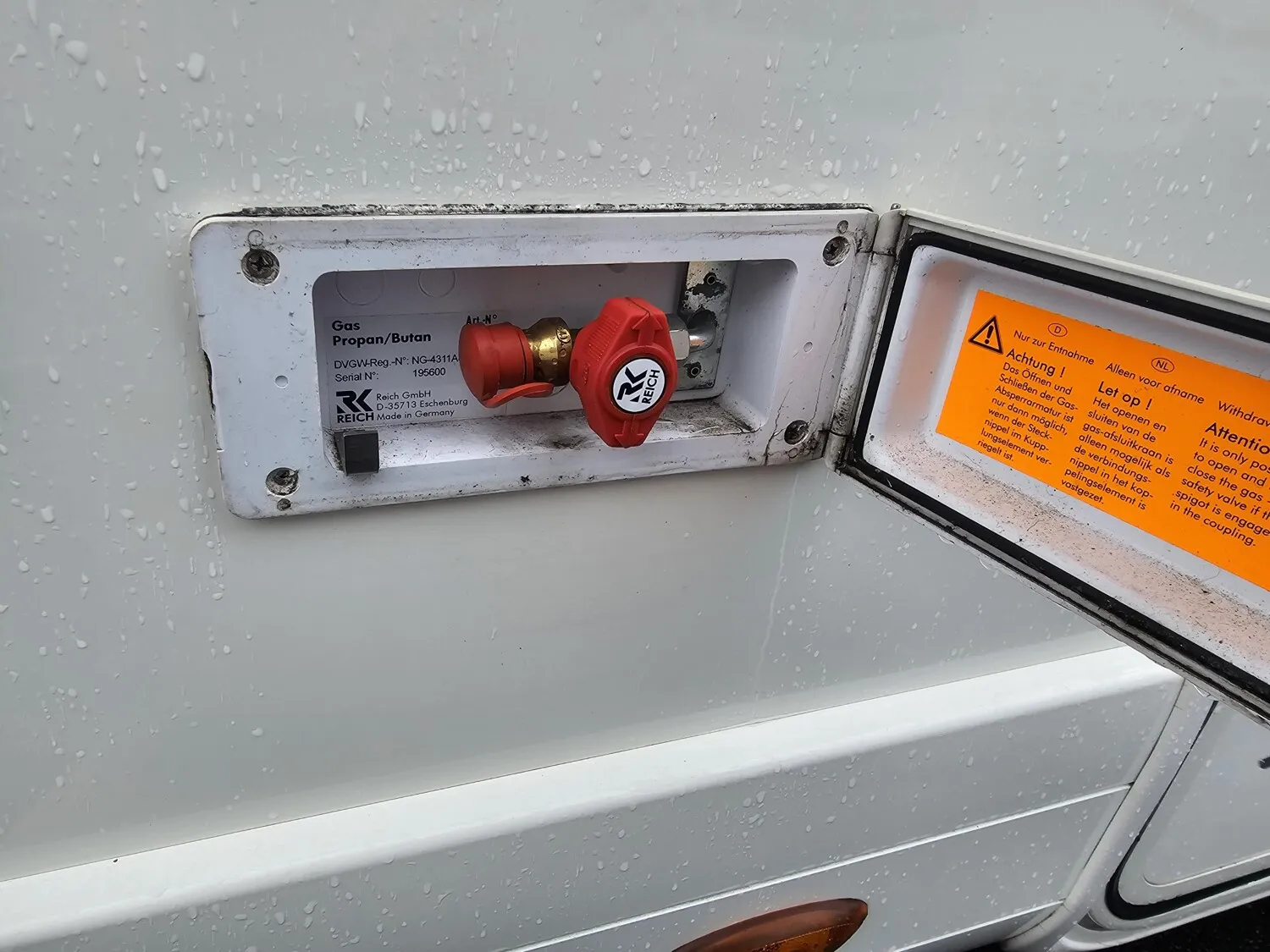 Küchenzeile mit einem 3-Flammenkocher inkl. Glasabdeckung und einer Spüle inkl. Schneidebrettabdeckung, großen Schubladen und einem Dometic Kühlschrank mit sep. Frosterfach