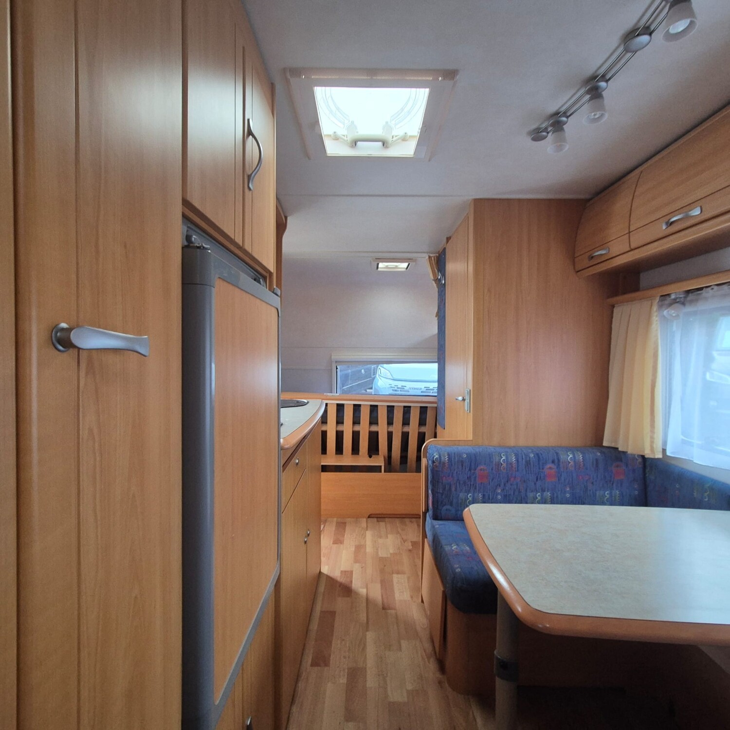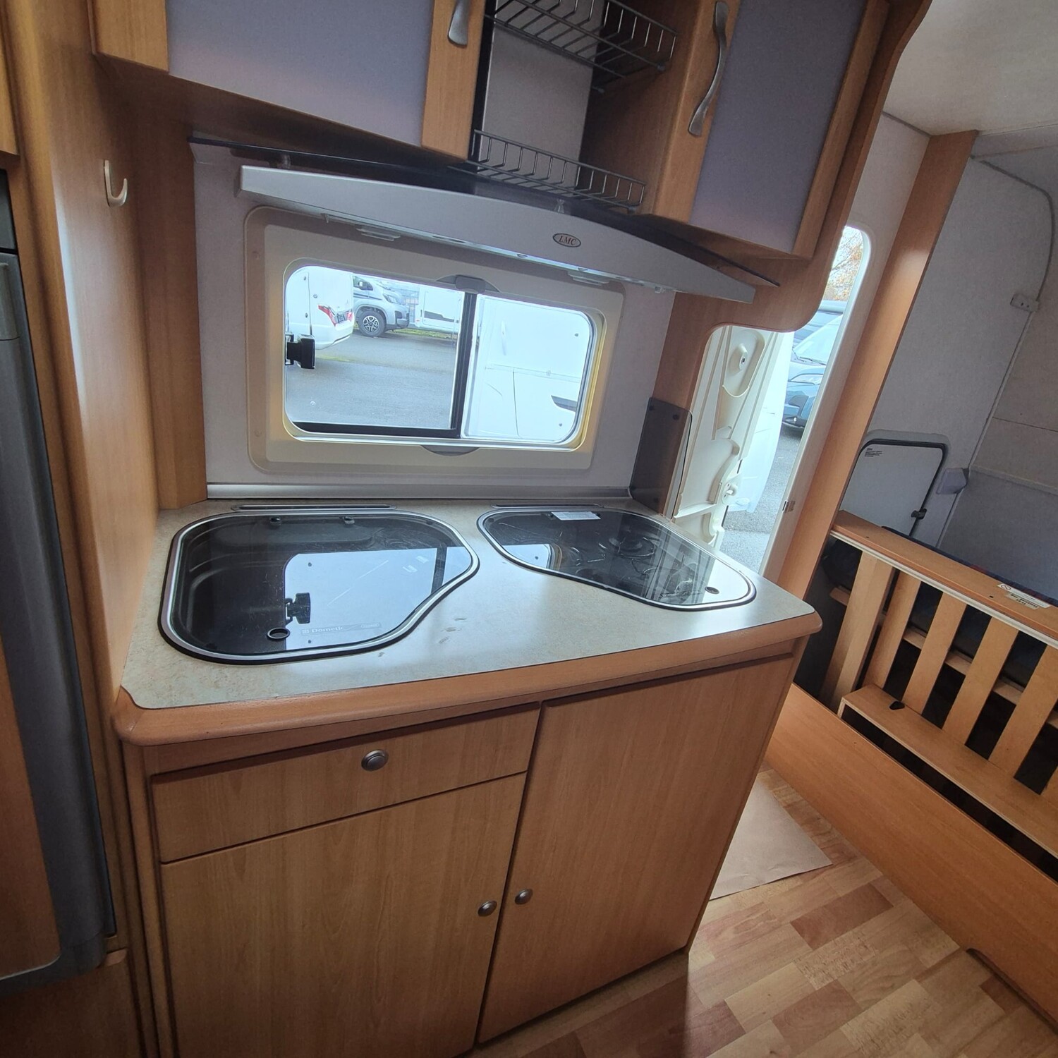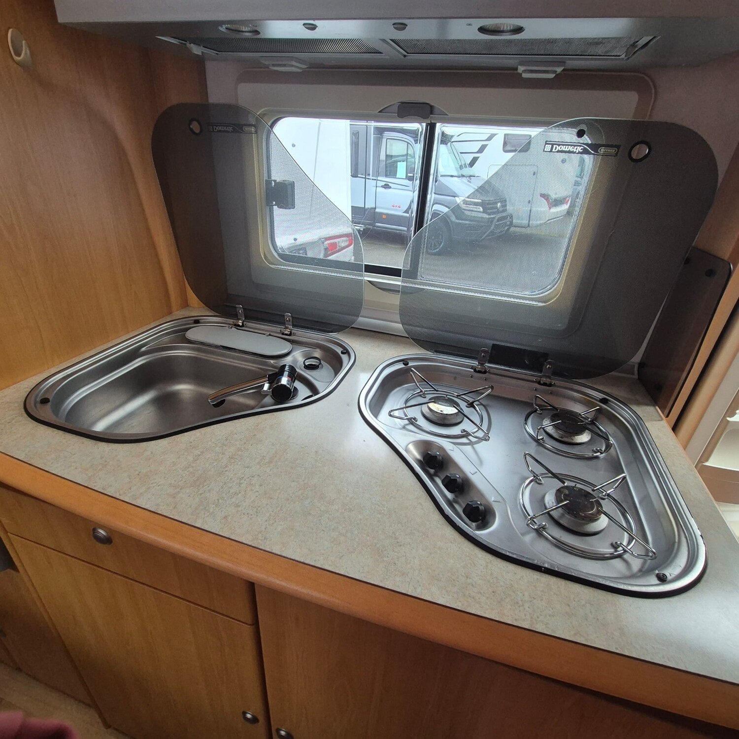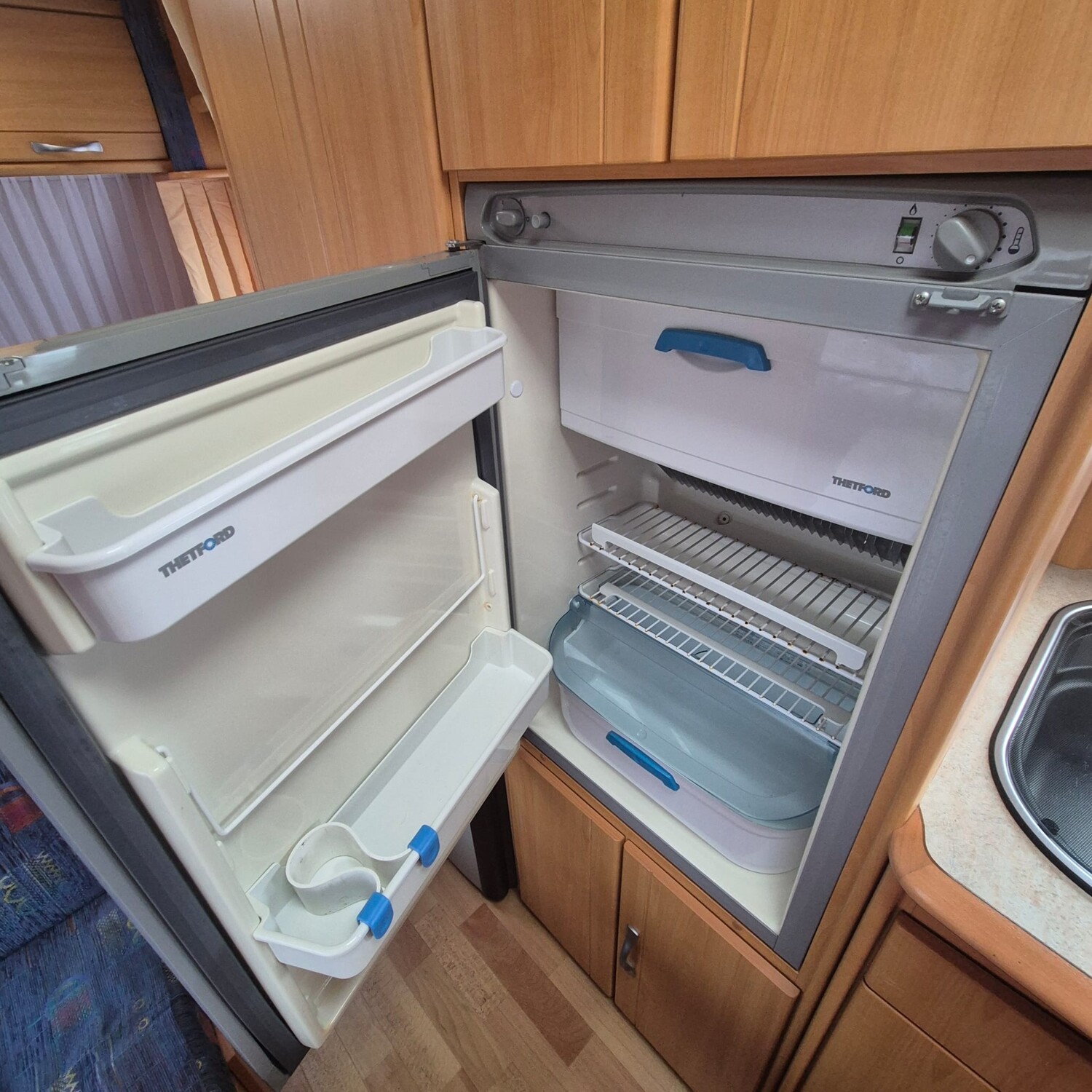 - Küchenzeile mit einem 3 Flammenkocher und einer Spüle mit Glasabdeckung, Stauschränke, einem kleinen Thetford Kühlschrank inkl. Eisfach