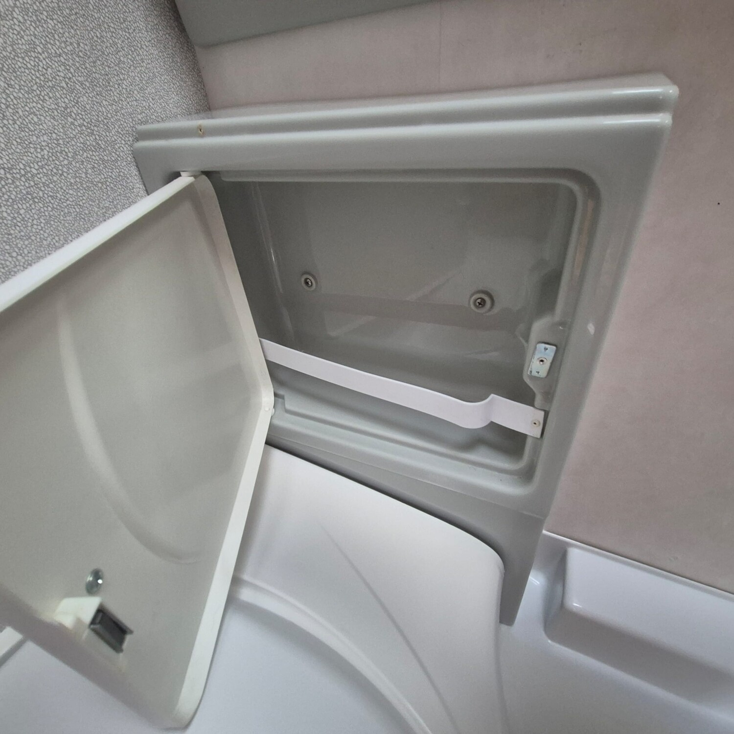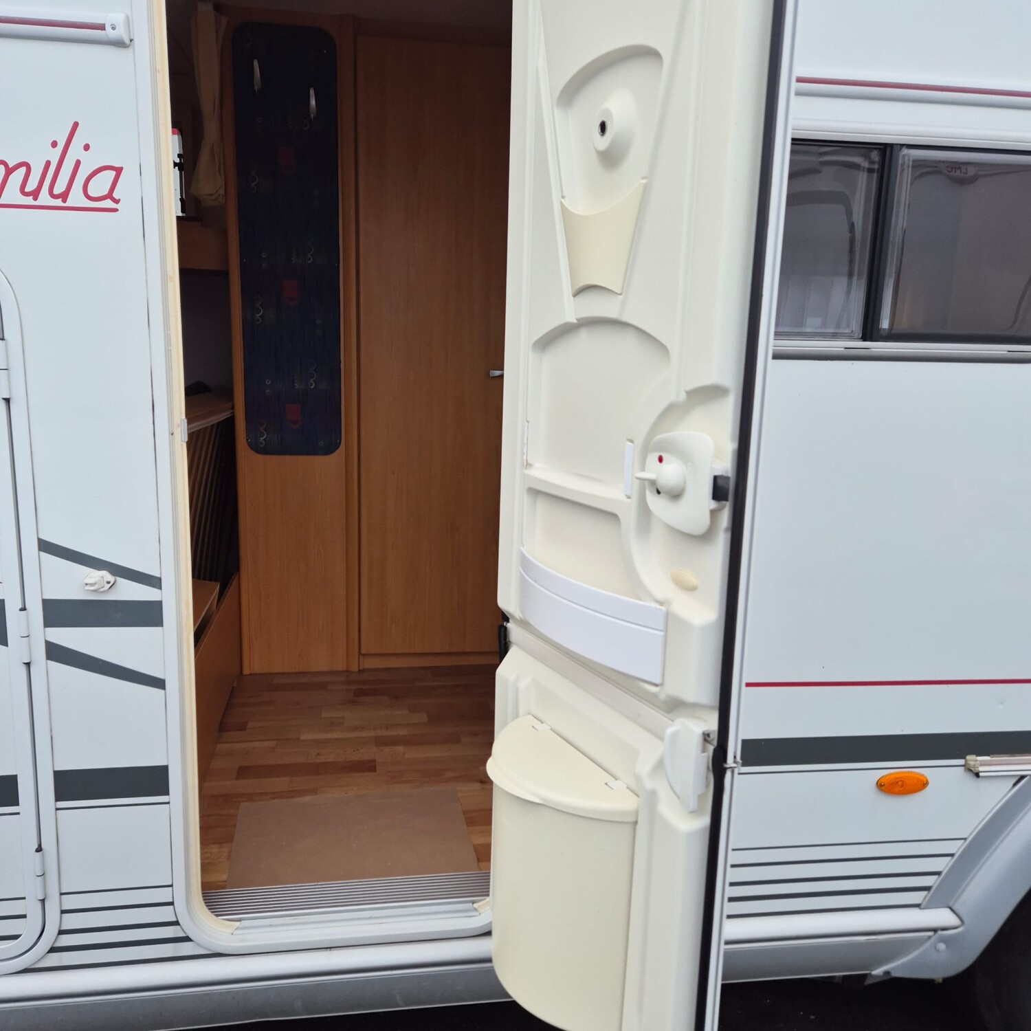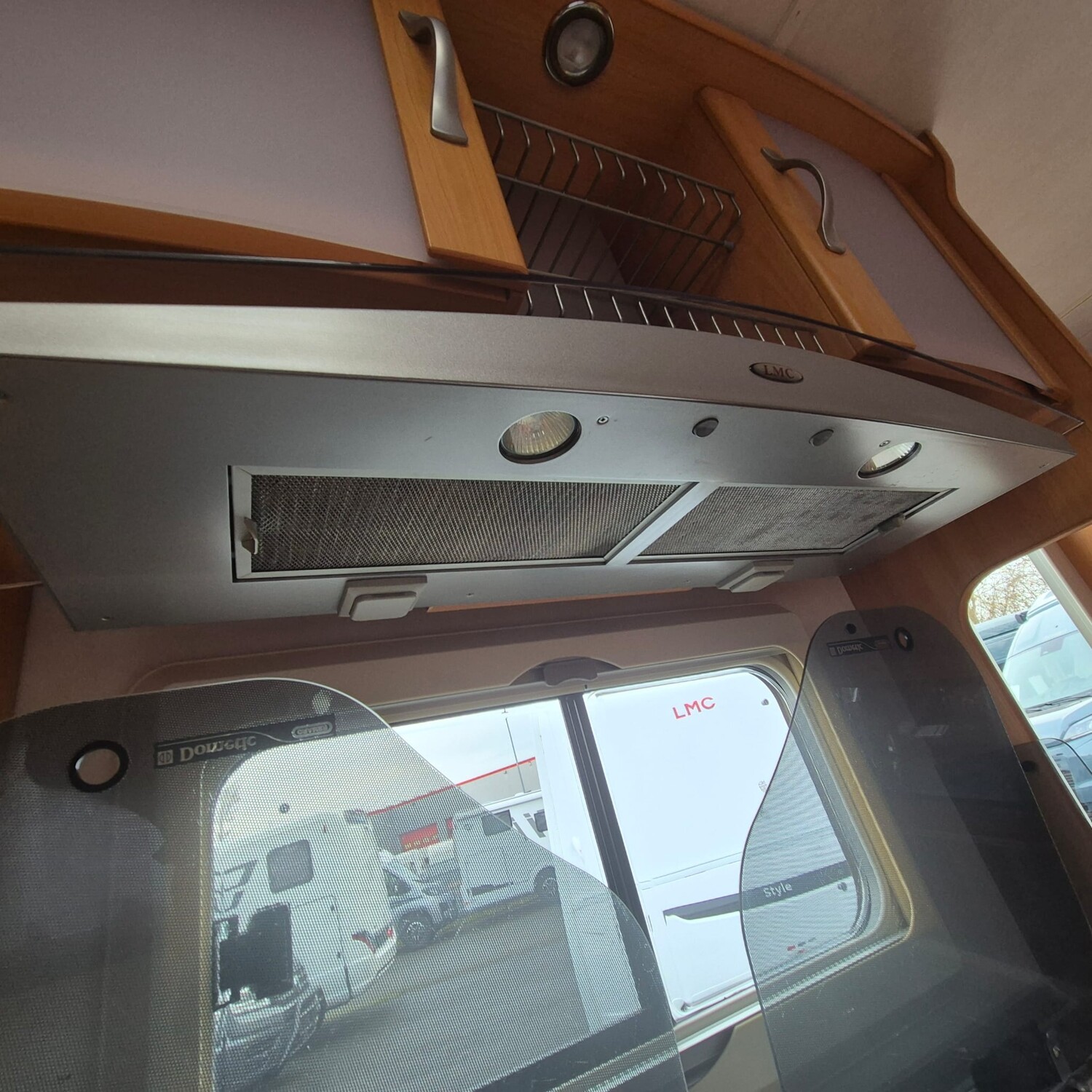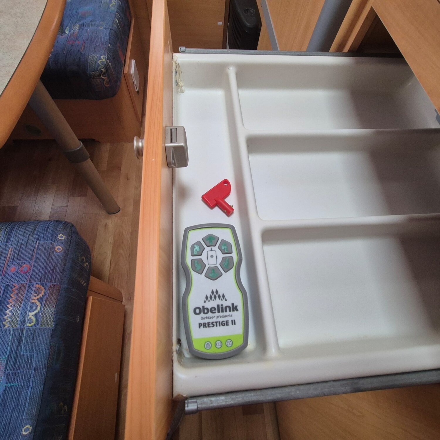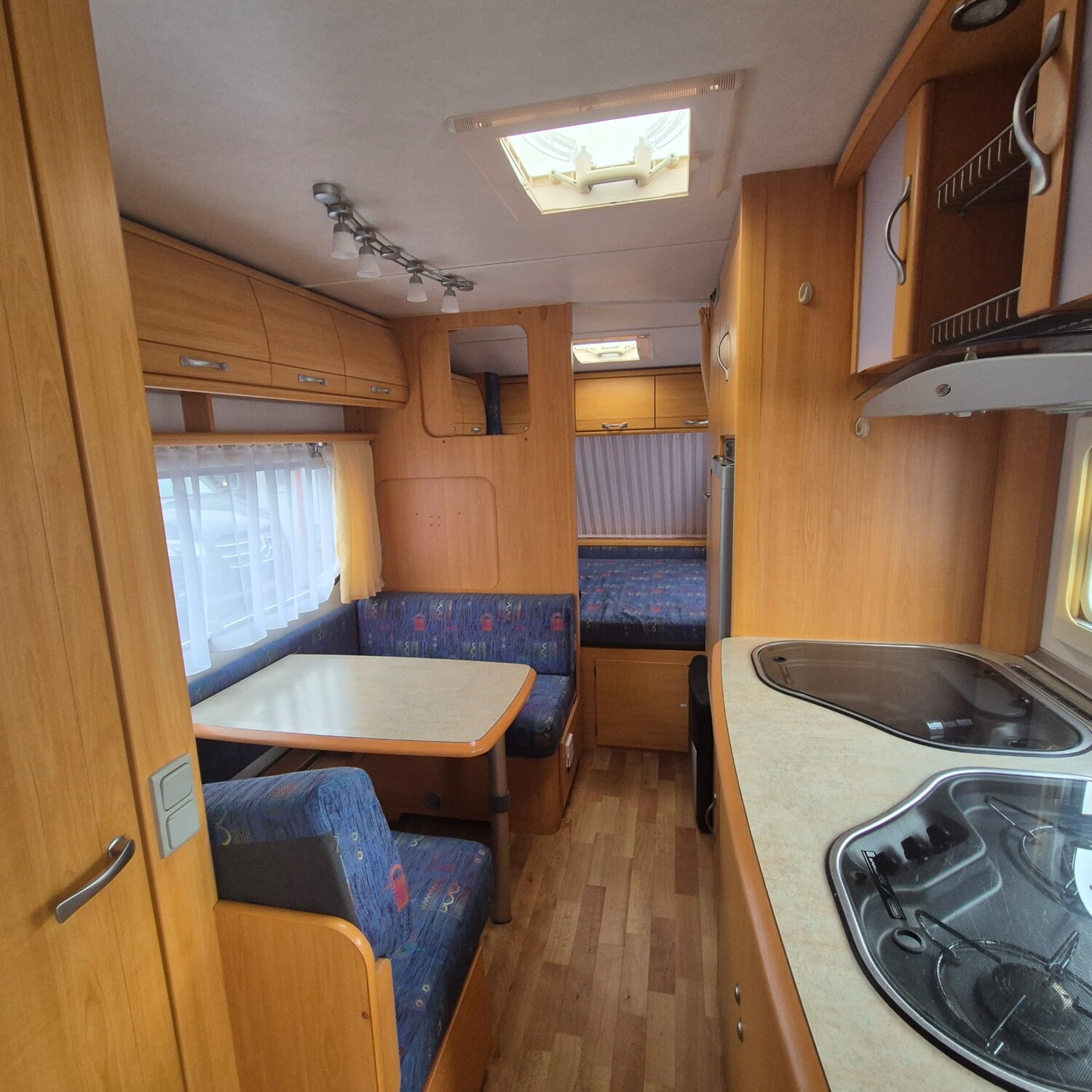 - Küchenzeile mit einem 3 Flammenkocher und einer Spüle mit Glasabdeckung, Stauschränke, einem kleinen Thetford Kühlschrank inkl. Eisfach