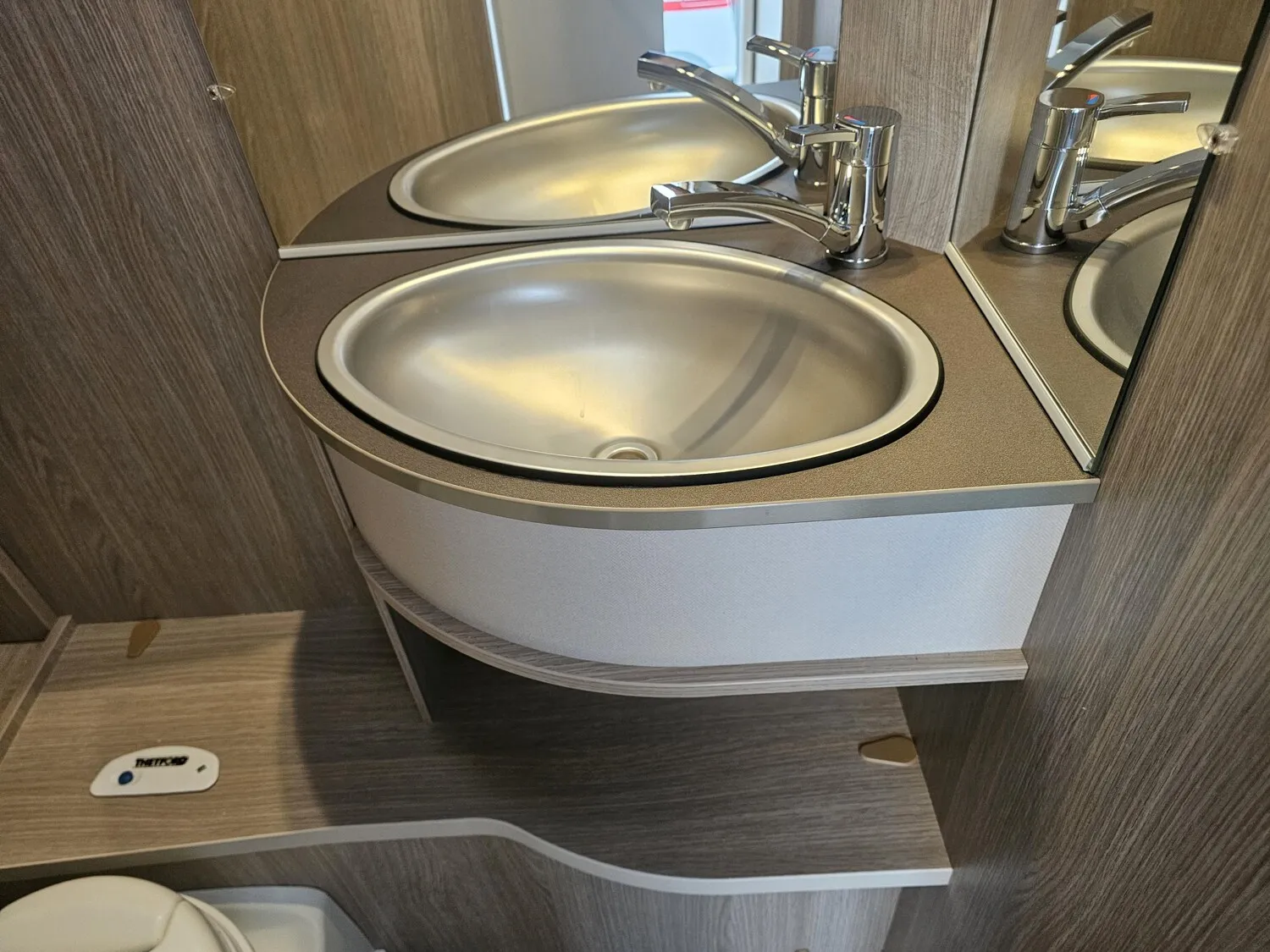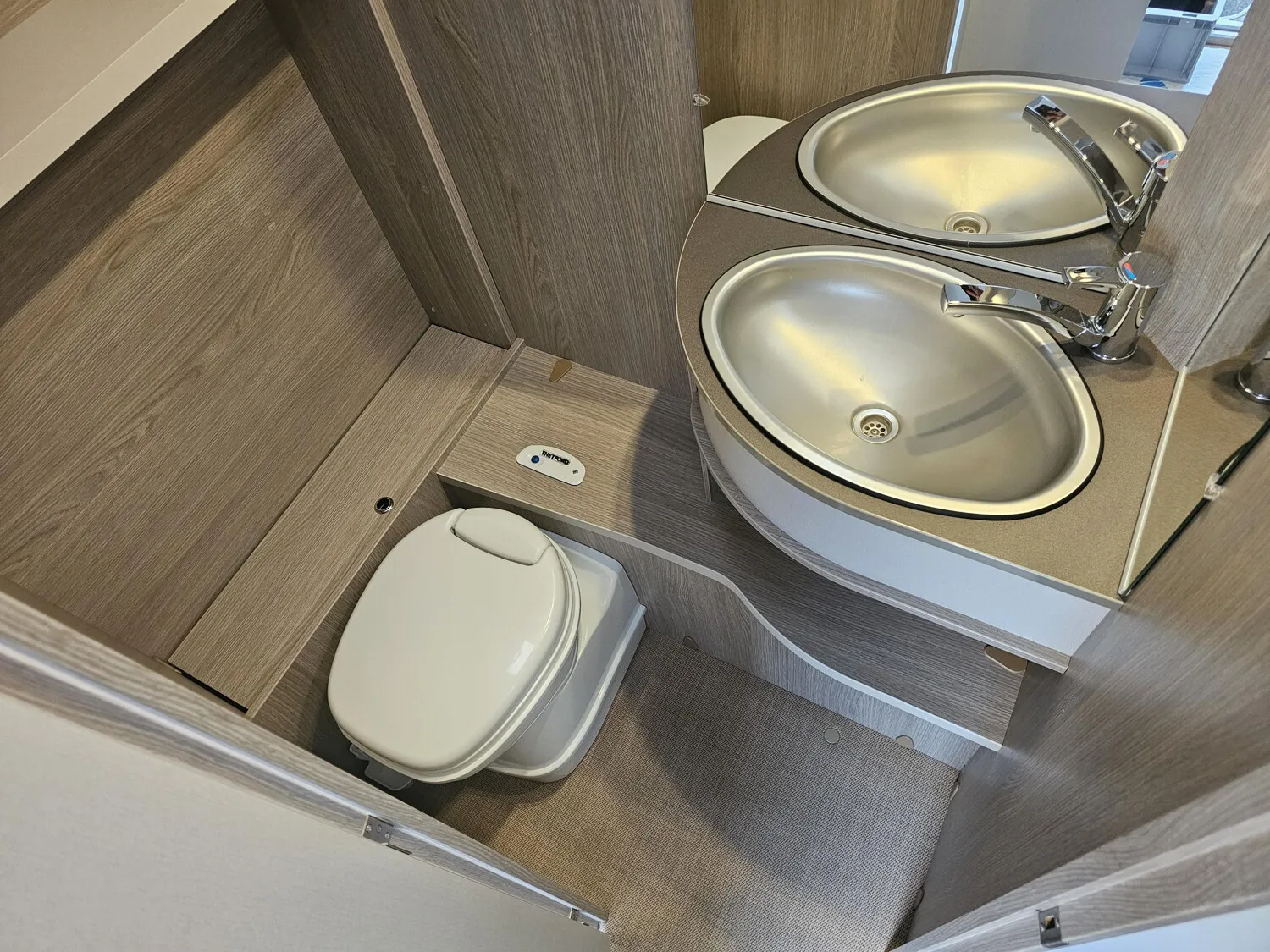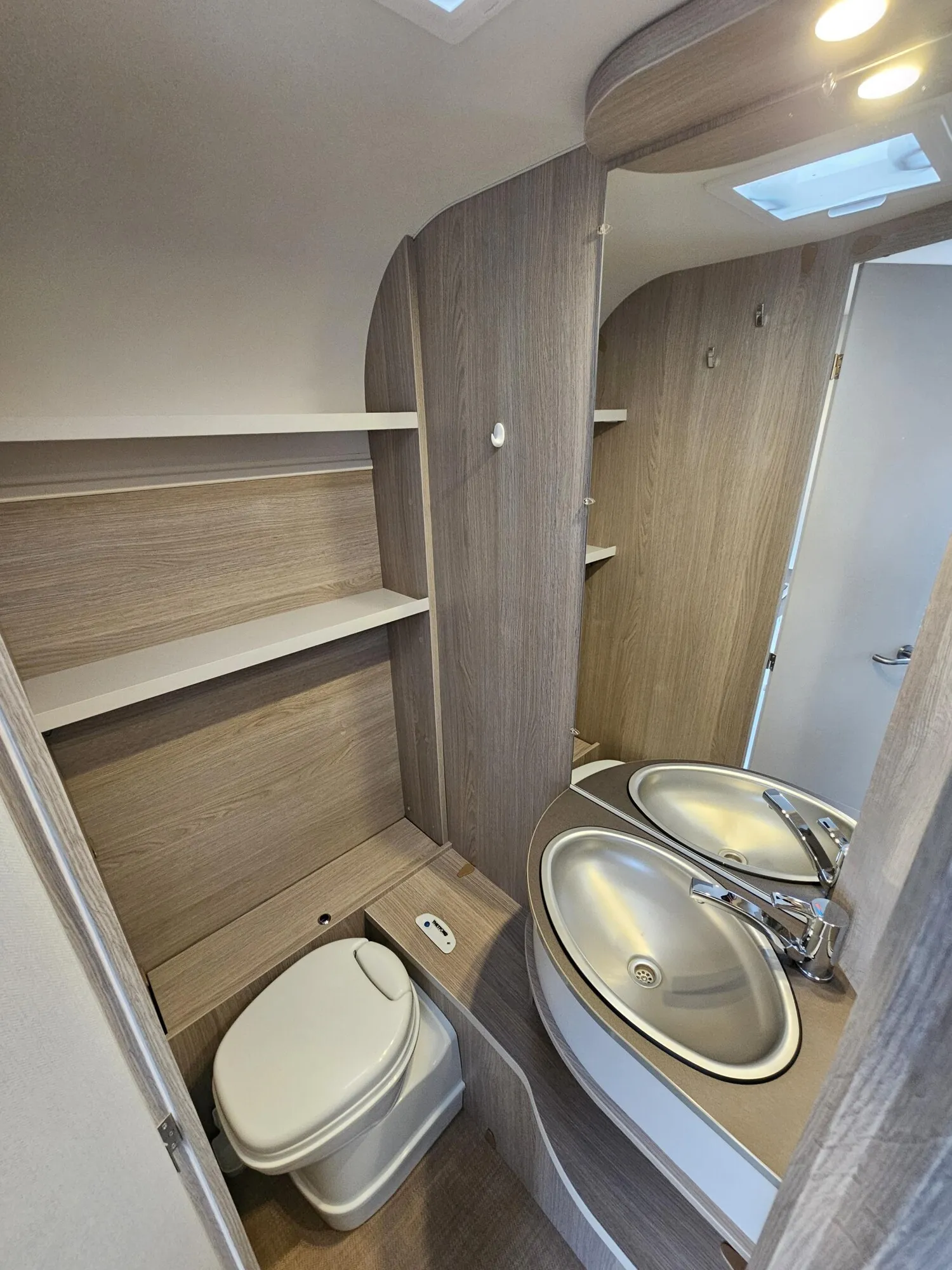 - Nasszelle mit einer Cassettentoilette, Waschbecken, Spiegel und offene Staufächer