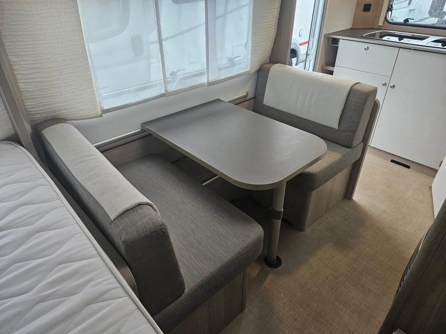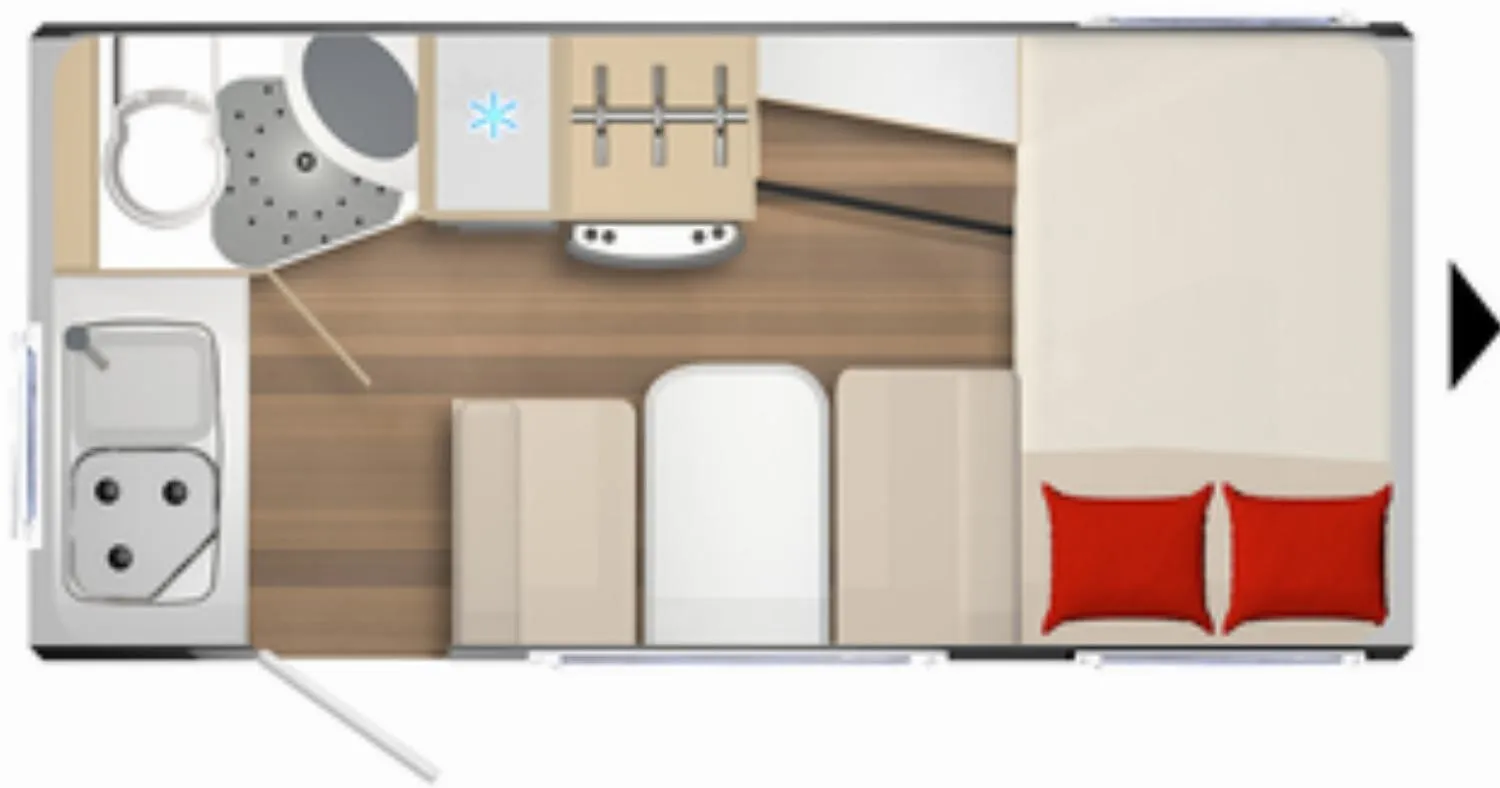 - Küchenzeile mit einem 3-Flammenkocher und Spüle inkl. Glasabdeckung, Besteckschublade, Staufächer und Dachstauschrank