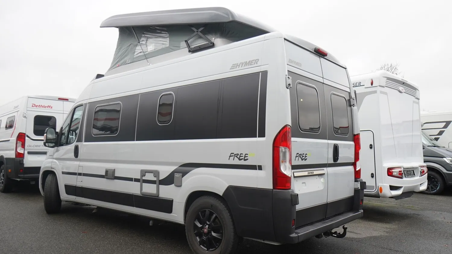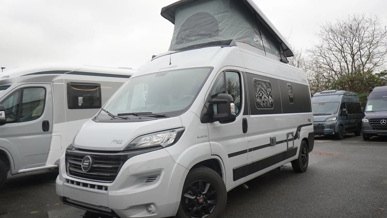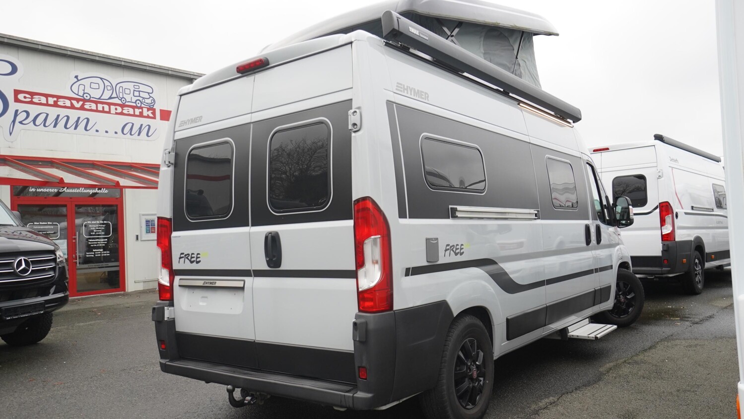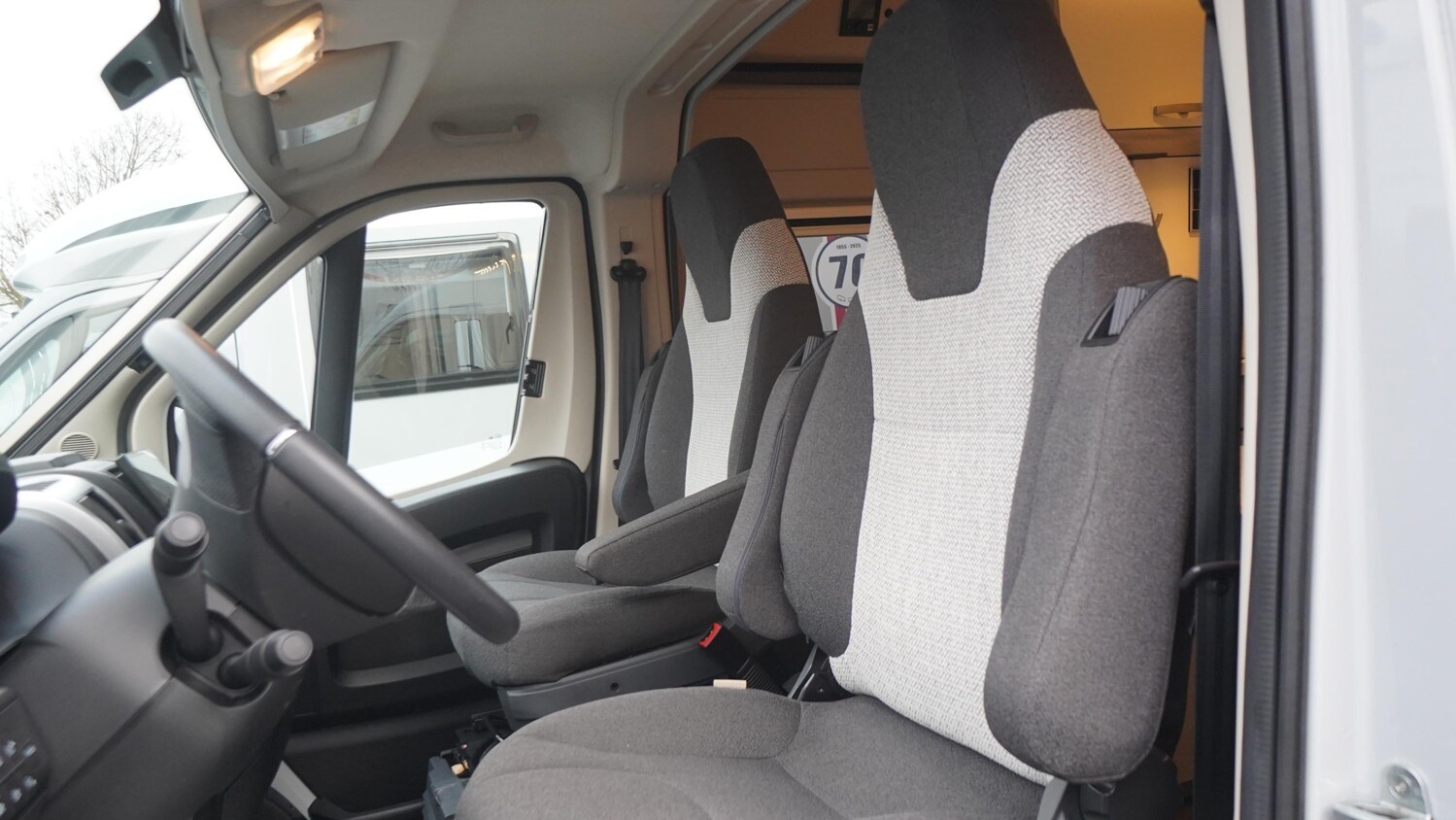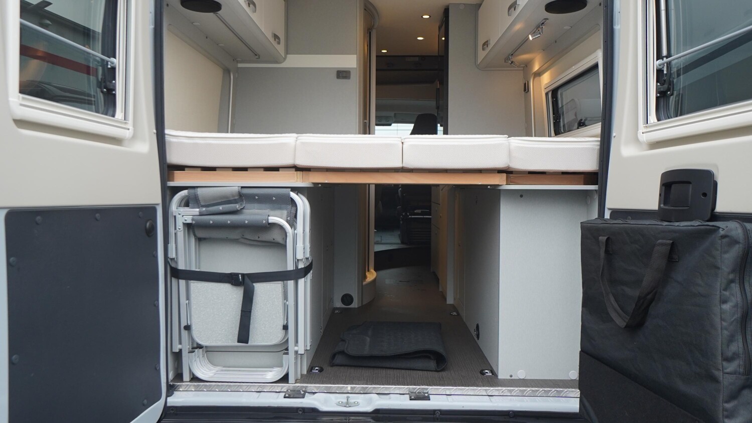 - Doppelbett im Heck mit Dachstauschränken und einem Seitenfenster rechts