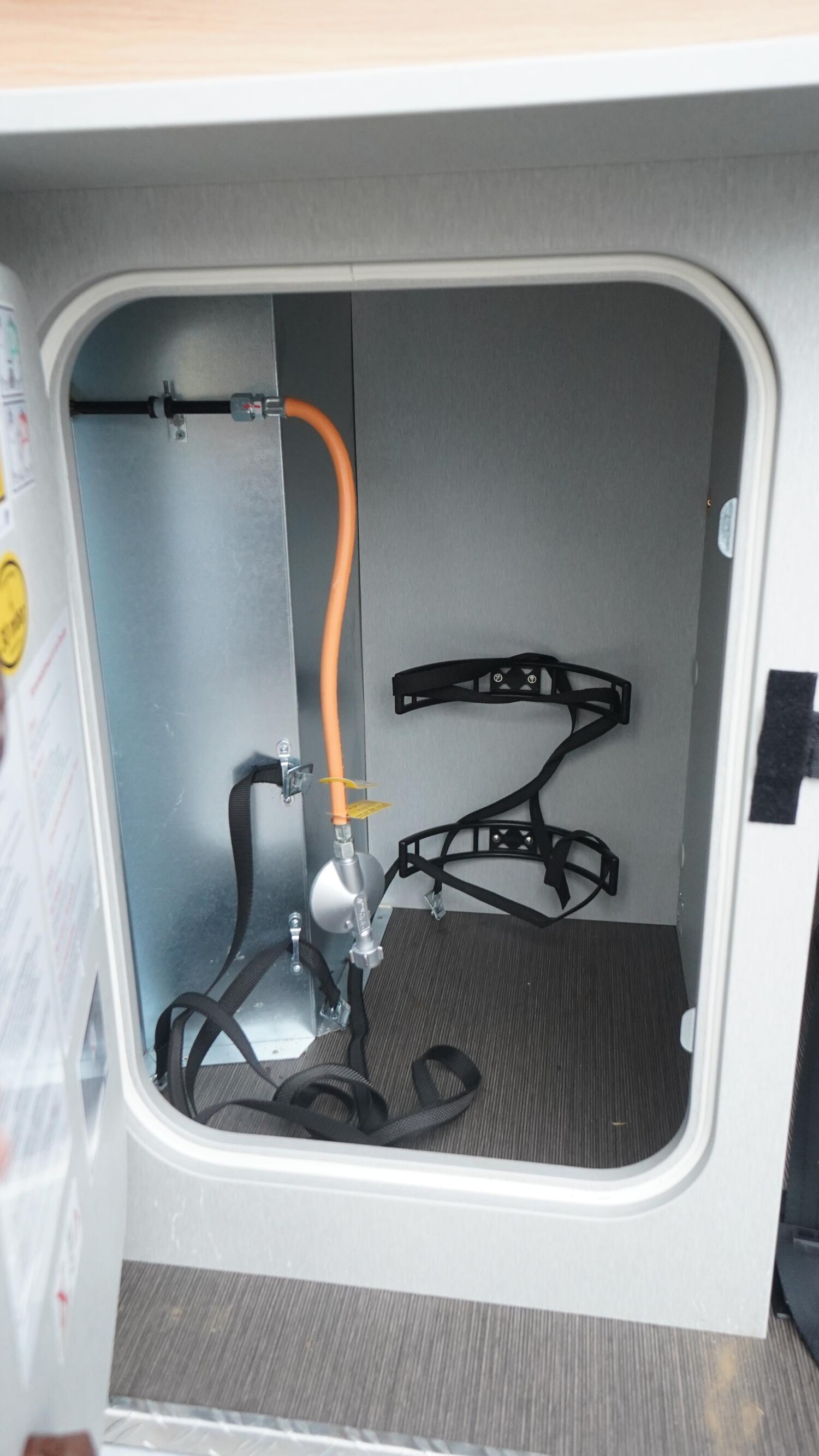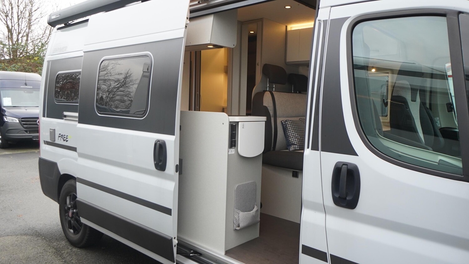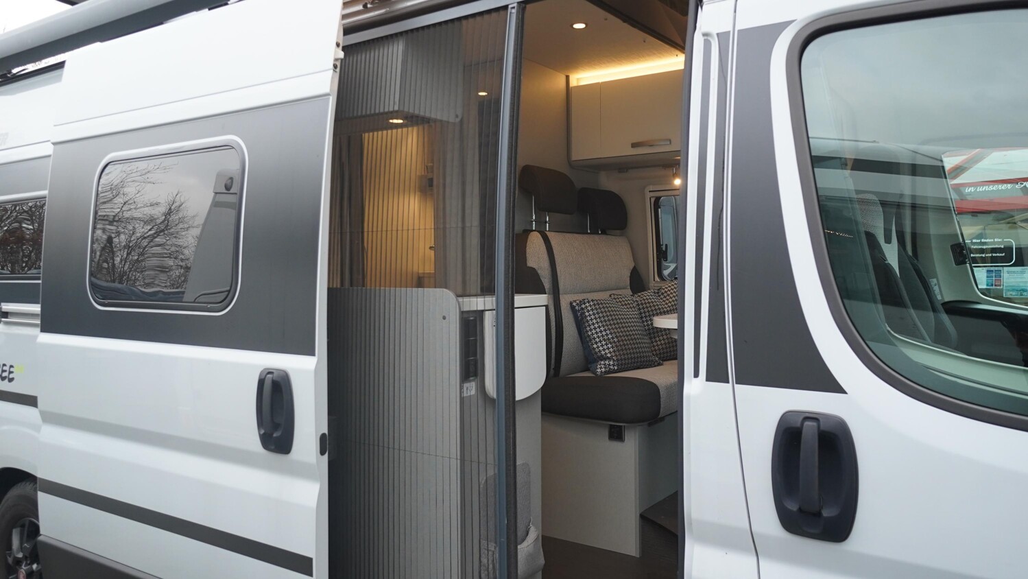 - Schiebetür mit elektrischen Trittstufe, LED-Lichtband und Fliegenschutztür